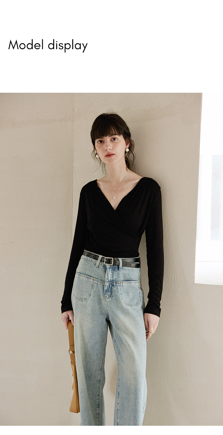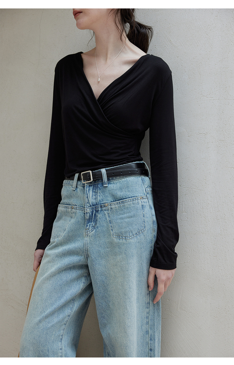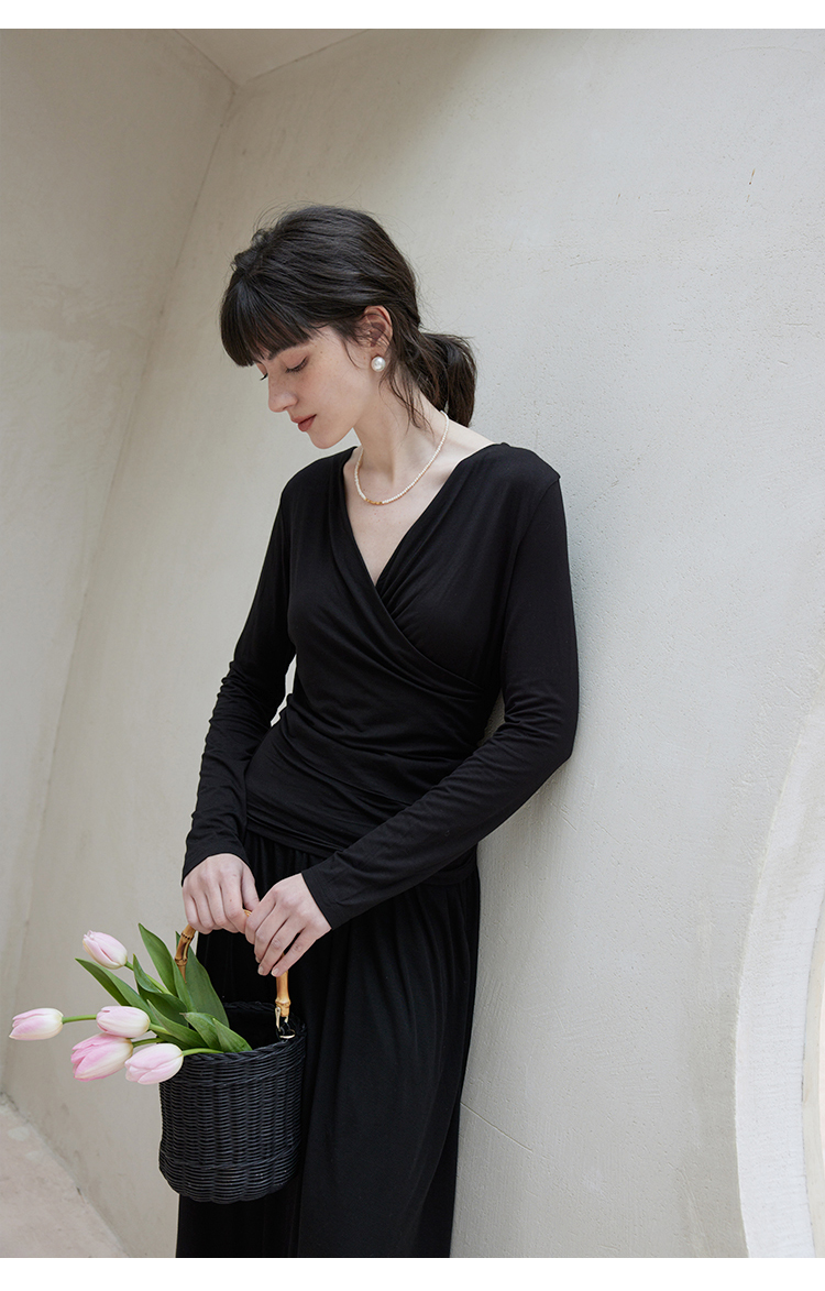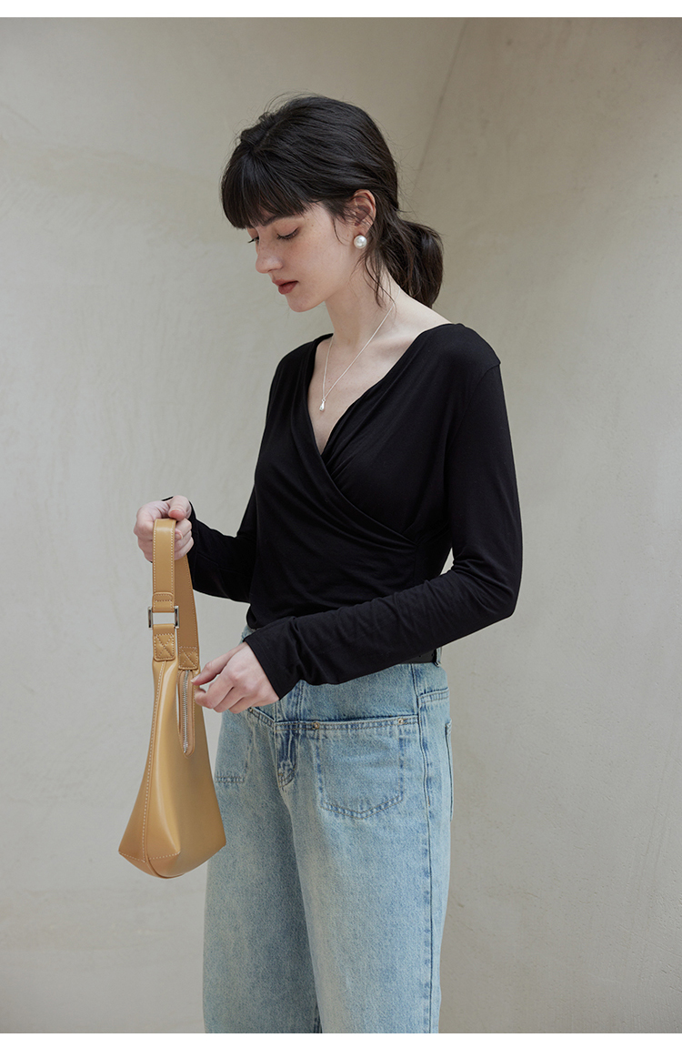 HeyDress长袖T恤女春季修身黑色内搭打底衫交叉V领设计感别致上衣