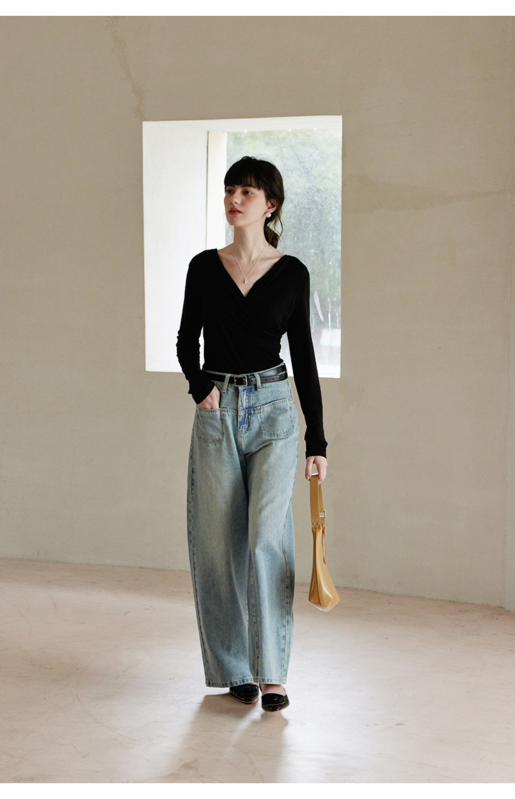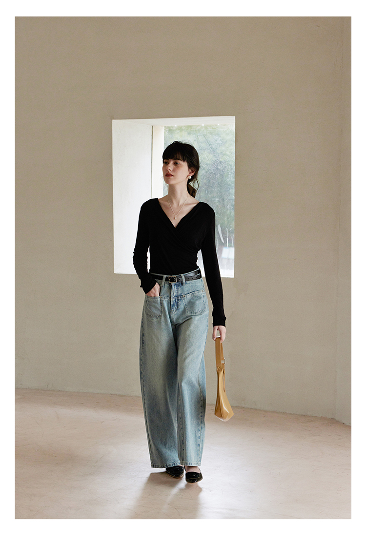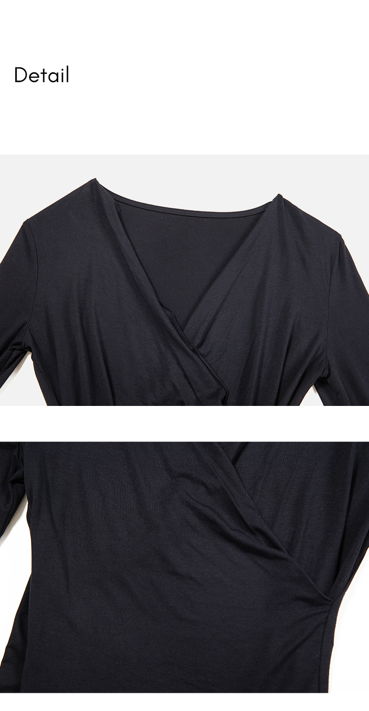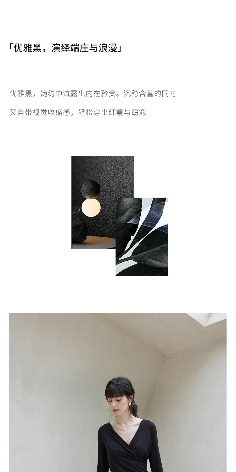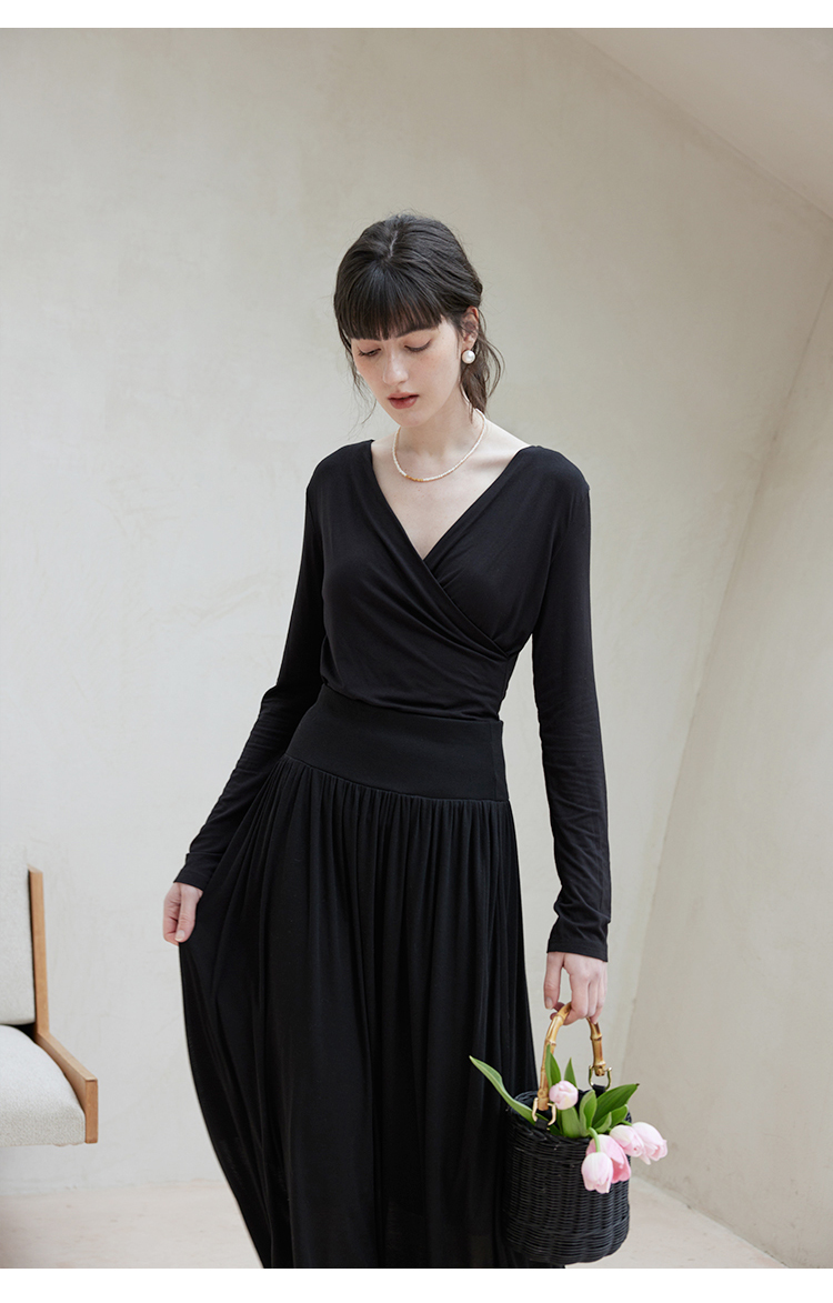 HeyDress长袖T恤女春季修身黑色内搭打底衫交叉V领设计感别致上衣