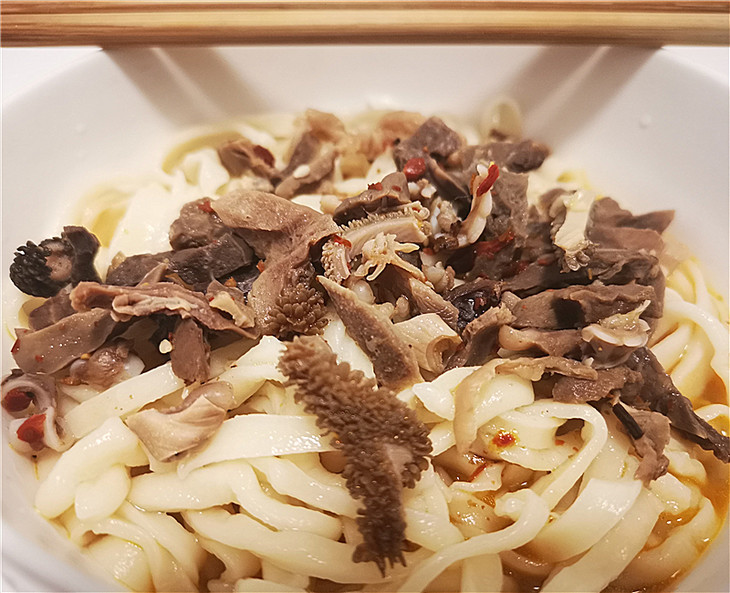 (上图)为了复检我们随意抽检了两袋,让单位食堂的曹老师给简单做了一次羊杂面,面条煮熟过水,放少量羊杂锅里加水加少许盐煮十多分钟,然后浇汁到凉面上,那个味道真香啊,真正的原汁原香,不过感觉羊肚有点硬,这是不用火碱处理健康羊肚的特征,感觉多煮一会羊肚的口感会更好。