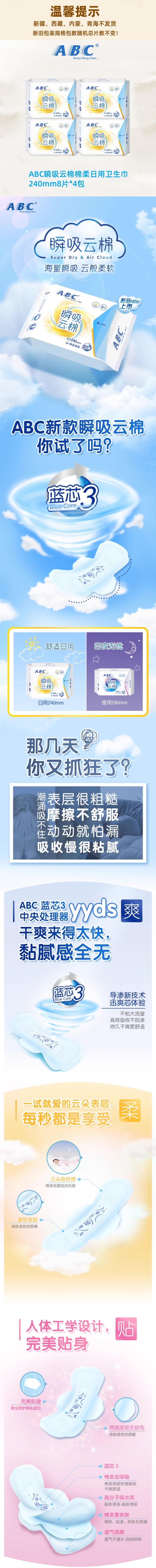 ABC 瞬吸云棉棉柔日用卫生巾240mm8片*4包 SX2404B