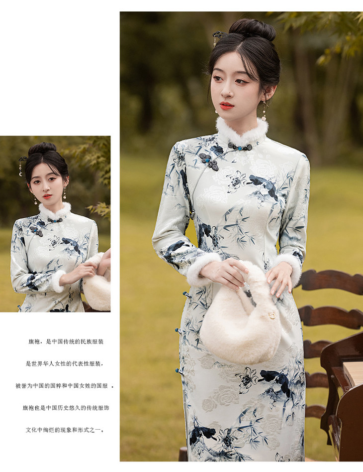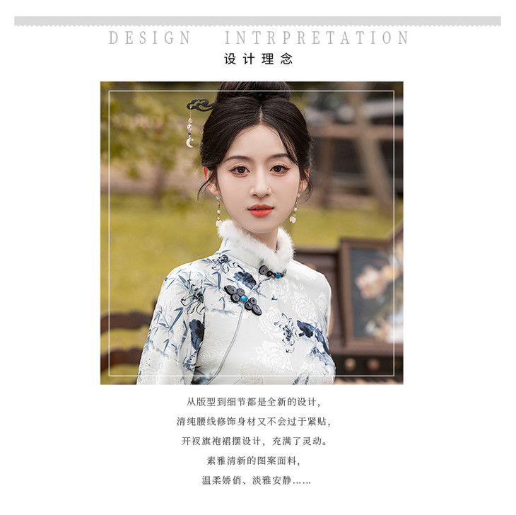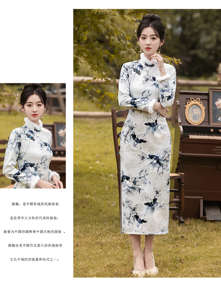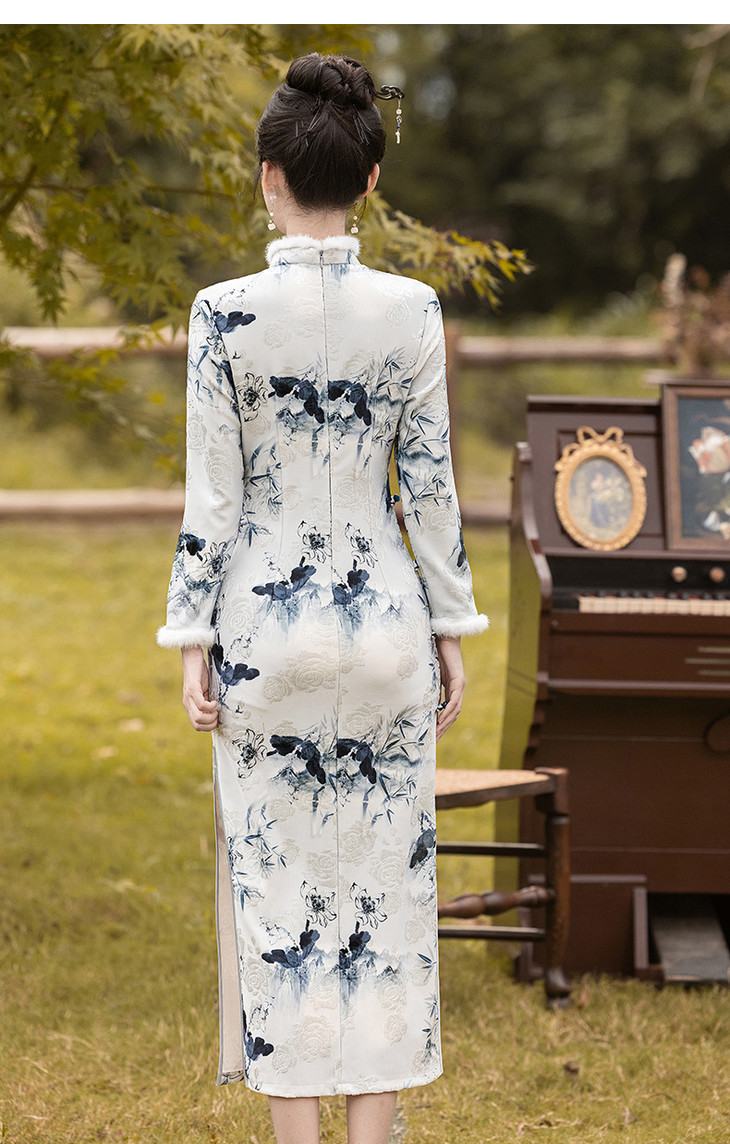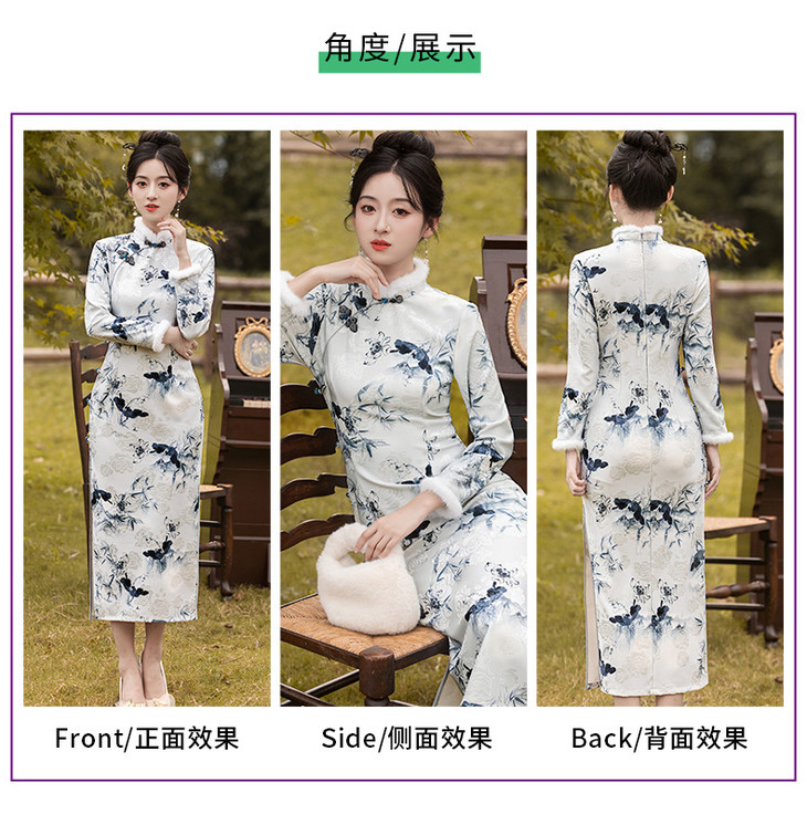 新中式国风水墨花,植绒加厚复古气质显瘦旗袍MLS7087