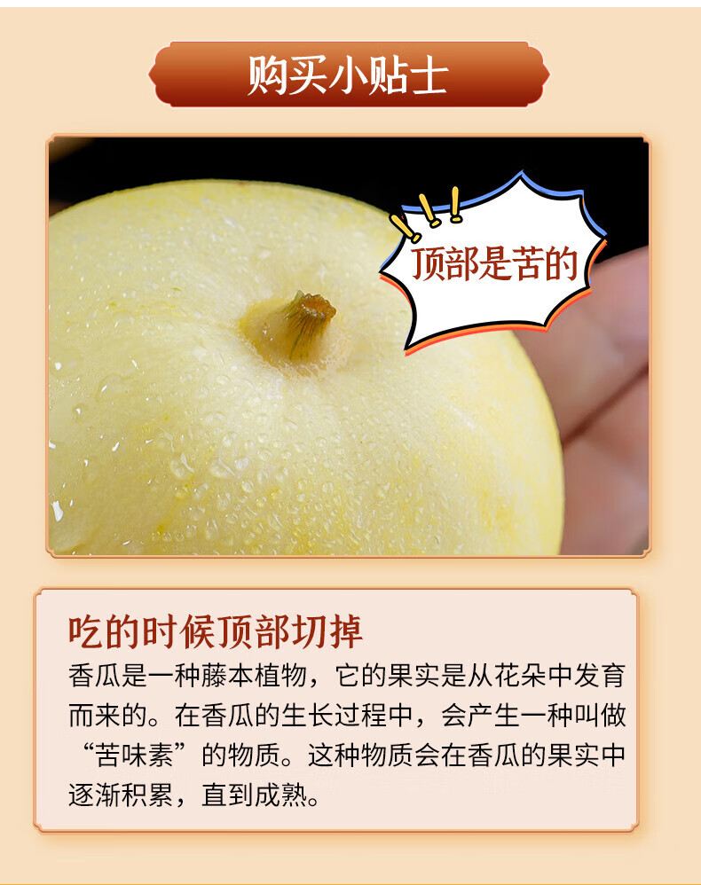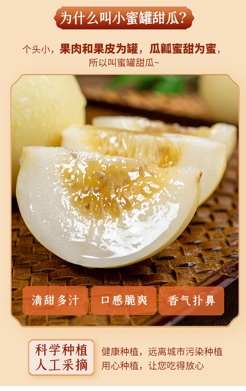 【品名】山东临沂小蜜蜂蜜罐甜瓜 【规格】净重3-4.5斤装 【供货周期】预计到6月底 【储存方法】常温或冷藏保存 【产地】山东临沂 【发货地】山东临沂 【发货快递】中通 【不发货区域】新疆,西藏,青海,内蒙古,宁夏,甘肃,海南,港澳台地区不发 【补邮费地区】北京,上海+1/单 【发货时效】48小时,节假日顺延 【食用指南】 瓜蒂部位会有点发苦属于正常现象,是由于瓜蒂处营养元素聚集所致,不影响食用想分食的小伙伴,吃之前可先将瓜蒂部位切除,以免影响口感体验~ |