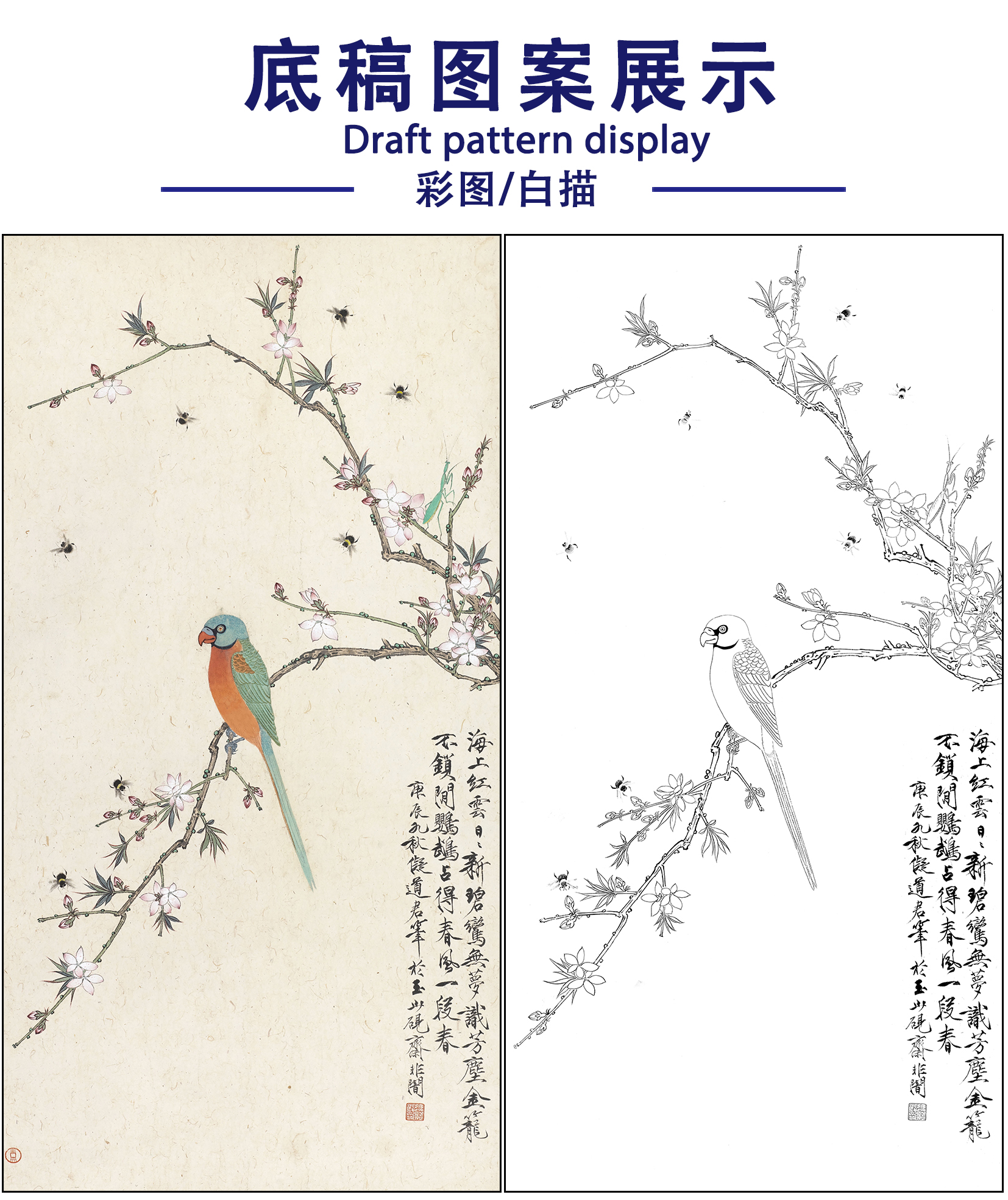 工笔画白描底稿于非闇花鸟《鹦哥报春》临摹勾线高清打印稿FA75