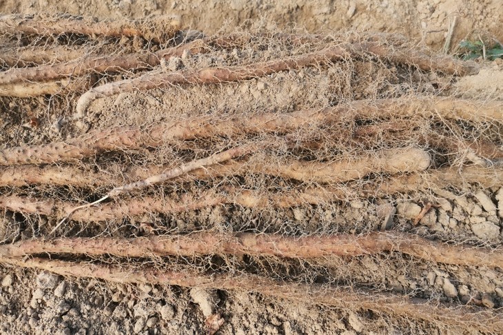 10月将成熟的红薯经过清洗、磨浆、过滤、沉淀、晾晒制作成红薯淀粉,等到11月中下旬将经过霜降的铁棍山药挖出来后,往红薯淀粉中加入5%的山药,加工制成粉皮,加工过程中不添加明矾、食用胶等添加剂。
