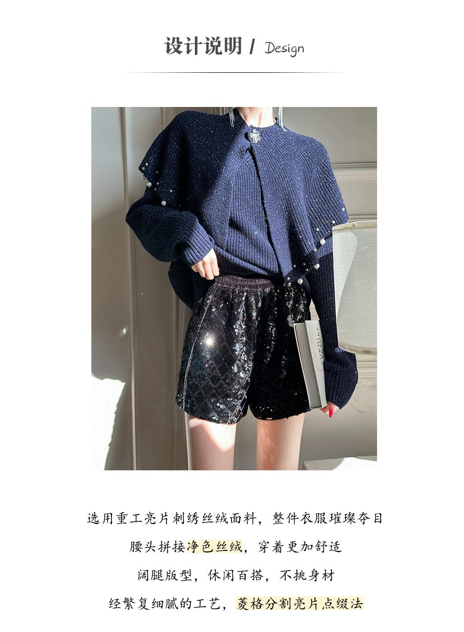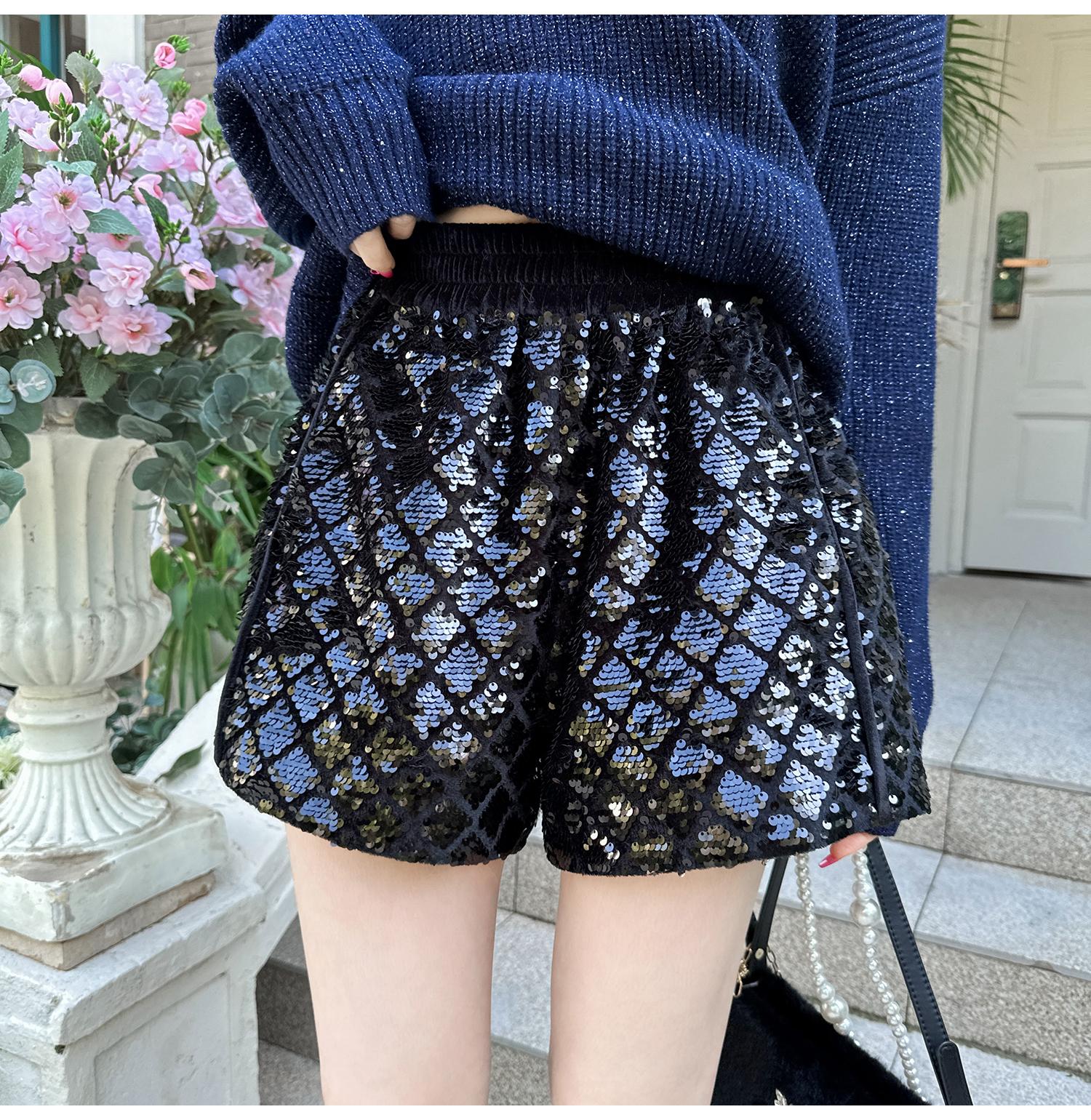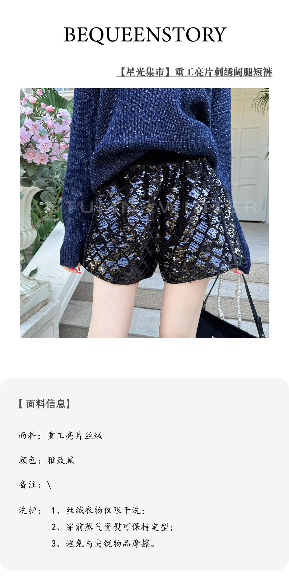 BeQueenStory【星光集市】重工亮片刺绣拼接丝绒休闲阔腿短裤