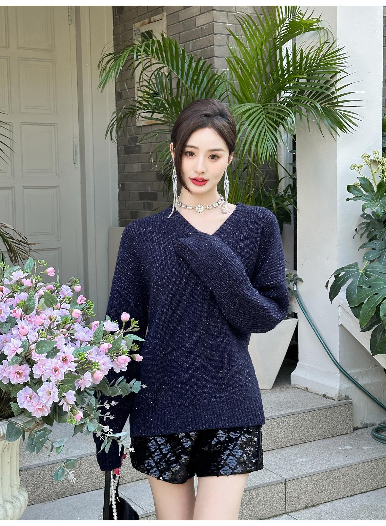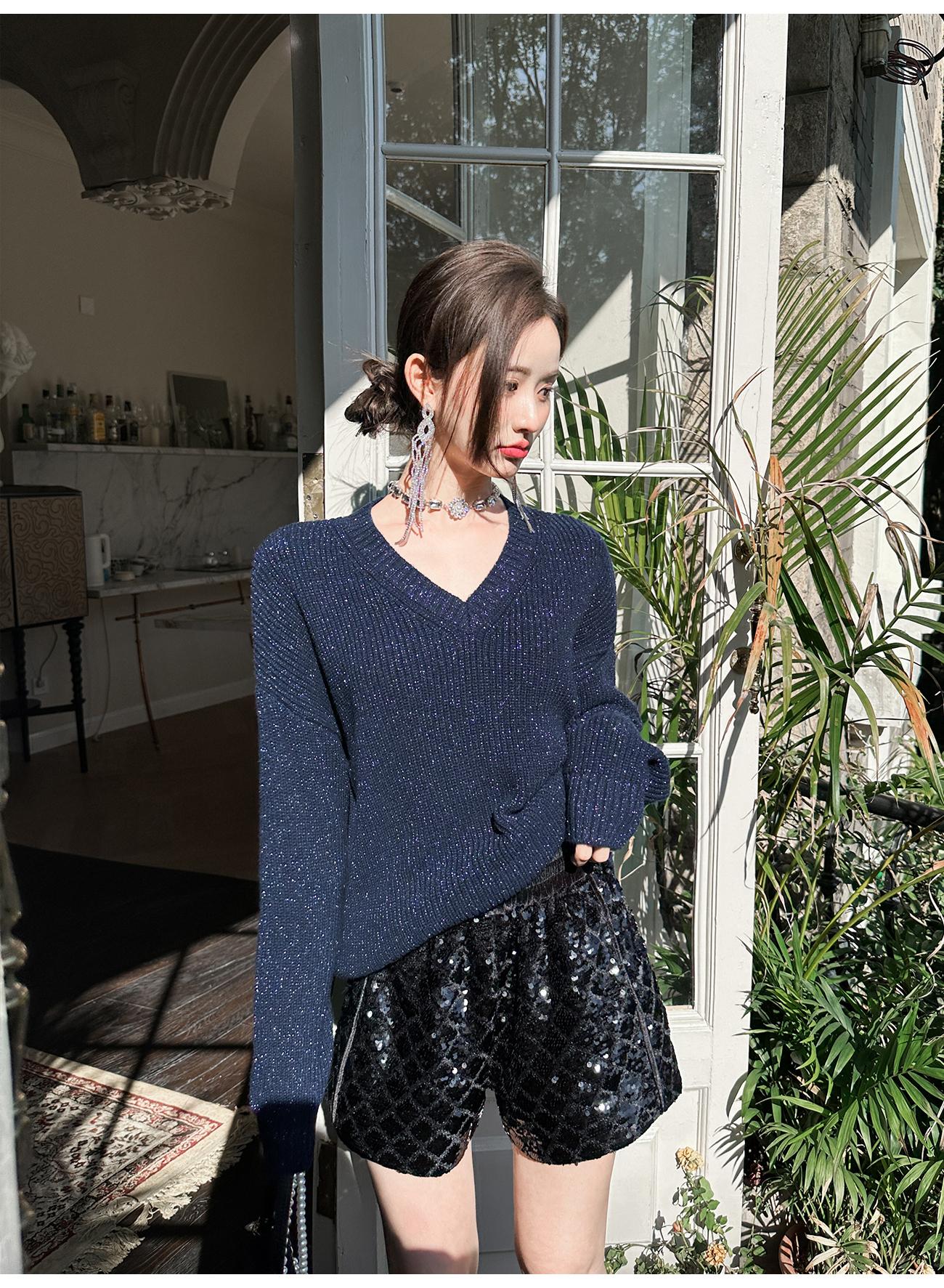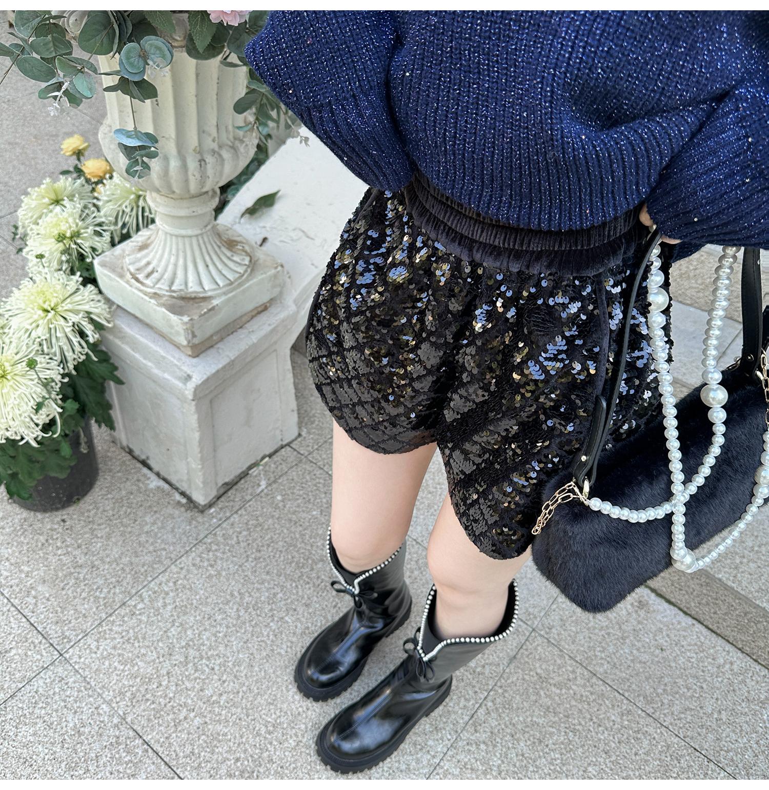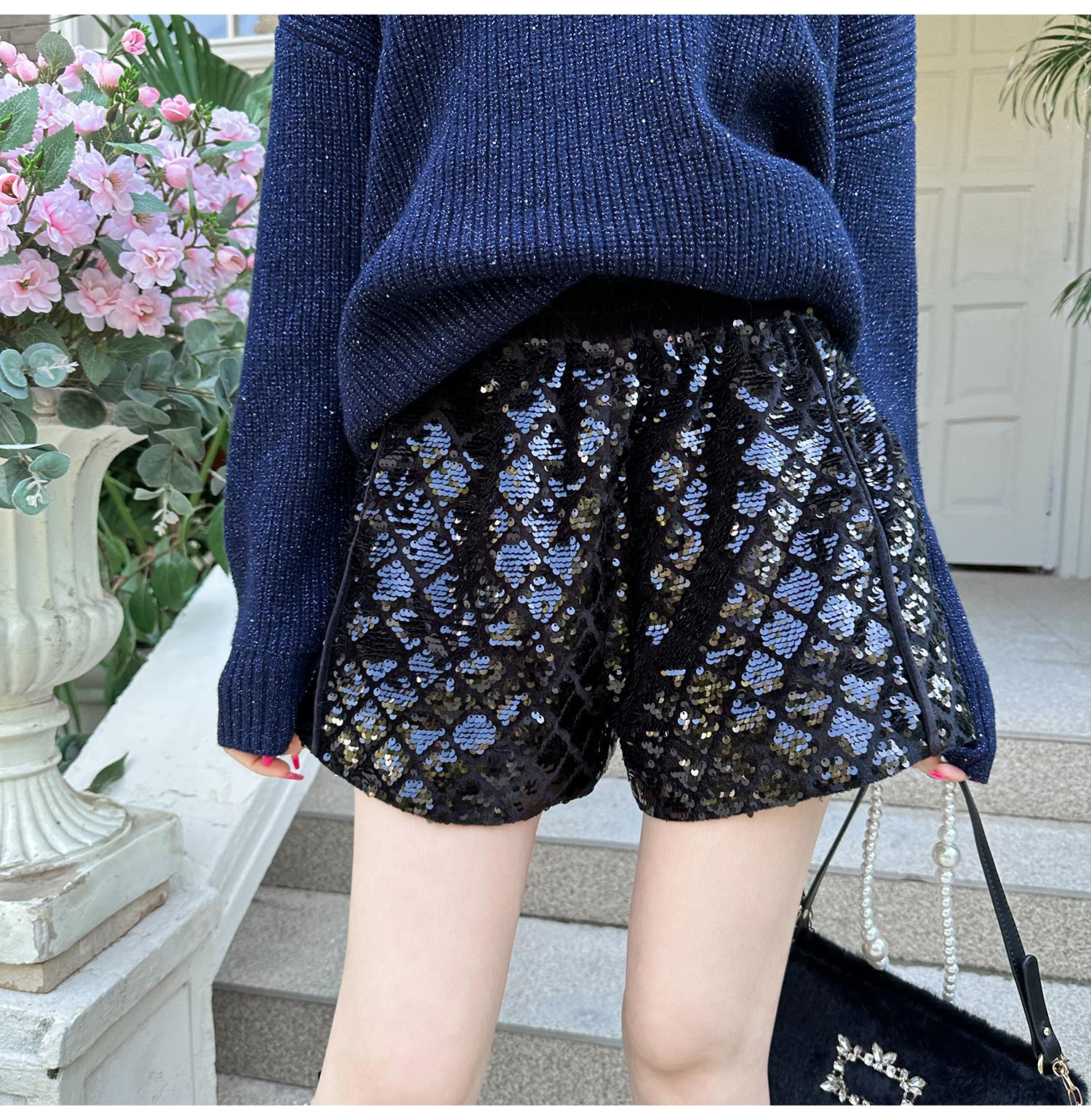 BeQueenStory【星光集市】重工亮片刺绣拼接丝绒休闲阔腿短裤