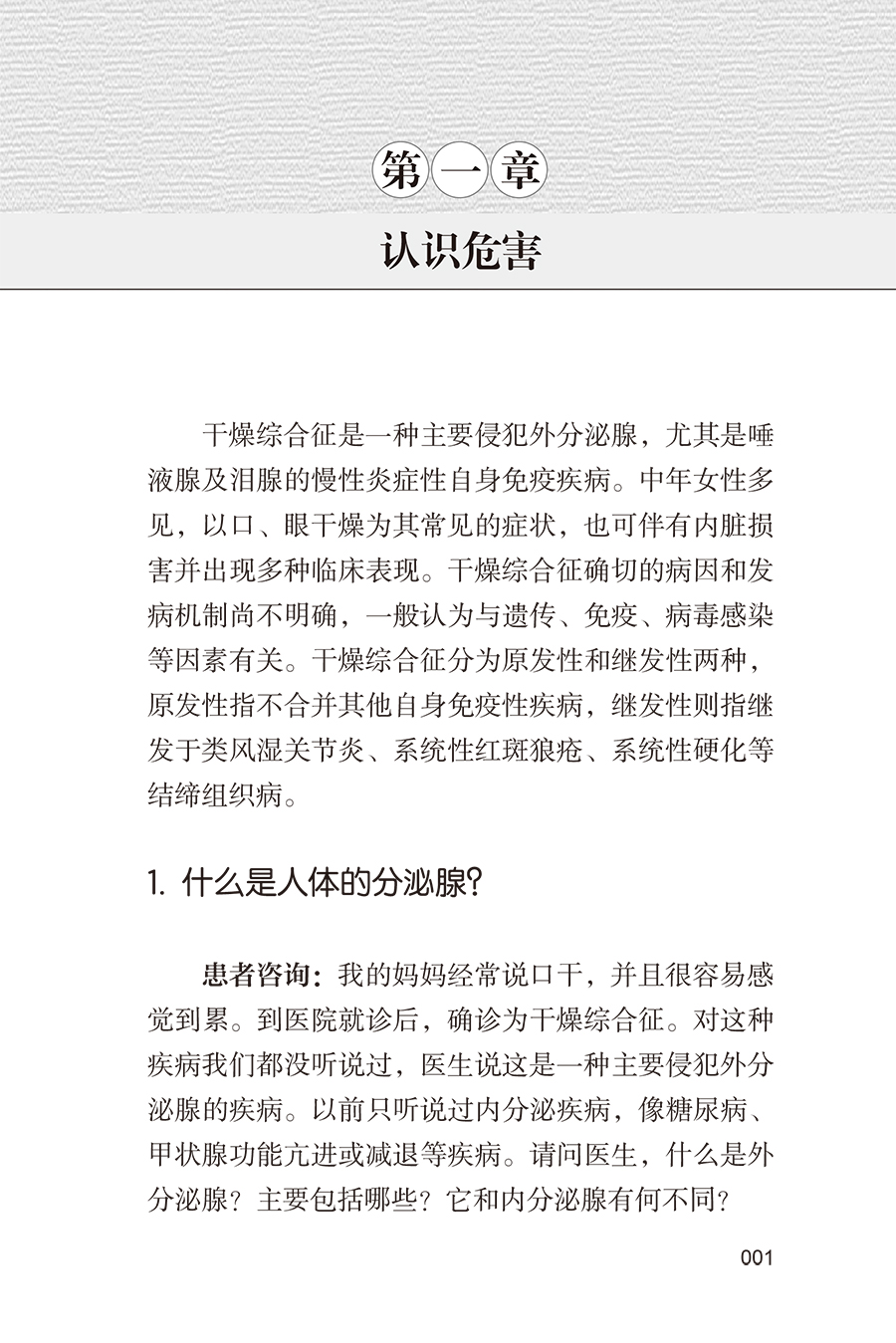 干燥综合征是一种主要侵犯外分泌腺,尤其是唾液腺及泪腺的慢性炎症性自身免疫疾病。中年女性多见,以口、眼干燥为其常见症状,也可伴有内脏损害并出现多种临床表现。其确切的病因和发病机制尚不明确,一般认为与遗传、免疫、病毒感染等因素有关。这是近年来被不断重新认识的疾病,越来越多的人被确诊。本书采用对话的方式,即患者提问题,医生作回答,多角度、全方位地诠释了干燥综合征的现状和危害、病因和病机、诊断与鉴别、治疗与护理等方面的诸多问题。所介绍的问题都是患者最关心、最常见、拥有代表性的。本书内容精炼,通俗易懂,形式生动活泼,适合广大患者及家属阅读,相信也是对在校医学生和医学爱好者有益的参考书。