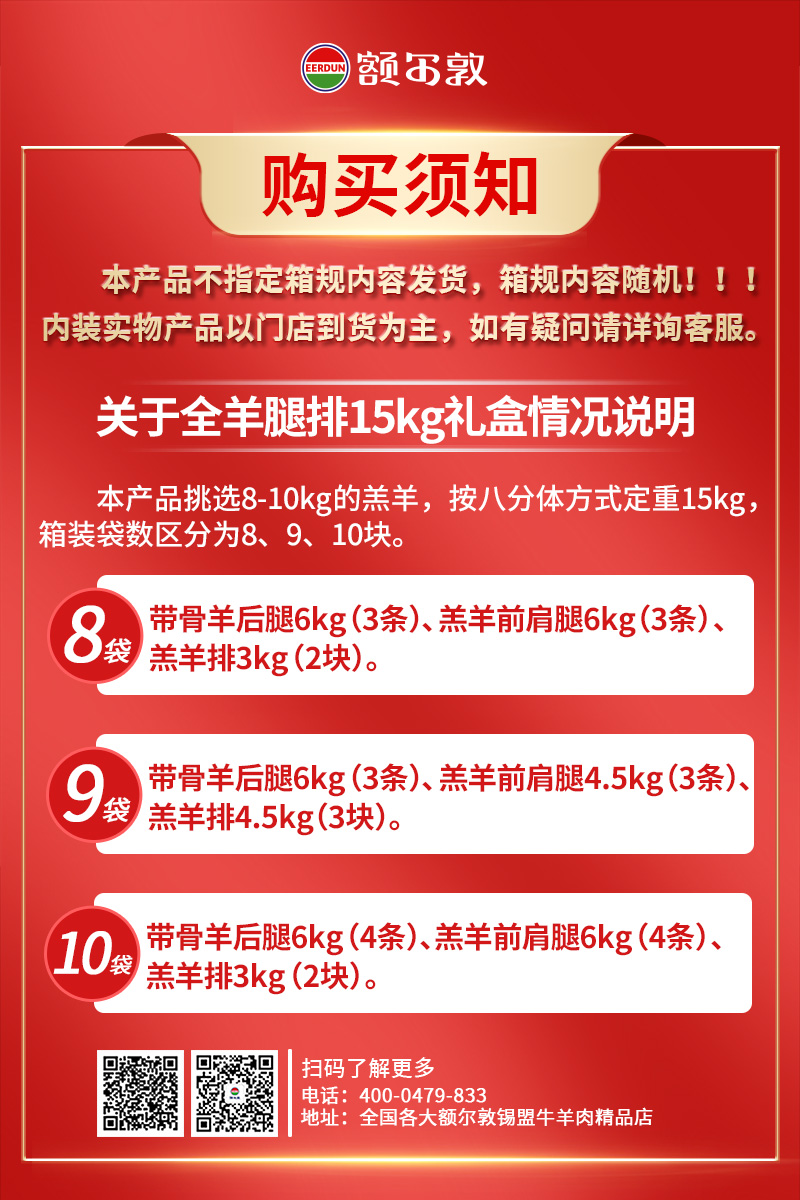 A、8袋的箱装八分体15kg,内装带骨羊后腿6kg(3条),羔羊前肩腿6kg(3条),羔羊排3kg(2块)。