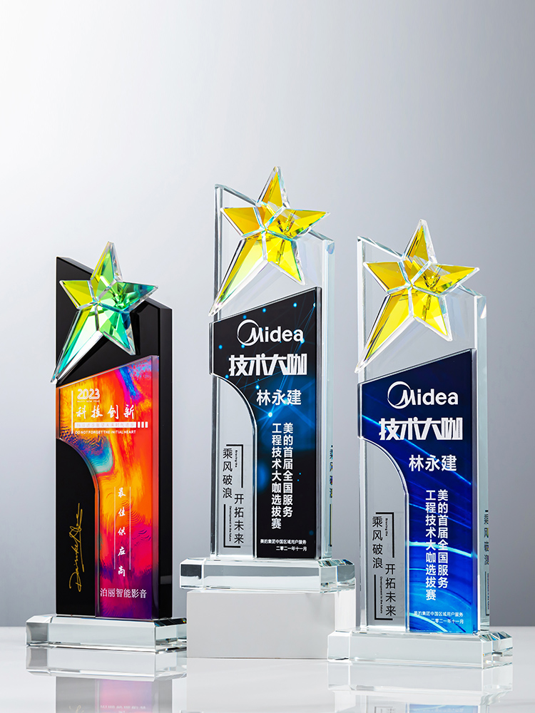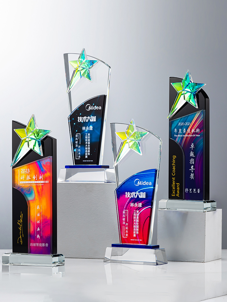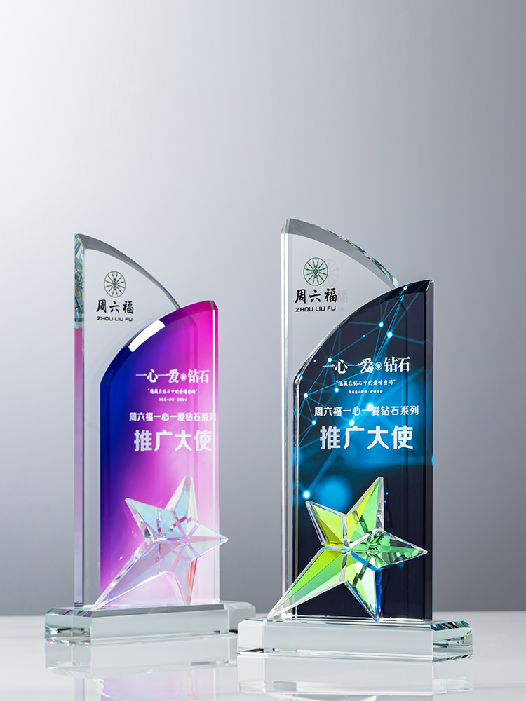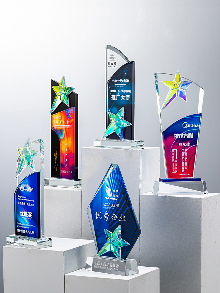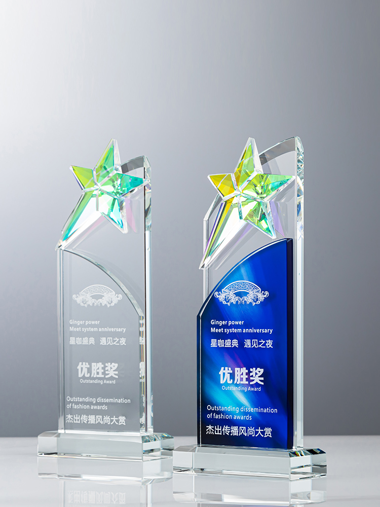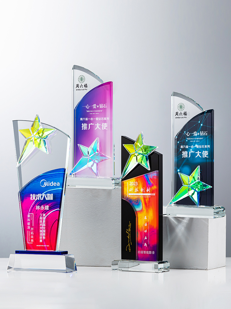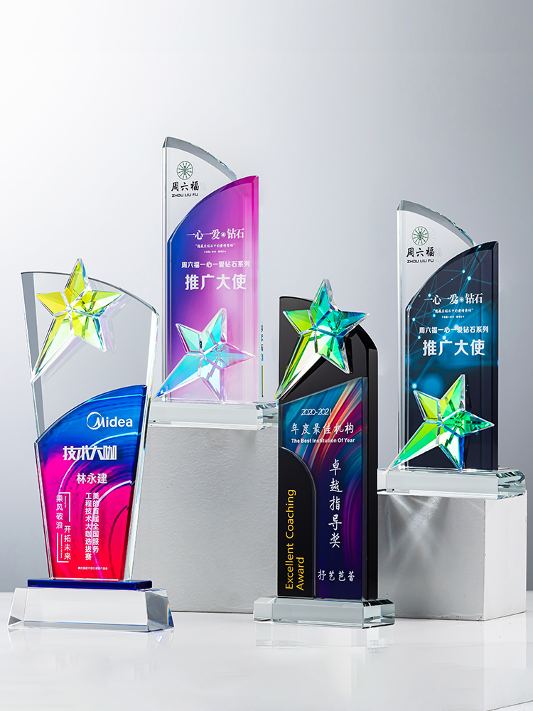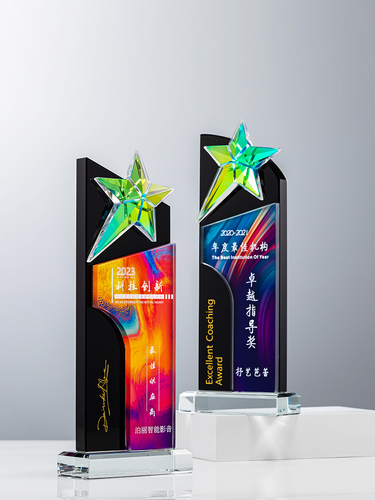 定制水晶奖杯炫彩五角星公司年会优秀员工运动会颁奖高档彩印纪念