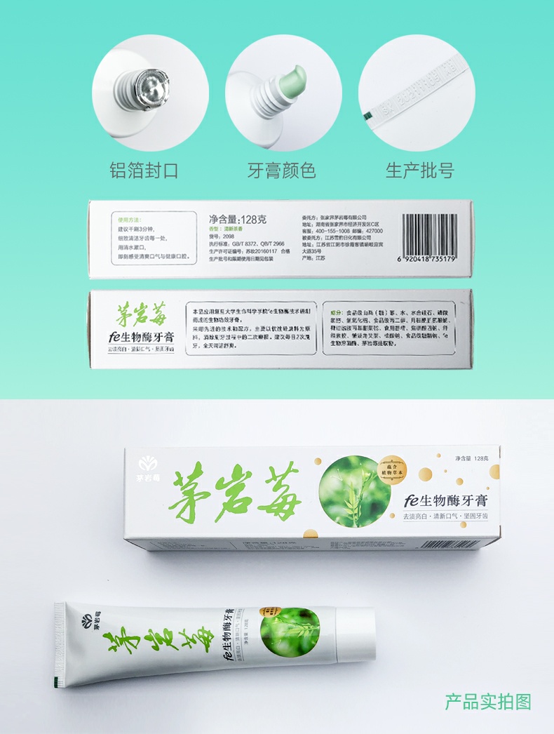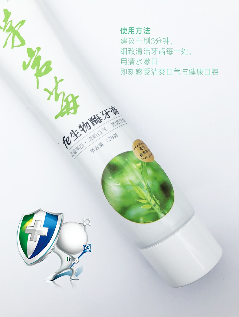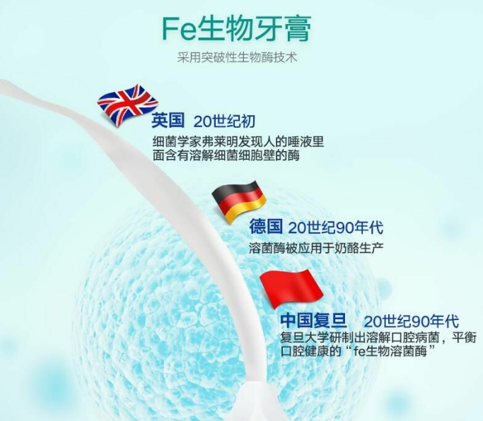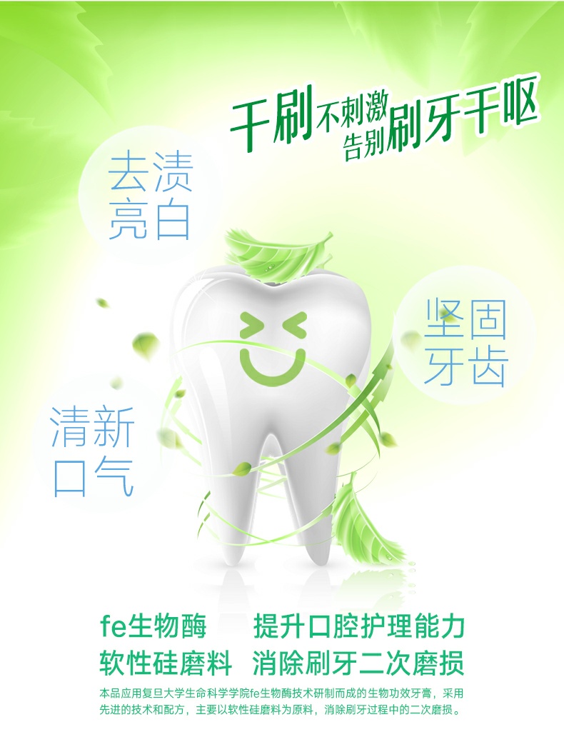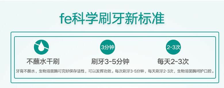 不含薄荷,淡淡的茶香味。干刷不刺激,告别刷牙干呕。fe生物酶,提升口腔护理能力,软性硅磨料,消除刷牙二次磨损。