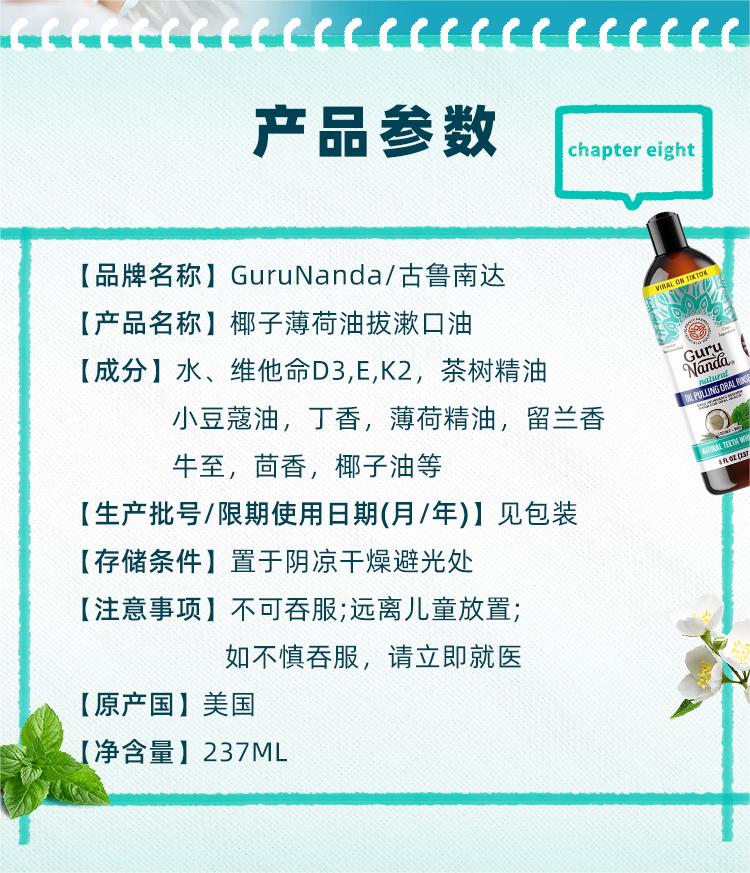 【跨境】GuruNanda古鲁南达椰子薄荷油拔漱口油237ml(效期至2026年3月)