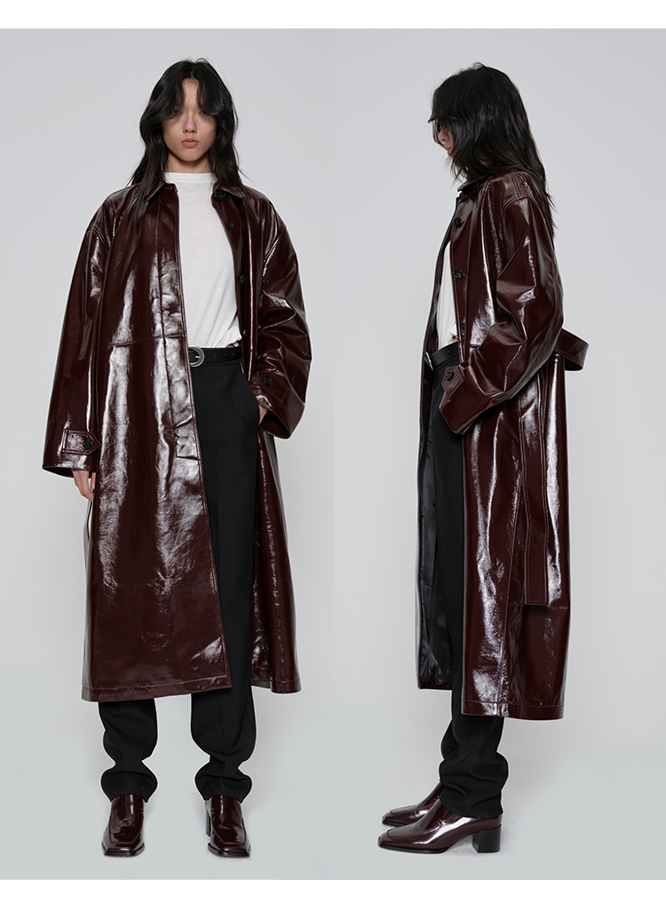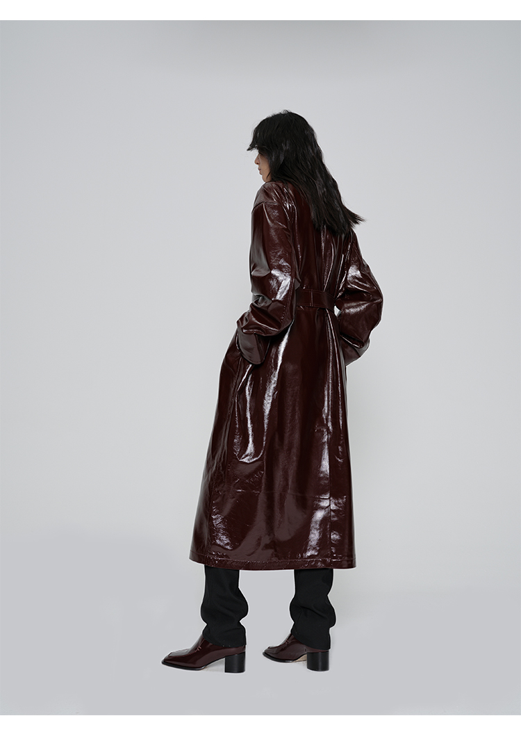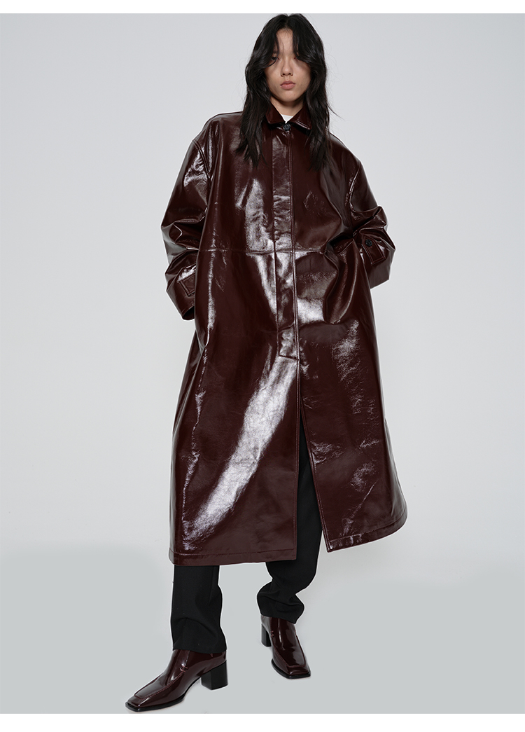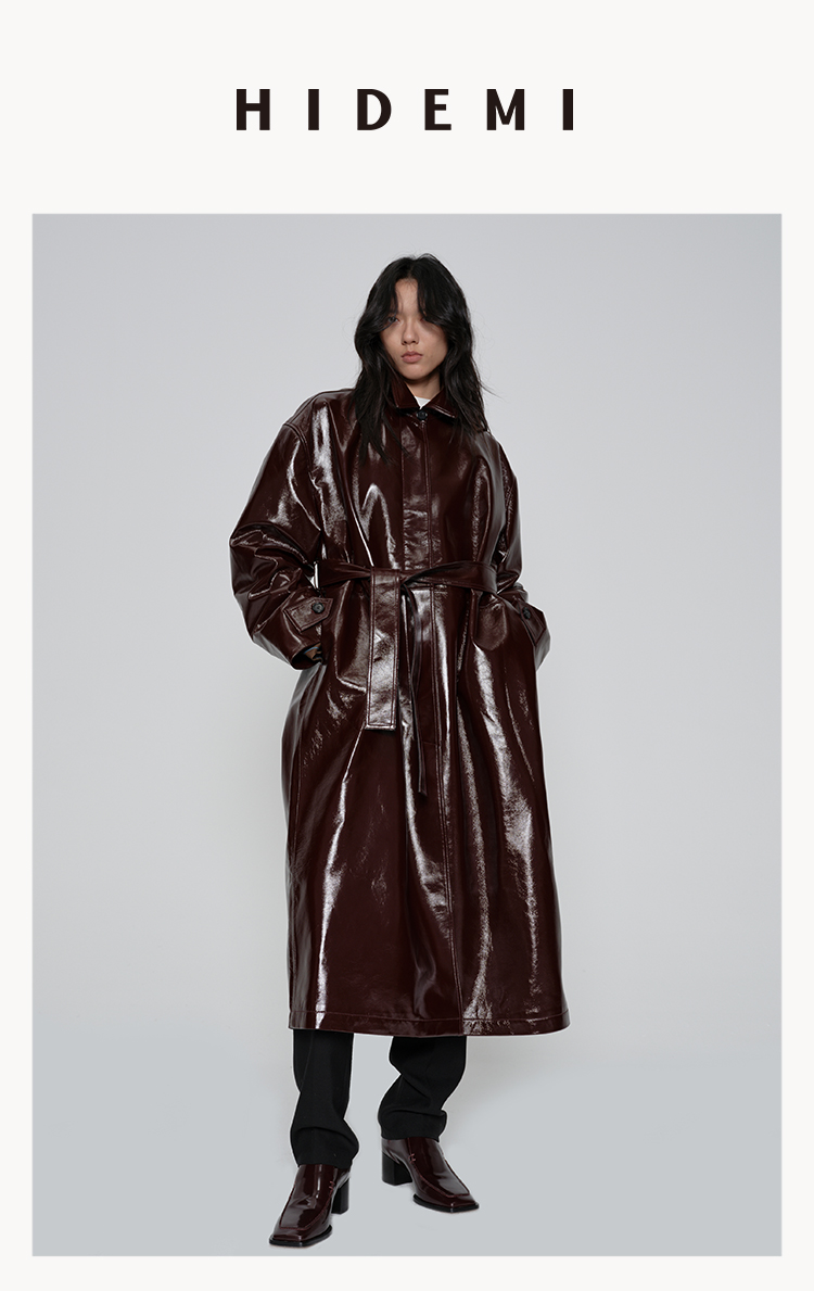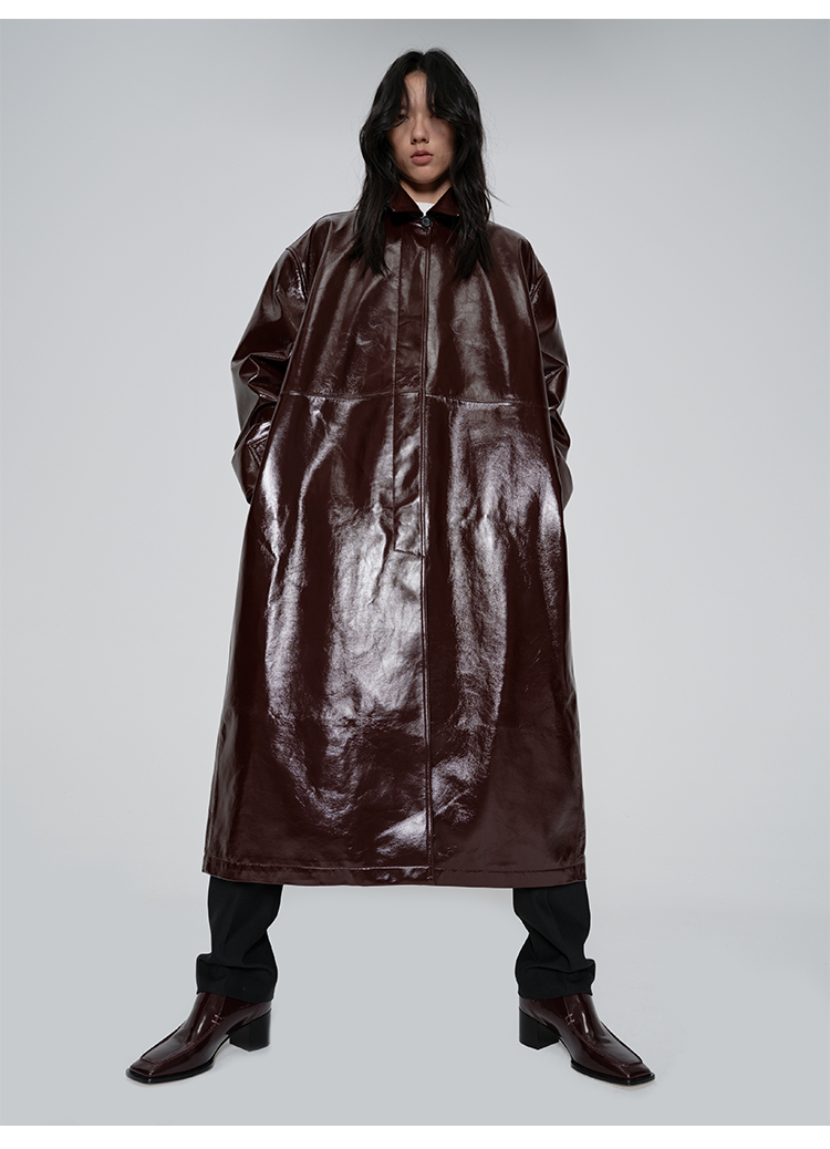 HIDEMI 勃艮第酒红进口激光涂层裂纹感羊皮圆领极简大廓形落肩款长款皮衣大衣