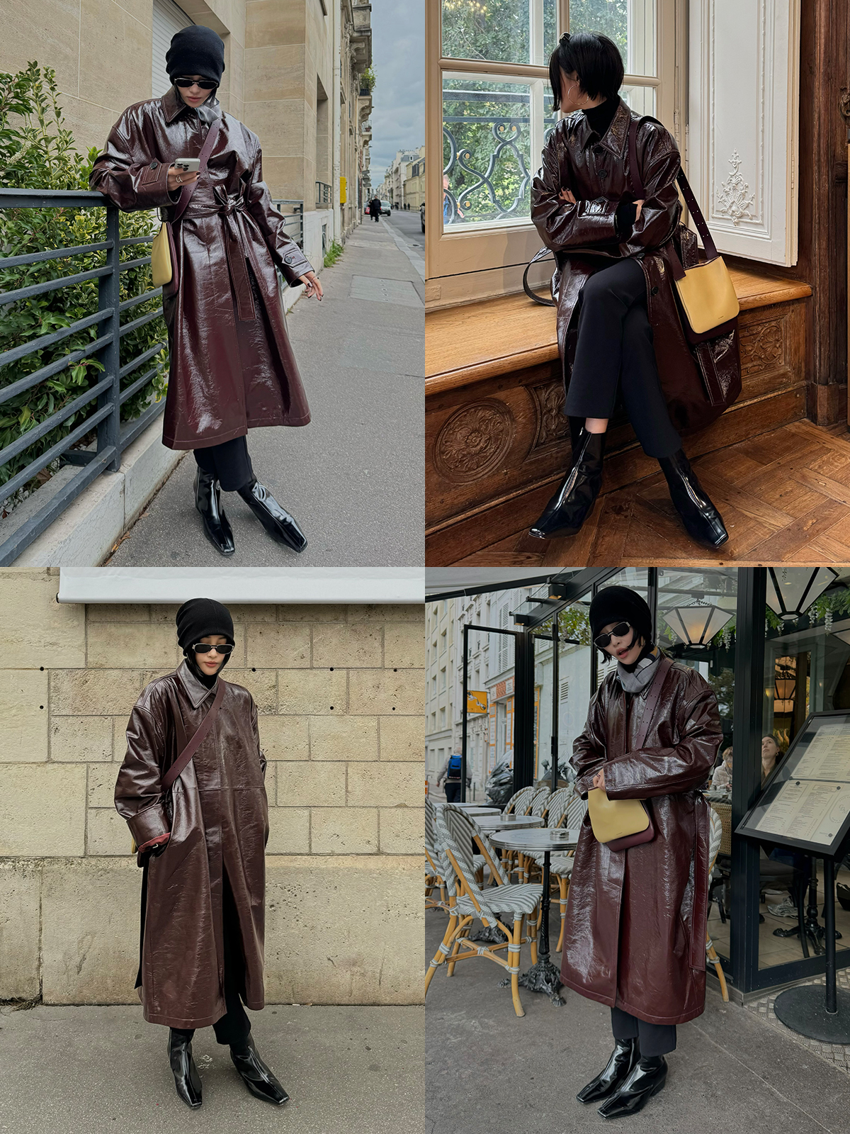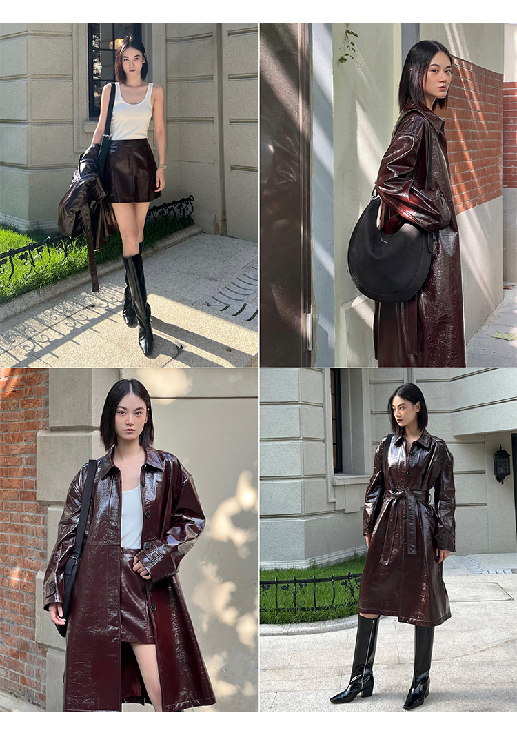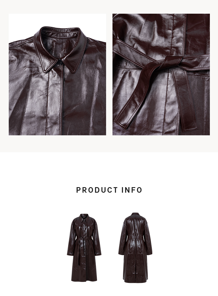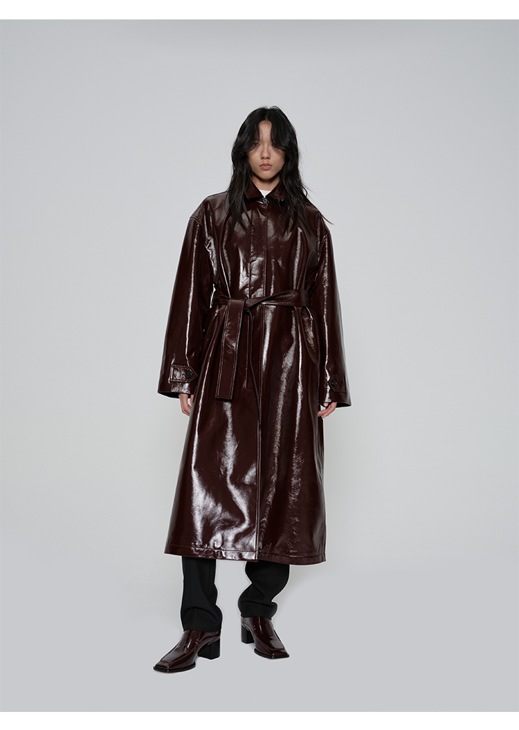 HIDEMI 勃艮第酒红进口激光涂层裂纹感羊皮圆领极简大廓形落肩款长款皮衣大衣