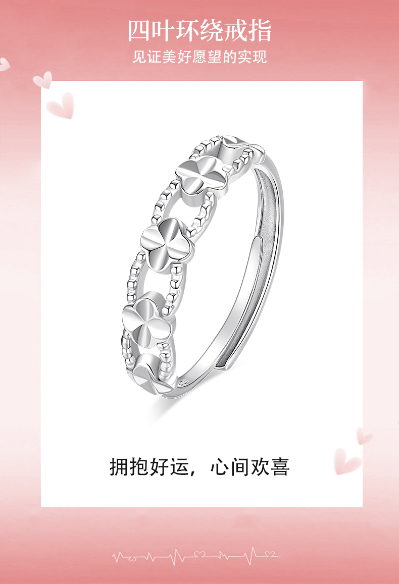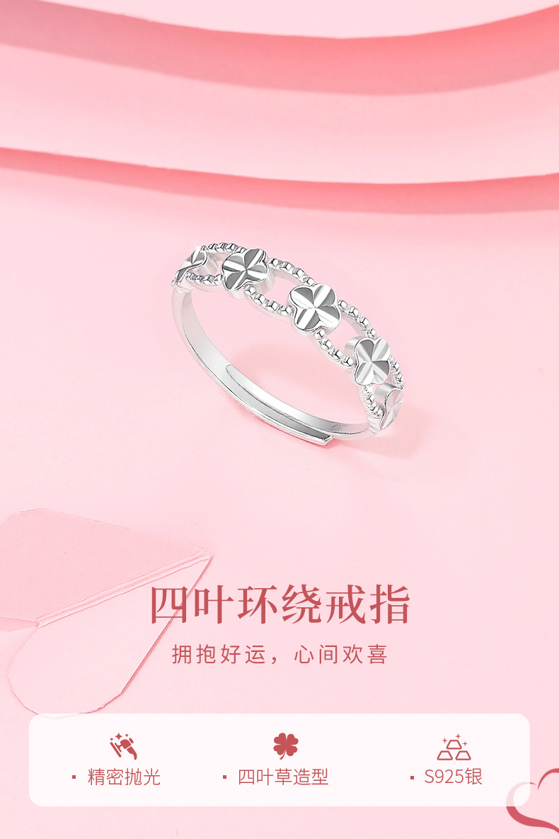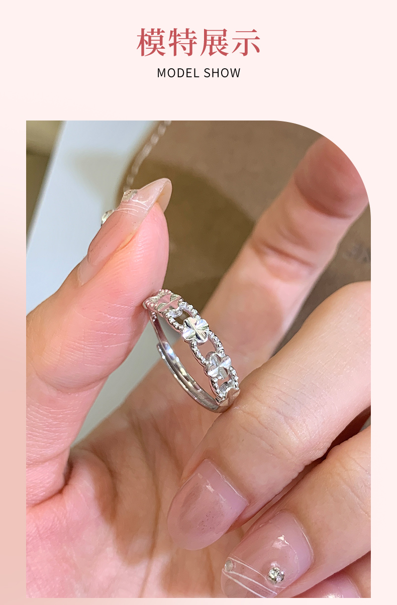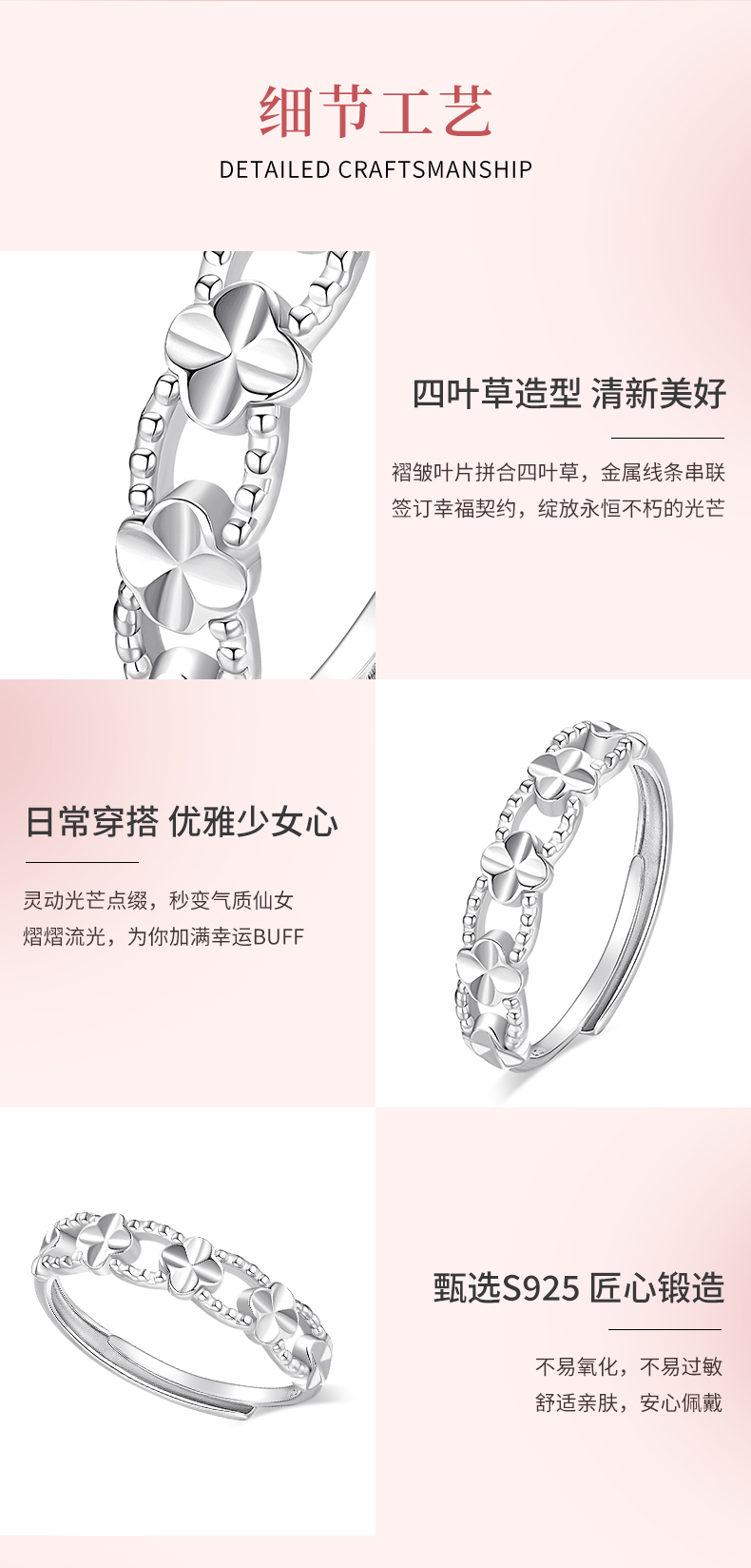 卡蒂罗KADER 幸运四叶草女戒 925银新中式四叶草镂空设计 轻奢经典大气素圈可调节单戒 高级感精致温柔百搭