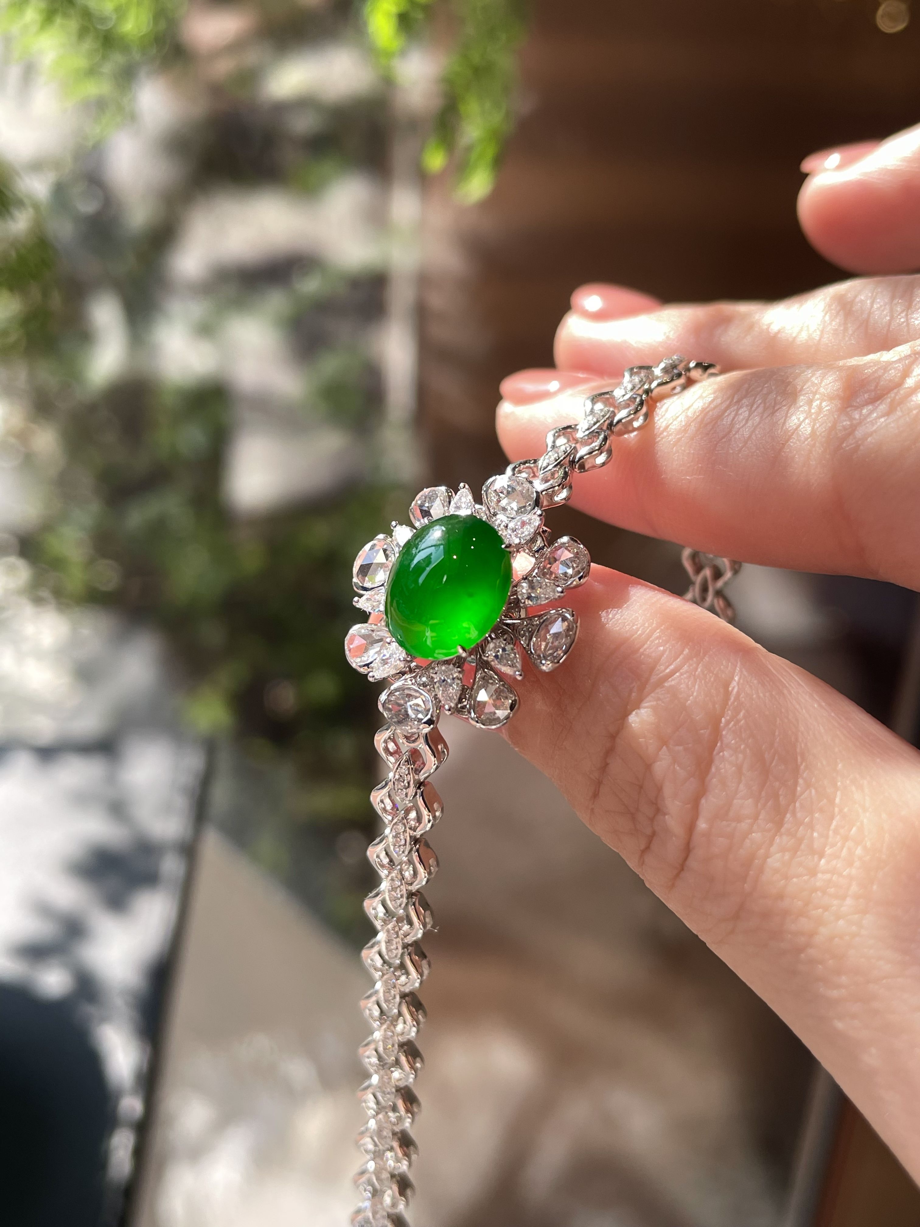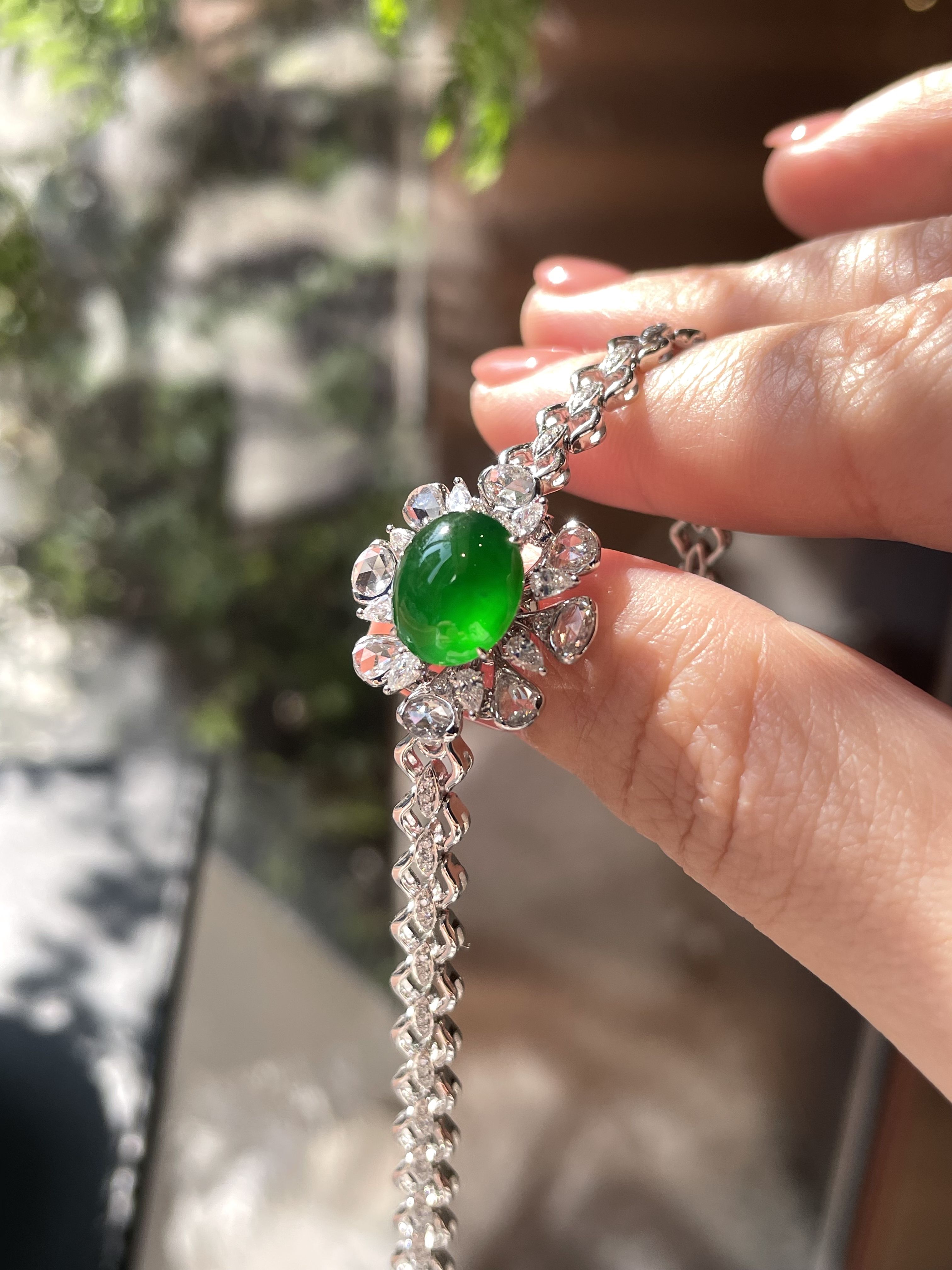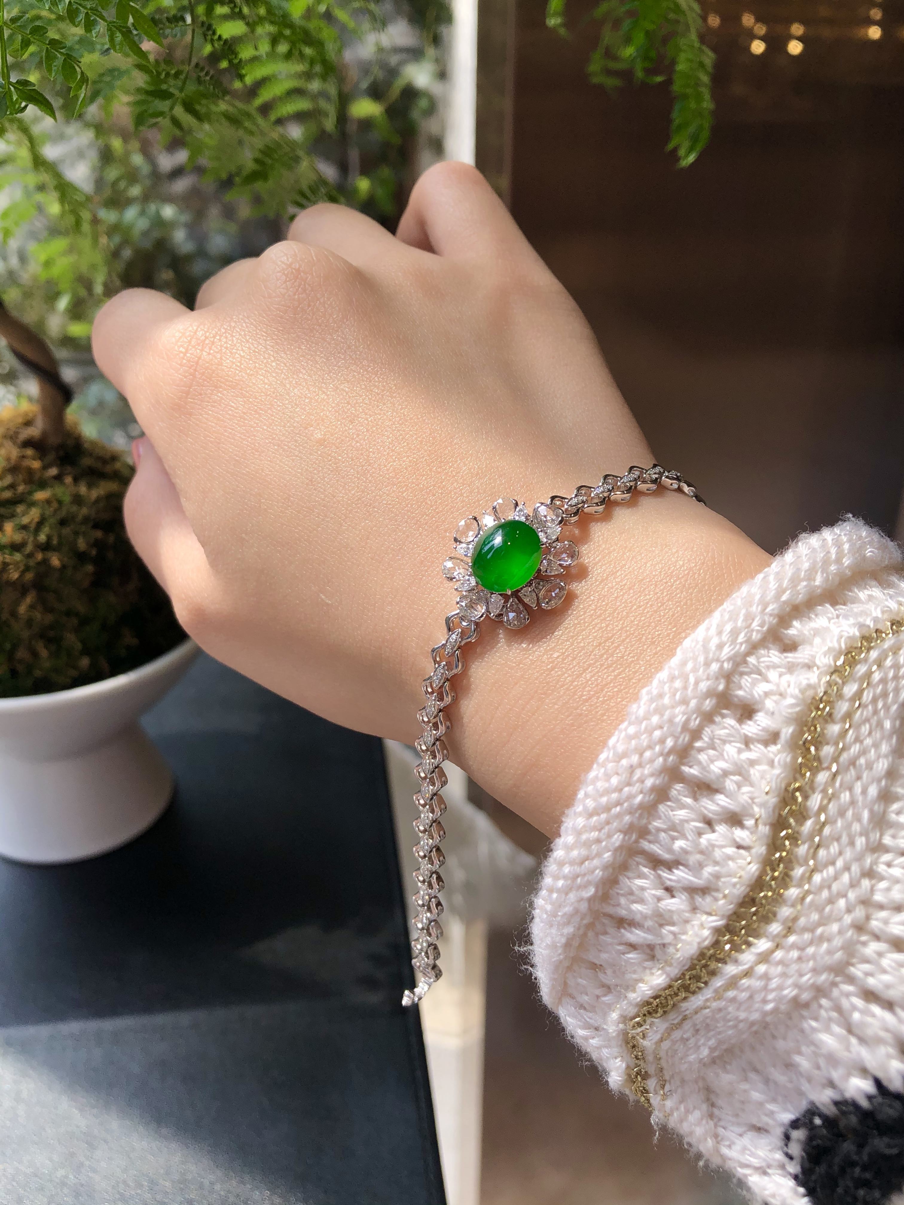 老坑玻璃帝王绿蛋面手链,美入心脾的黄阳,经典的太阳花设计镶嵌,手腕微抬,是那醉迷黄阳~💓【63-1113006】具体价格微信咨询