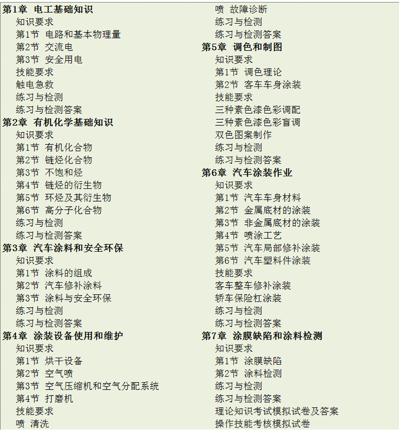 本教材在编写中根据本职业的工作特点,以能力培养为根本出发点,采用模块化的编写方式。全书共分为7章,内容包括:电工基础知识、有机化学基础知识、汽车涂料和安全环保、涂装设备使用和维护、调色和制图、汽车涂装作业、涂膜缺陷和涂料检测等。