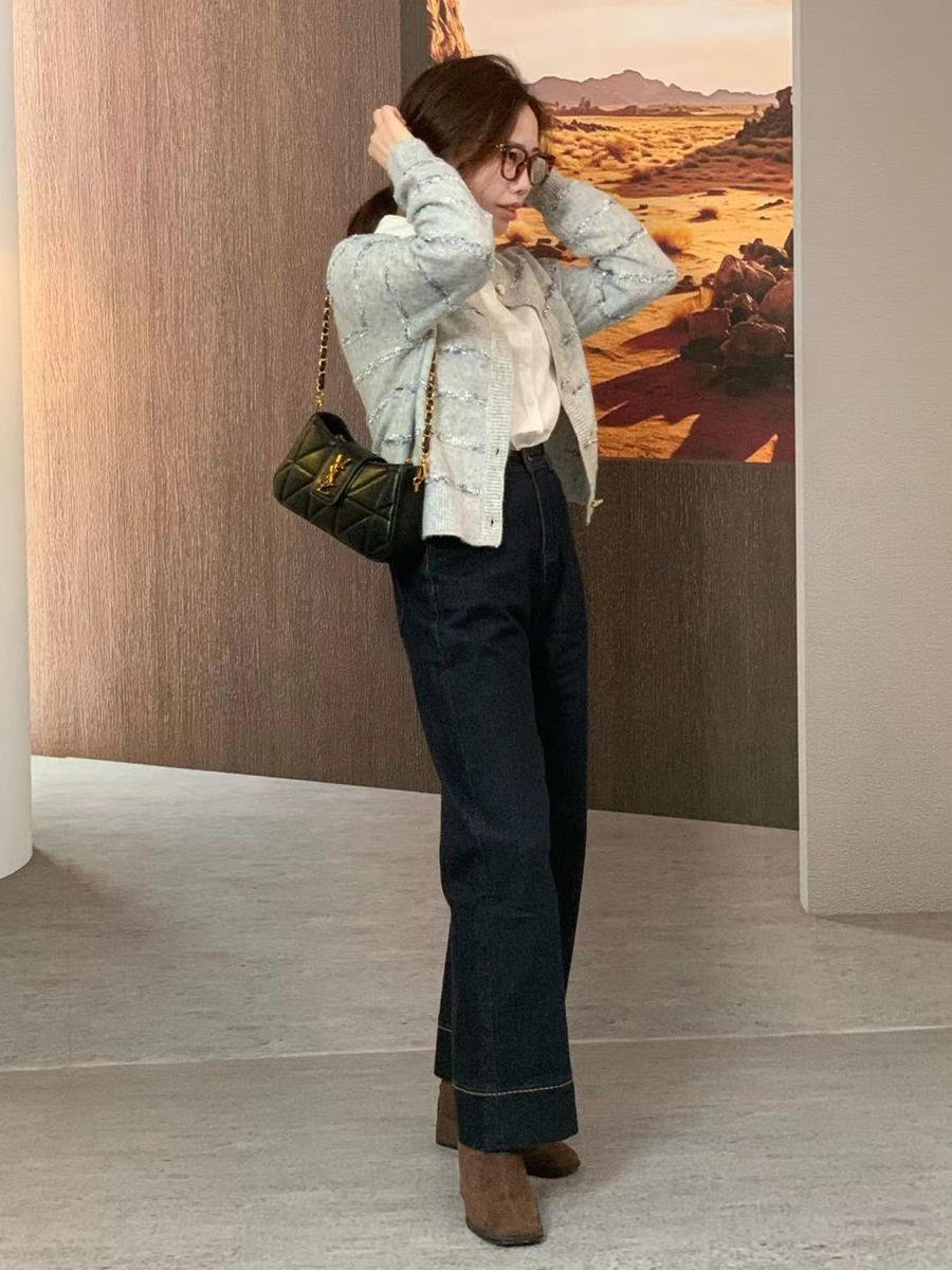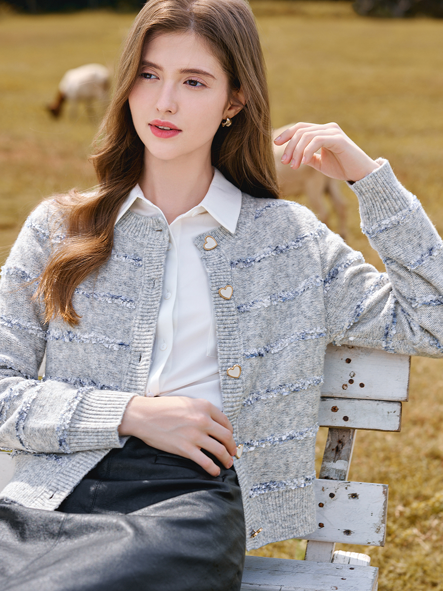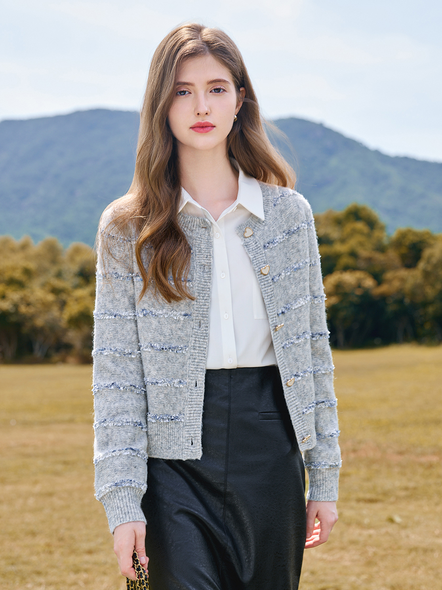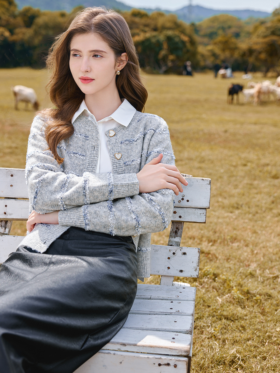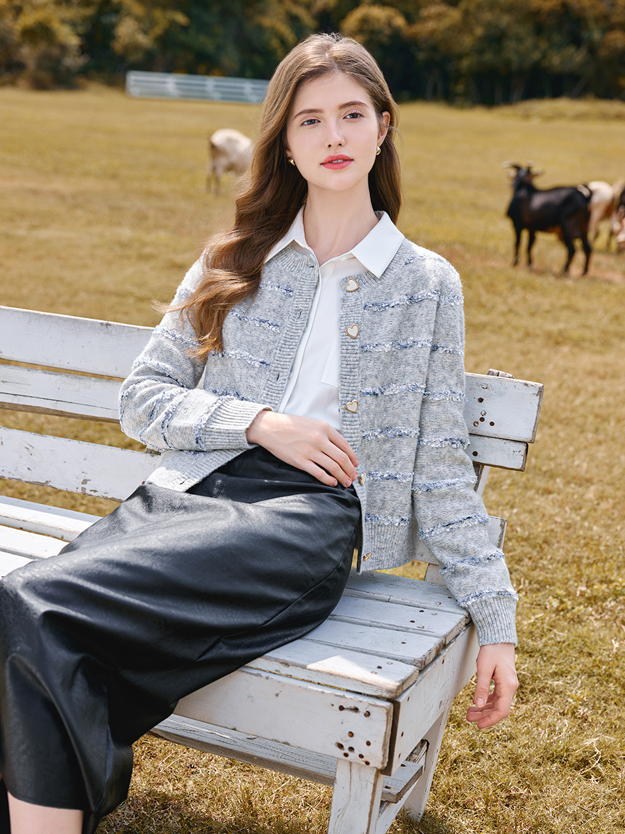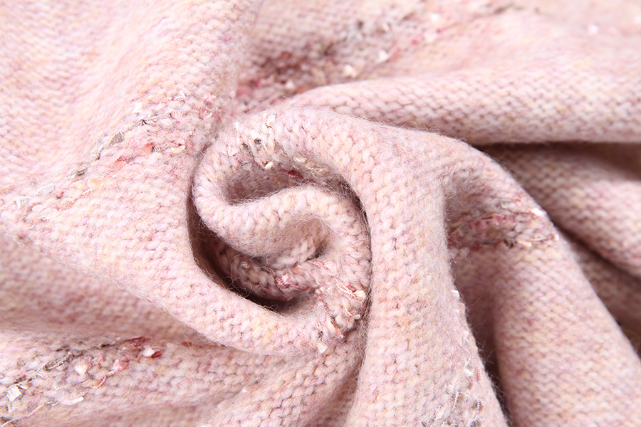 其纹路为多组织提花梭织面料, 是精心挑选的雀羽绒纱线, 经纬交错编织在一起, 创造出新的搭配颜色和图案, 每一款都是独一无二, 表面富有凹凸立体感