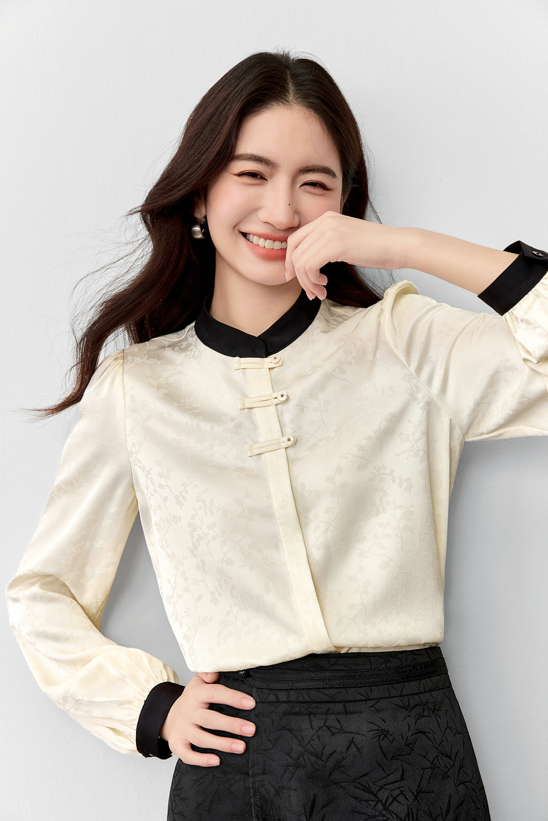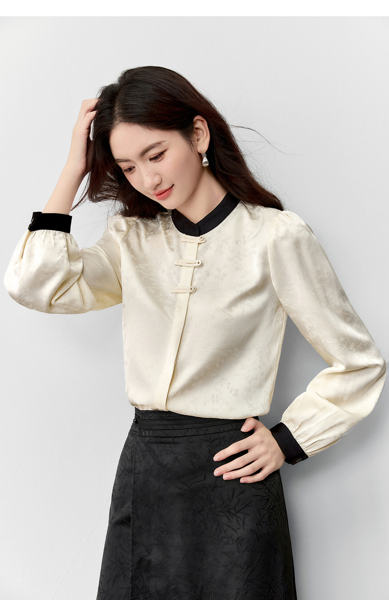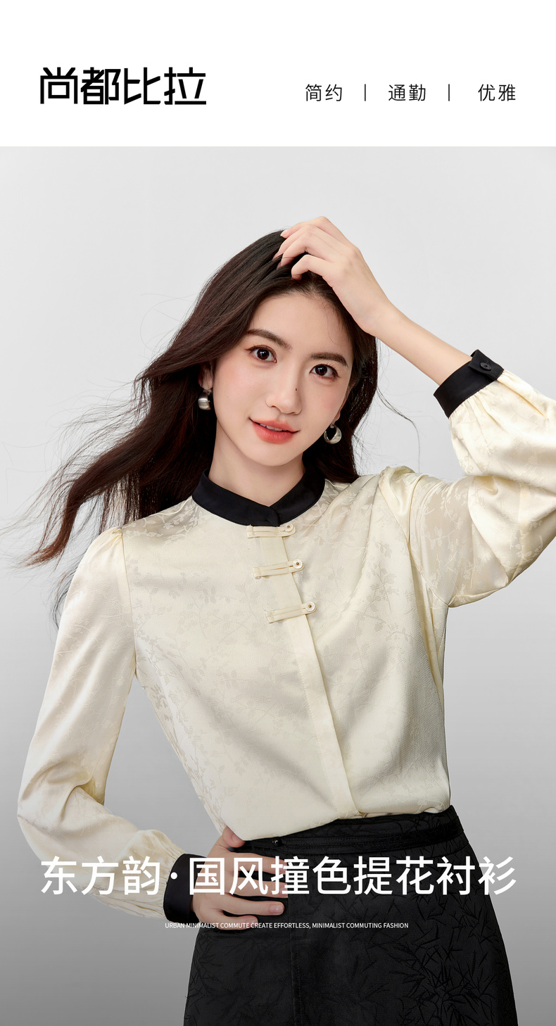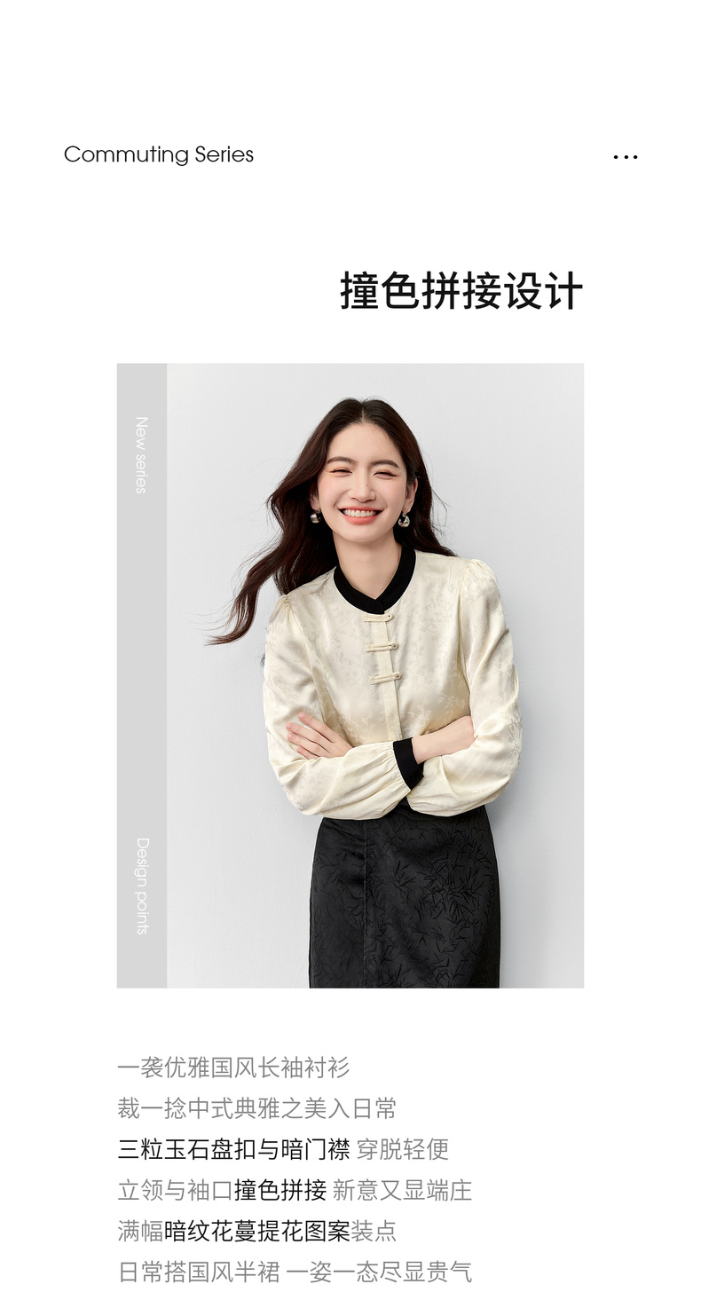 【内购】【撞色拼接】优雅通勤国风立领玉石盘扣暗门襟缎感提花长袖衬衫-153CC2853
