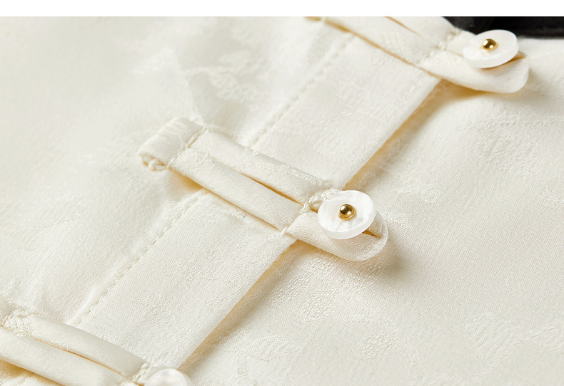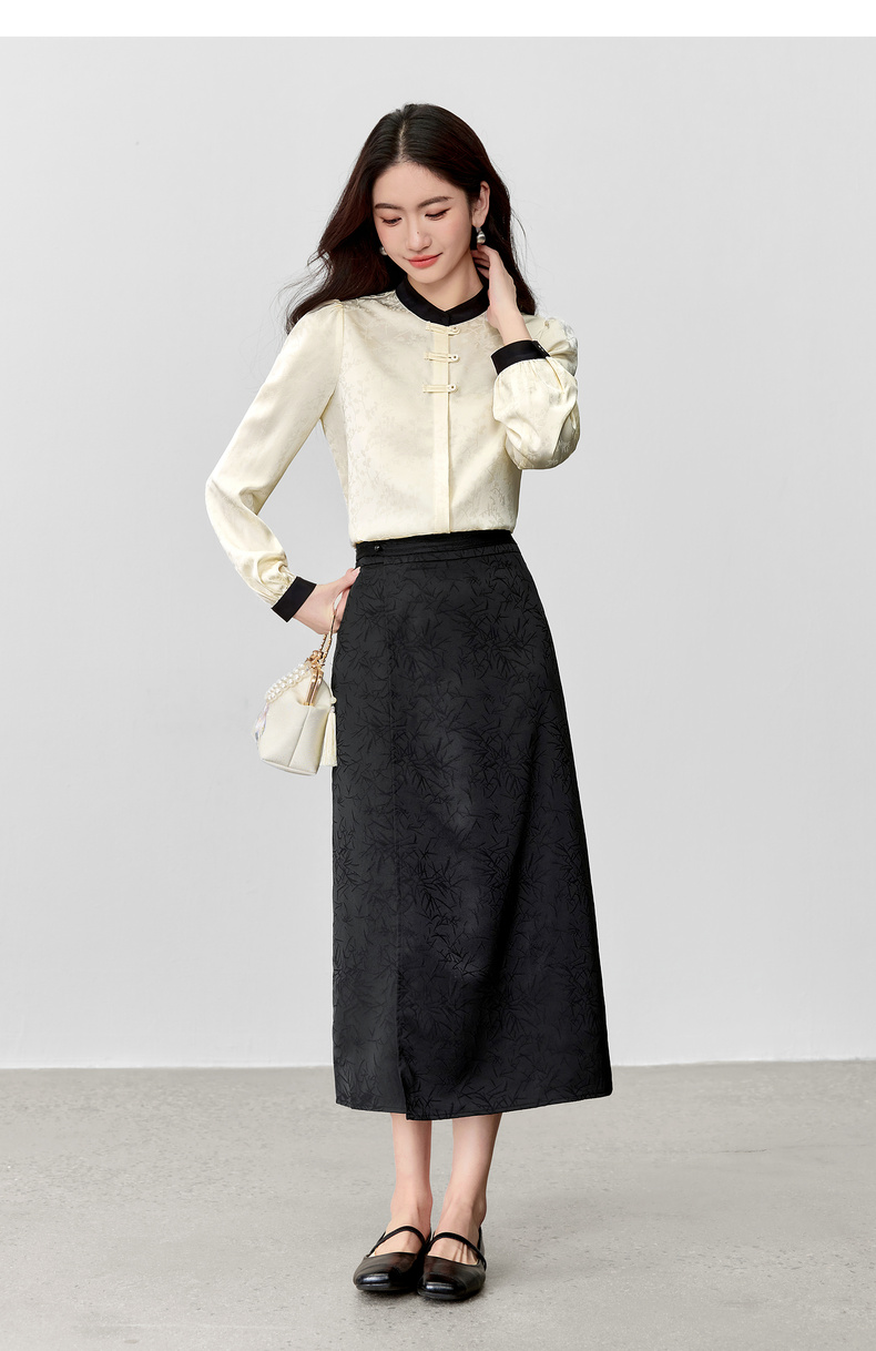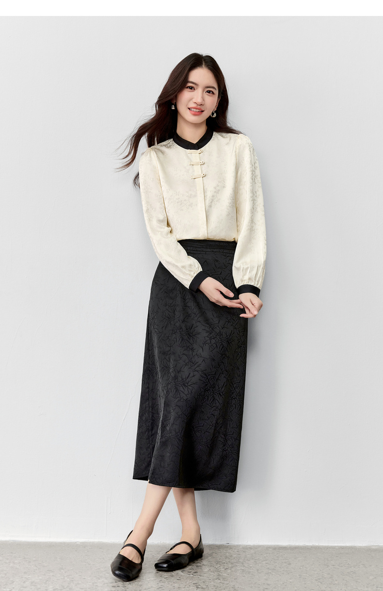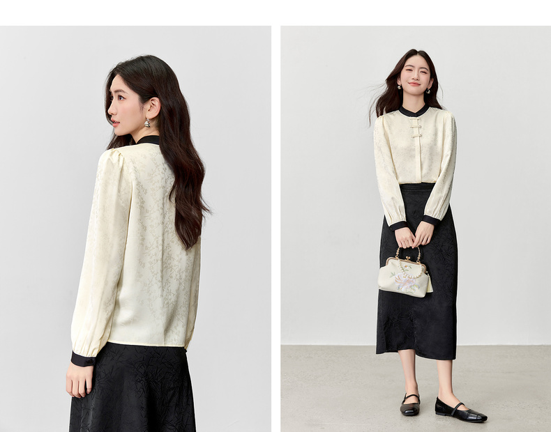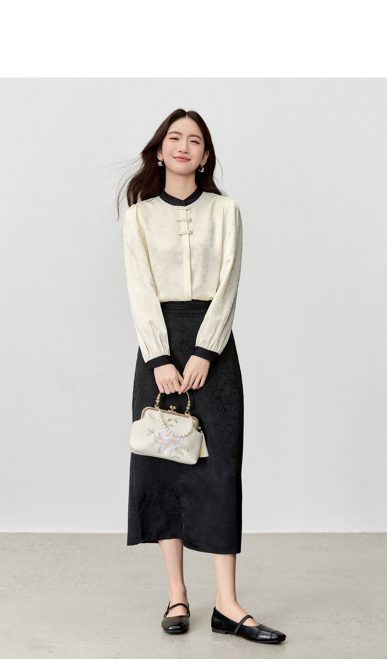【内购】【撞色拼接】优雅通勤国风立领玉石盘扣暗门襟缎感提花长袖衬衫-153CC2853