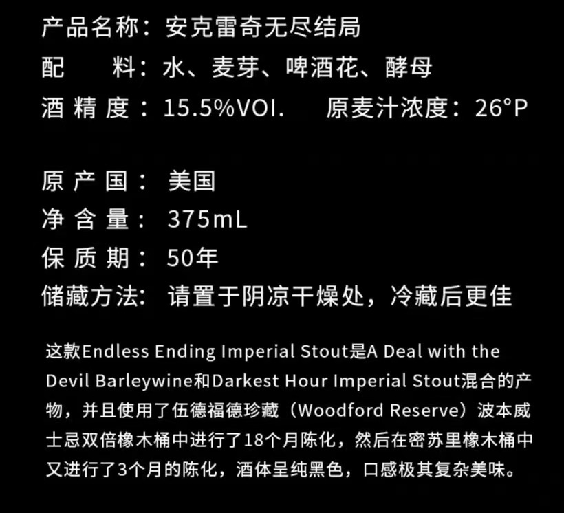 安克雷奇无尽的结局铂金礼盒版 原产国:美国 酒精度:15.5度 麦芽度:26度