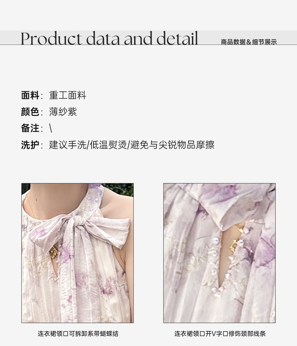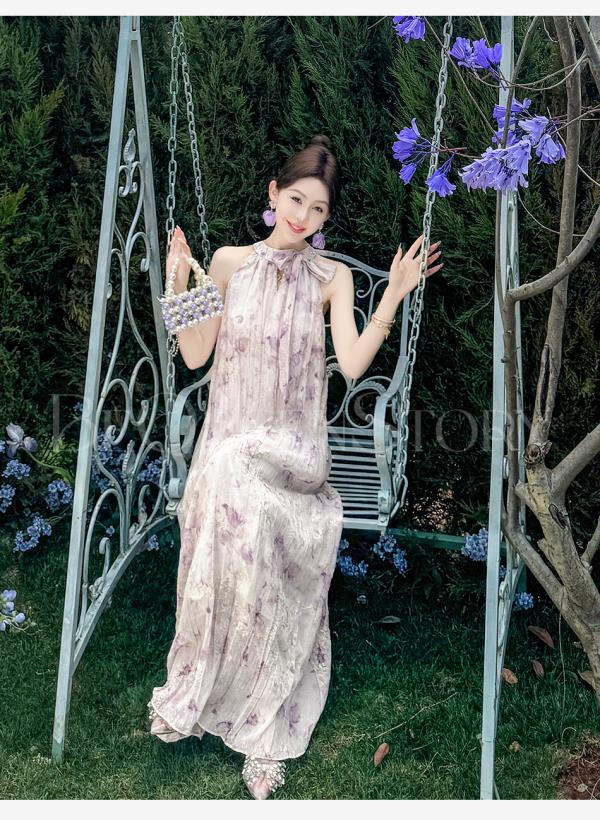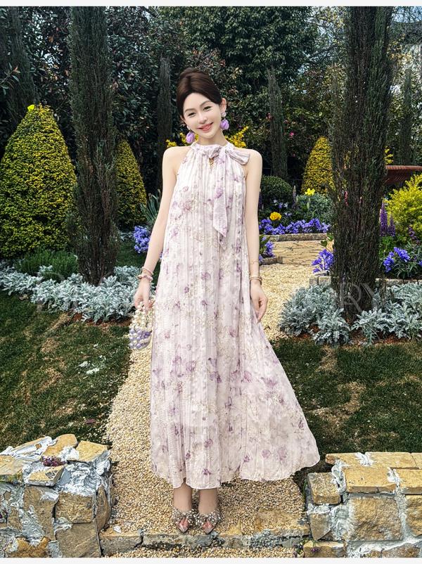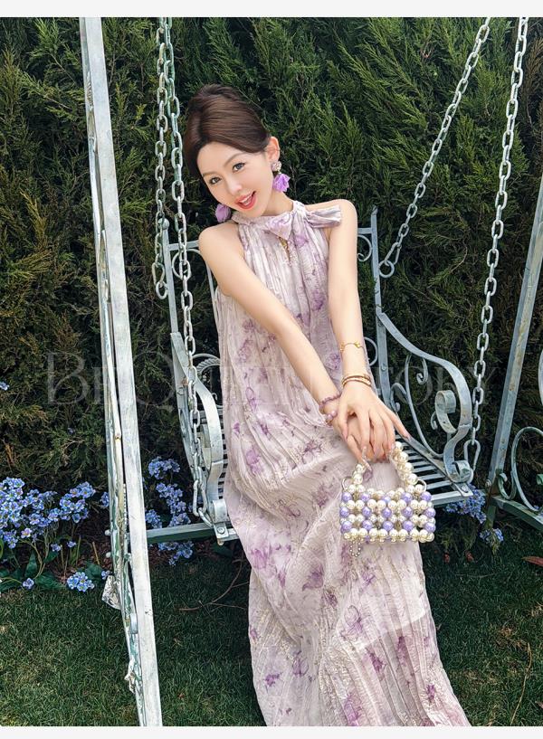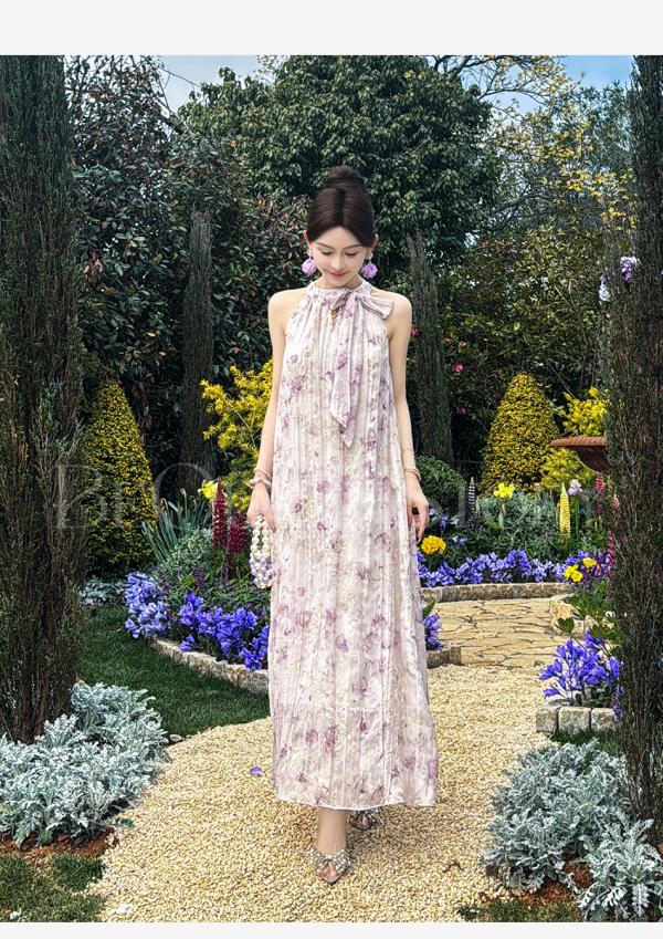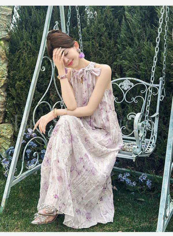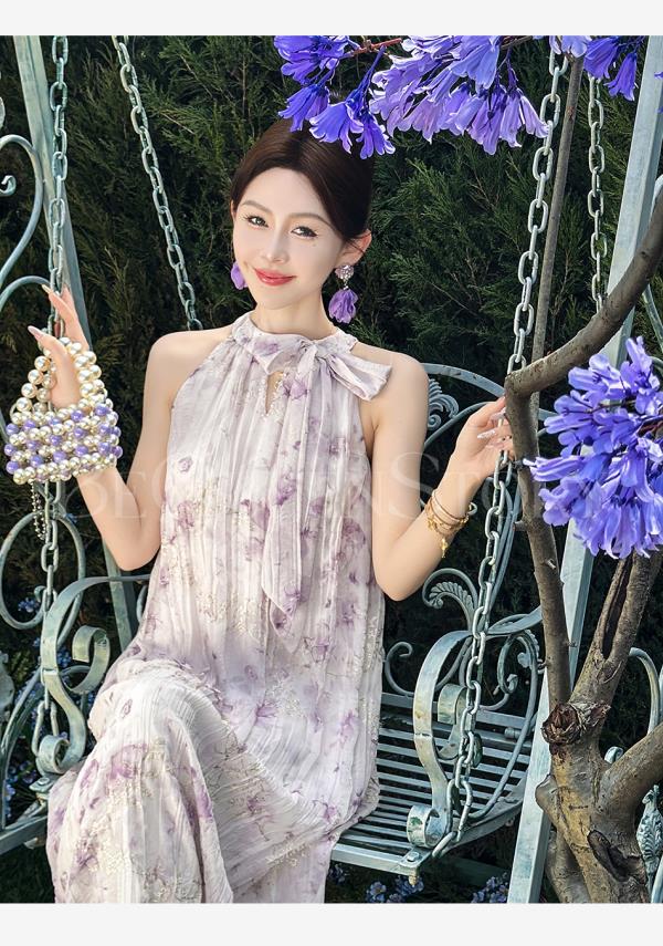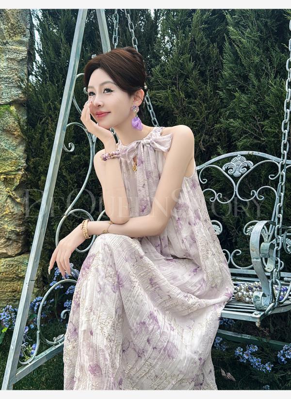 余潇潇【南池花语】2025新品印花压褶绣花漏肩挂脖连衣裙夏季紫色