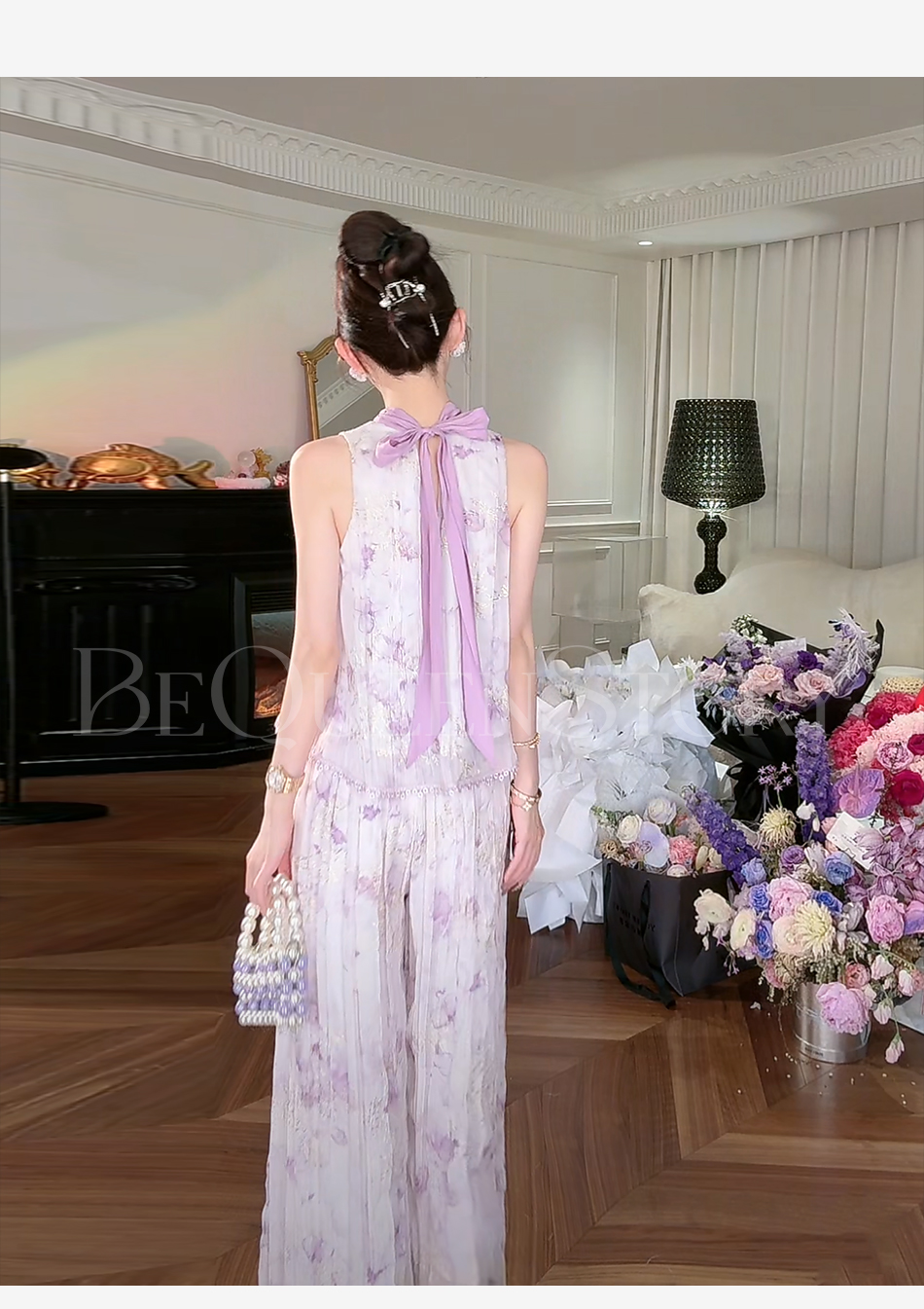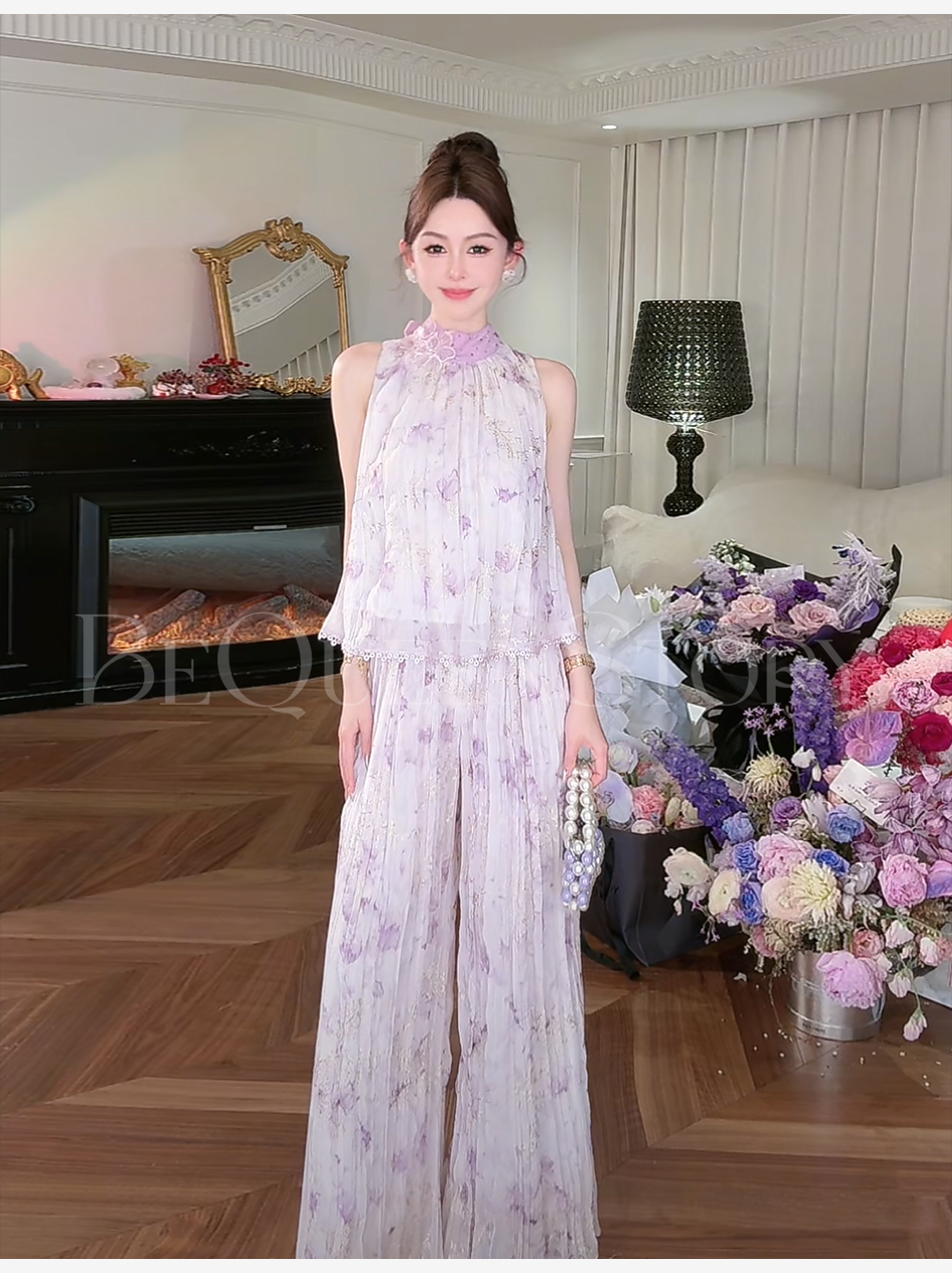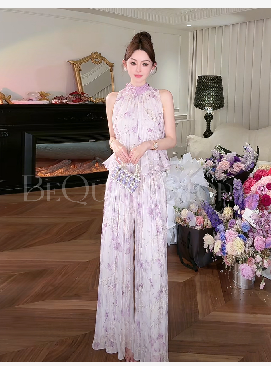 余潇潇【南池花语】2025新品印花压褶绣花漏肩挂脖连衣裙夏季紫色