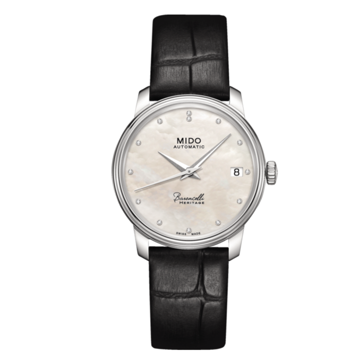镜面 材质 | 蓝宝石水晶玻璃 | 表盘 | 精钢表壳 珍珠母贝表盘 镶嵌13颗钻石时标(0.017克拉) 大三针 日期显示 镶钻时标 透底 |