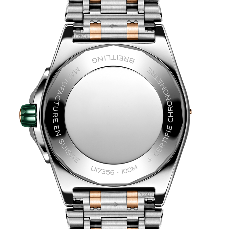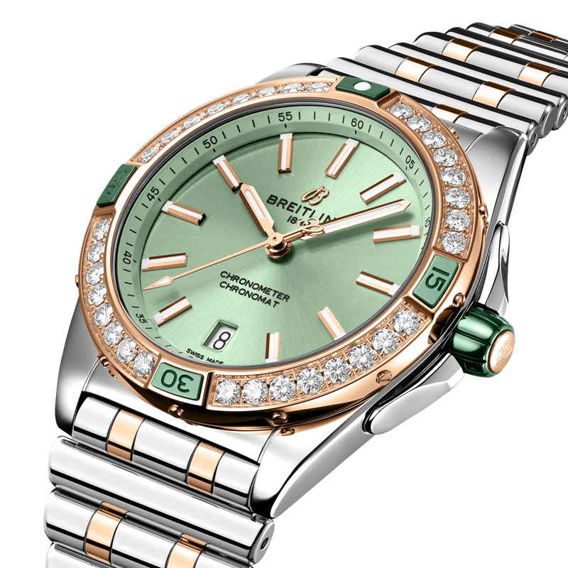 镜面 材质 | 双面防反光弧面蓝宝石表镜 | 表盘 | 精钢/18K玫瑰金表壳 薄荷绿色表盘,Super-LumiNova夜光刻度与指针 夜光棒状时标 棘轮式单向18K红金表圈,饰以实验室培育钻石(按可持续发展等级钻石标准培育)和陶瓷刻度 旋入式陶瓷表冠,双密封垫 日期显示 |