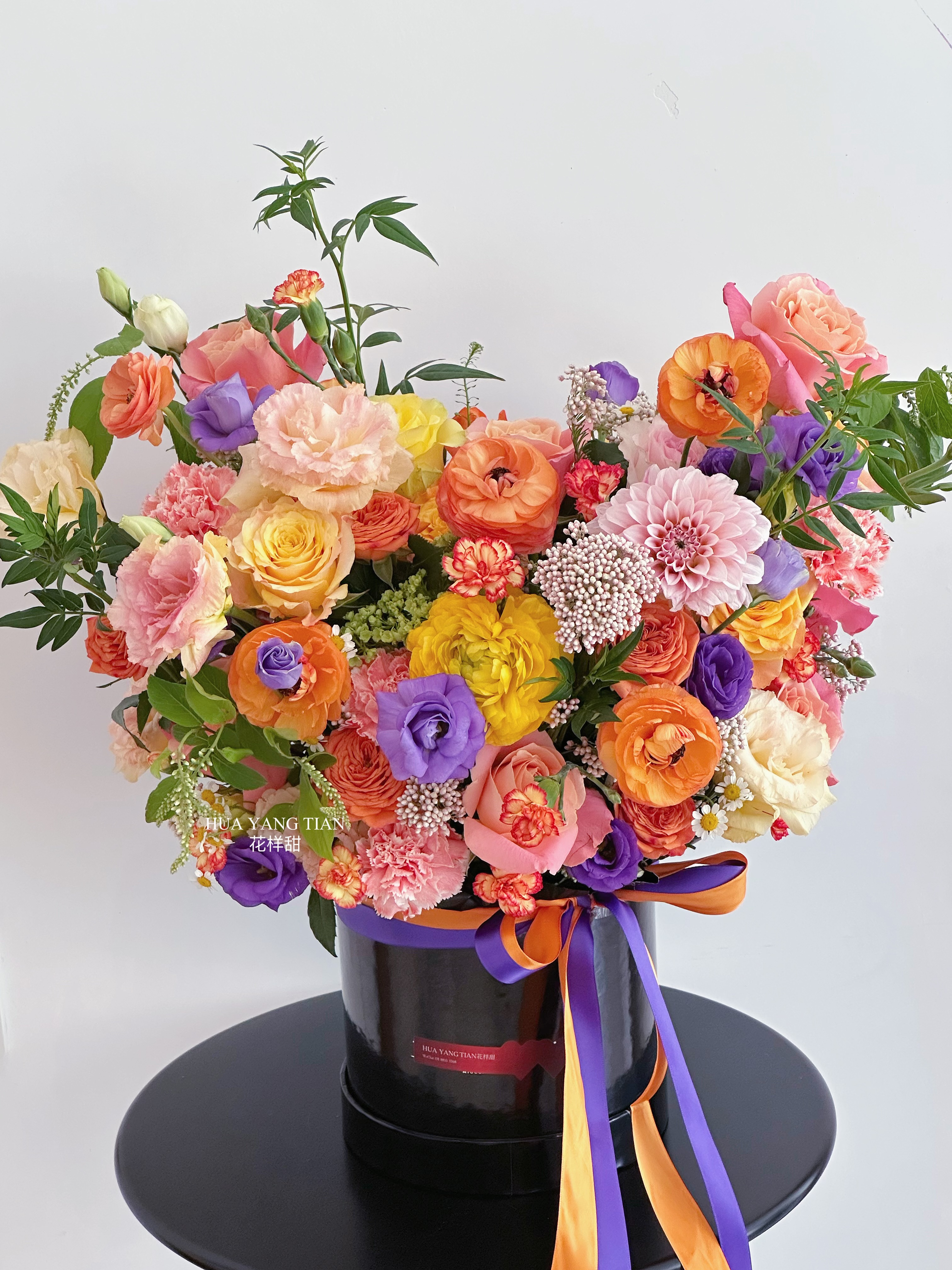 黑色桶身,搭配紫、橙双色丝带