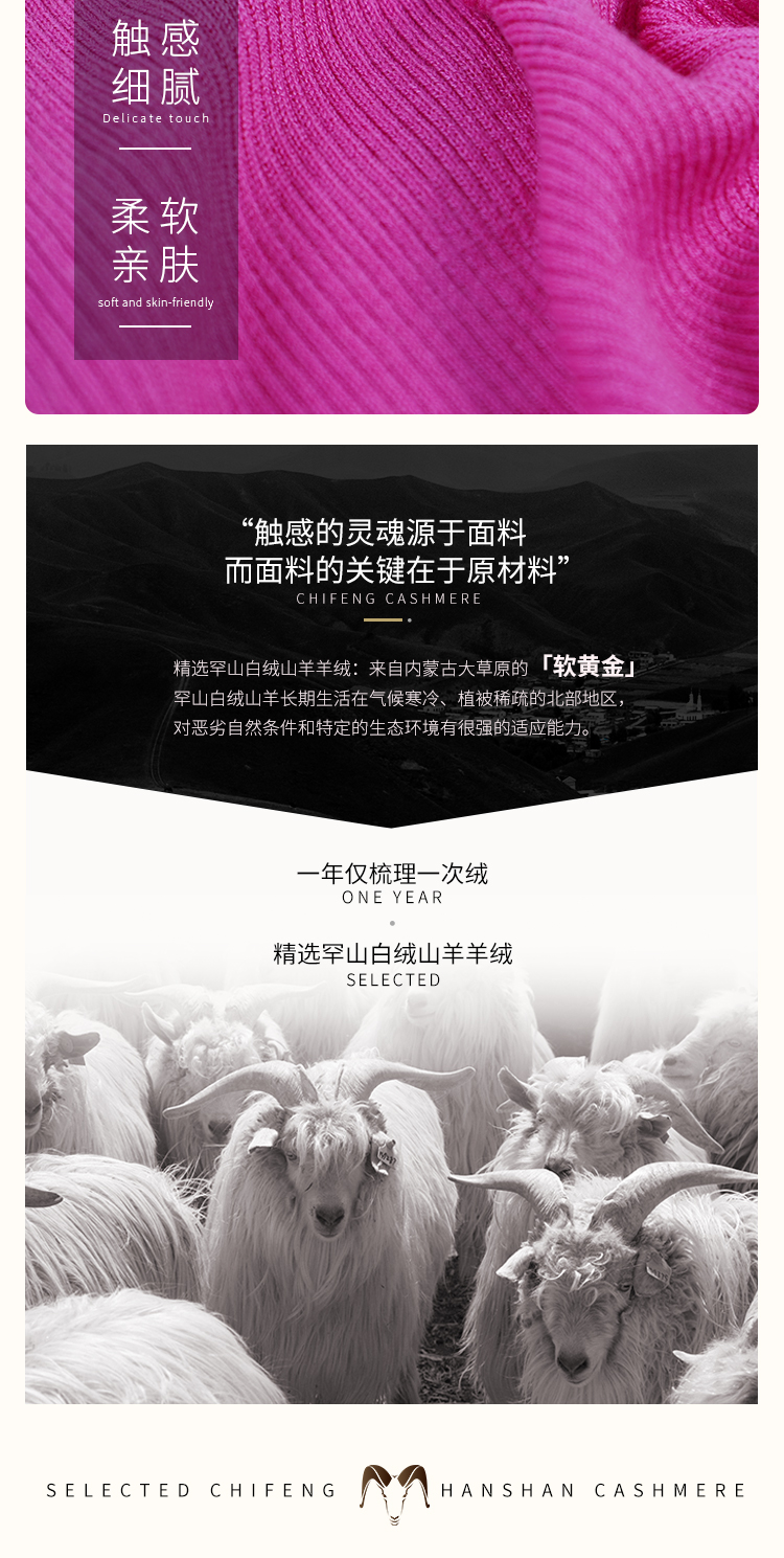 东黎羊绒是赤峰东荣集团自主品牌,自有牧场/羊绒制品全产业链优势,实现了羊绒从“牧场”到“商场”的华丽转变。