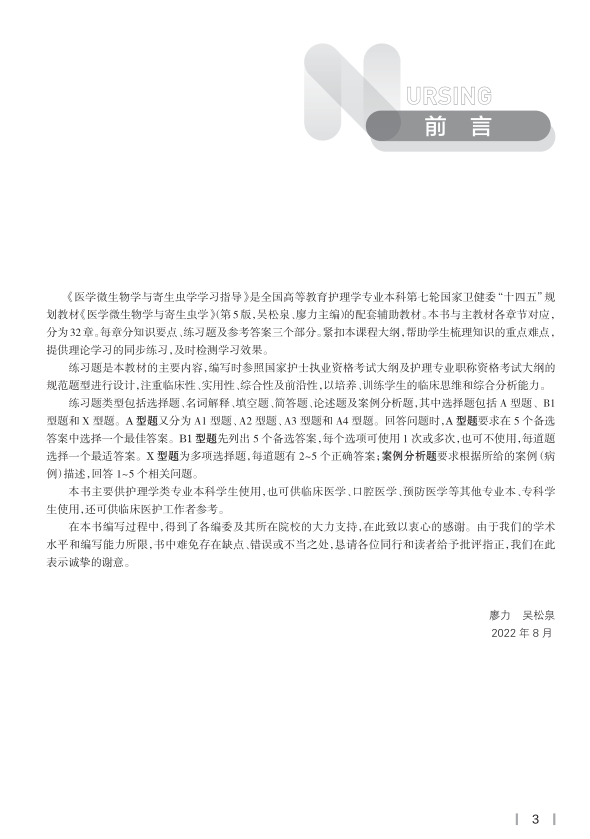 作为第七轮全国高等学校本科护理学类专业教材《医学微生物学与寄生虫学(第5版)》的配套教材,本书内容包括学习指导(包括学习目标和知识要点)和练习题及参考答案三部分;既有理论指导,也有学习指南,所以是学生学习的助手;其中学习要点为教师授课的重点,是高度提炼知识点,也是学生学习的重难点。本书对于学生学习、温习有重要帮助;练习题包括选择题(以A1型为主)、名词解释、填空题、问答题、论述题等,习题内容主要体现学习目标中掌握内容,故对于学生抓重点、检验学习效果有重要作用。本书主要供本科护理学类专业学生使用,也可供医药类其他专业学生学习参考。