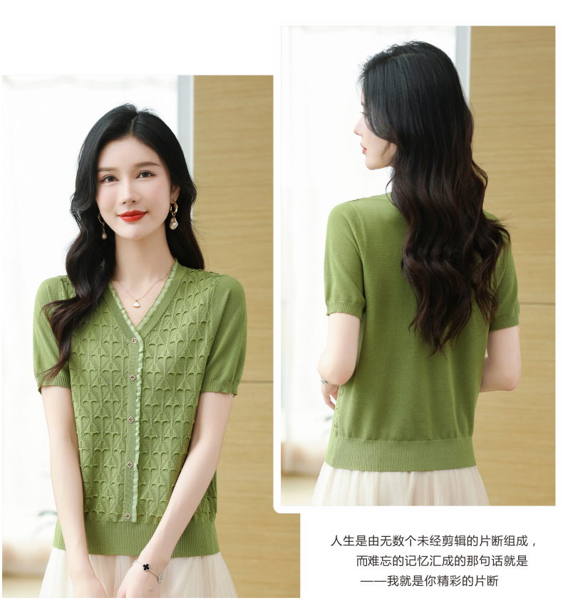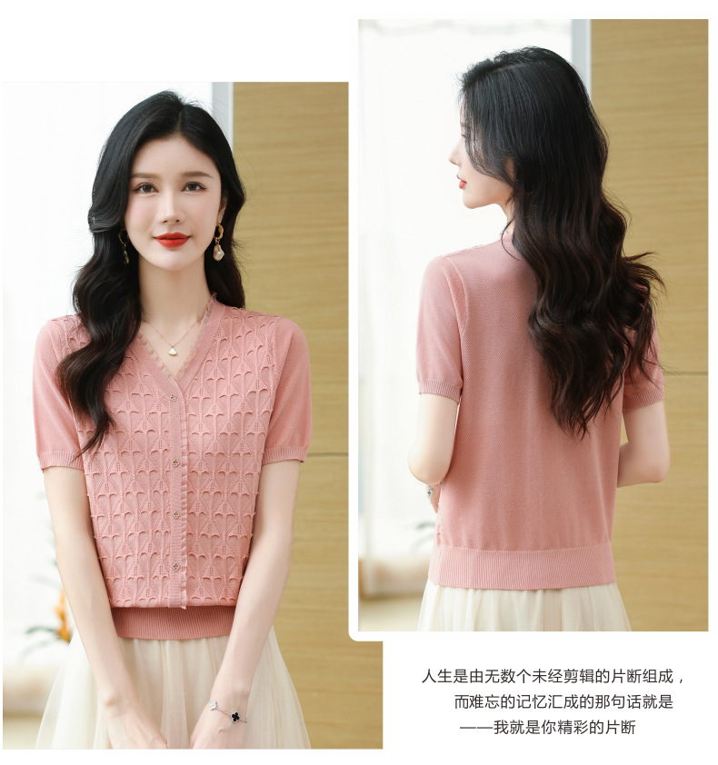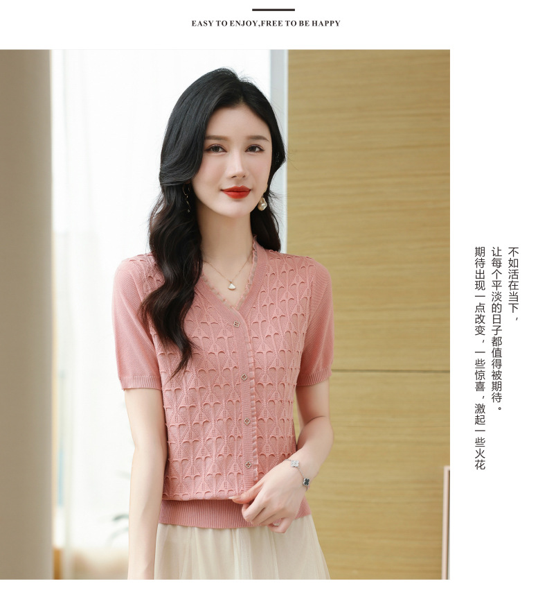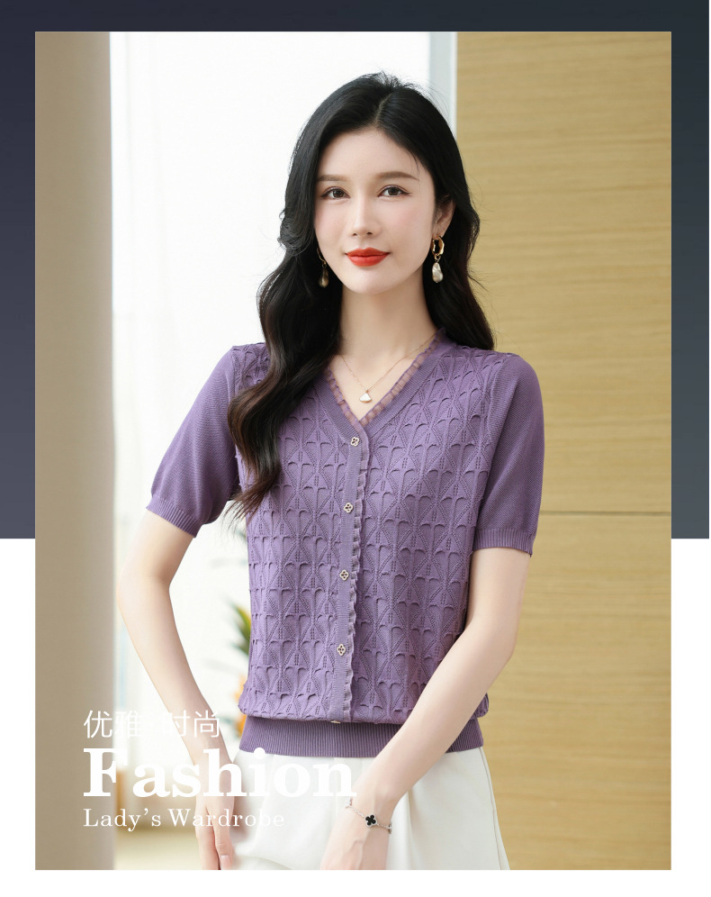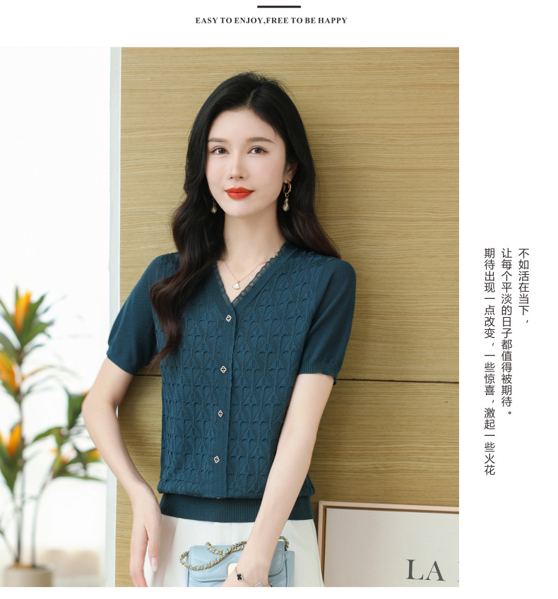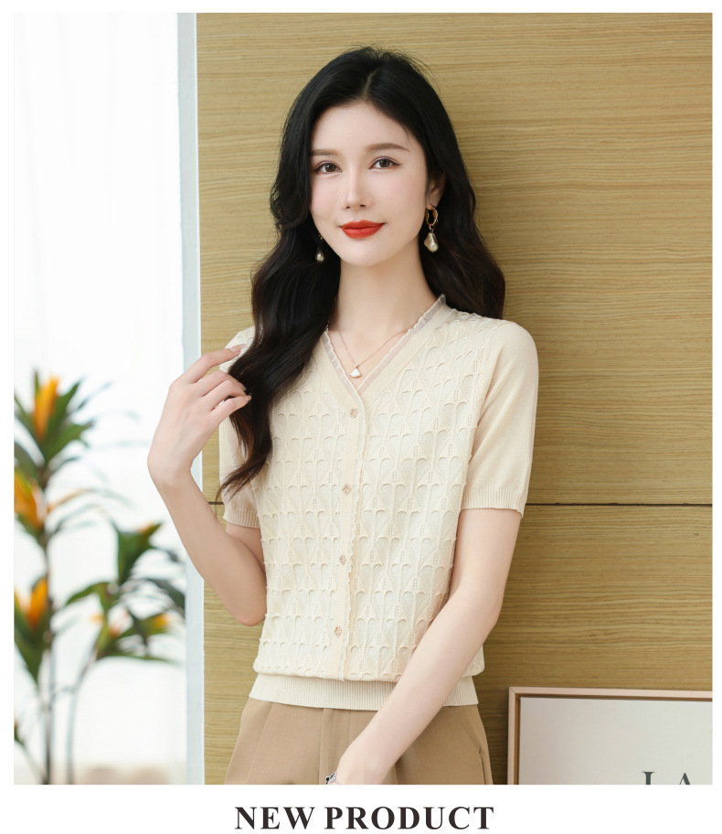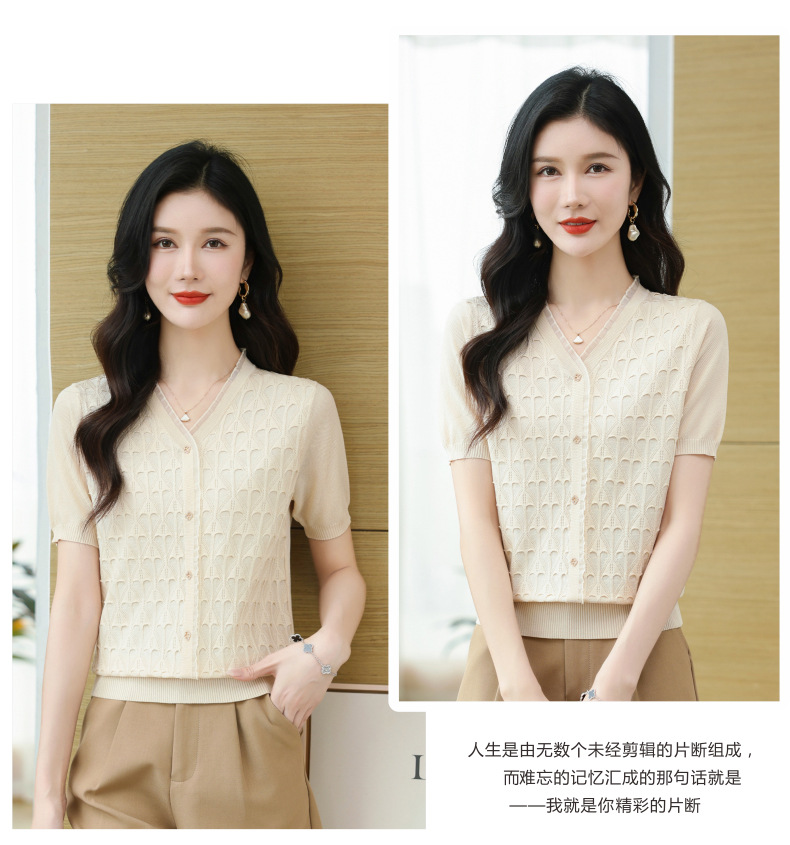V领冰丝短袖t恤,气质蕾丝针织衫上衣短款CC-101-56609