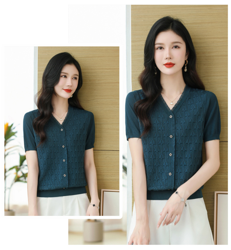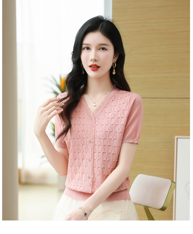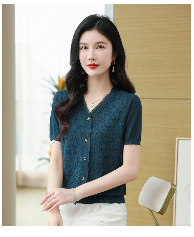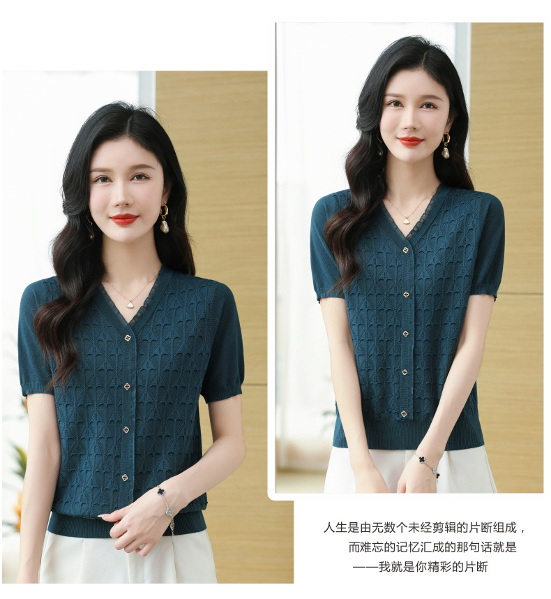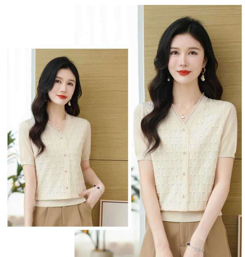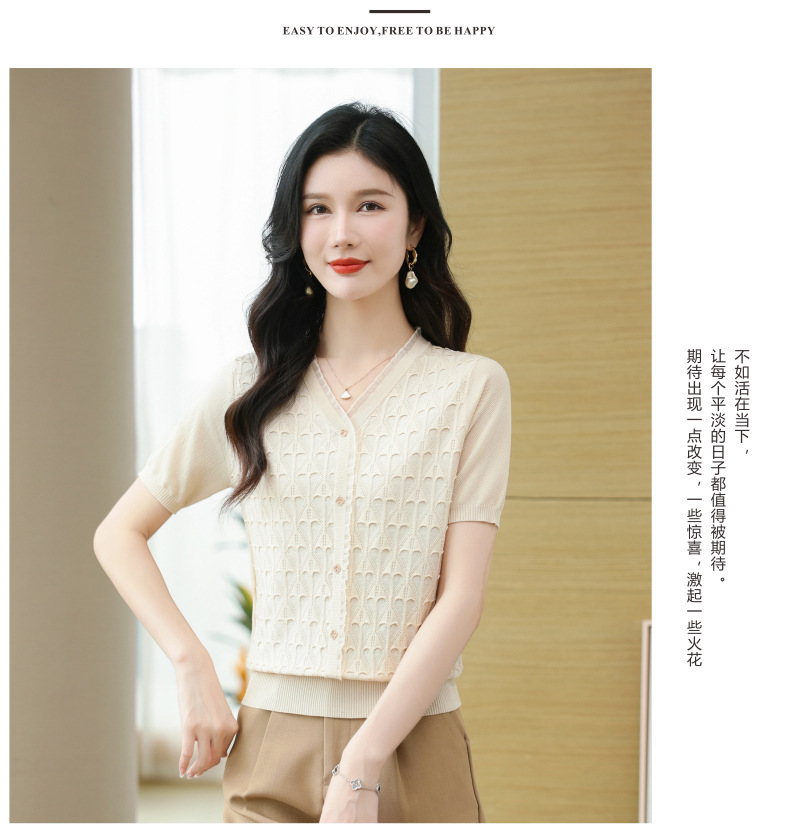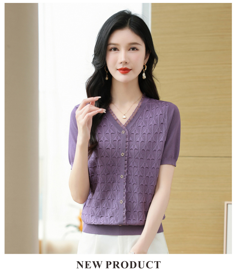 V领冰丝短袖t恤,气质蕾丝针织衫上衣短款CC-101-56609