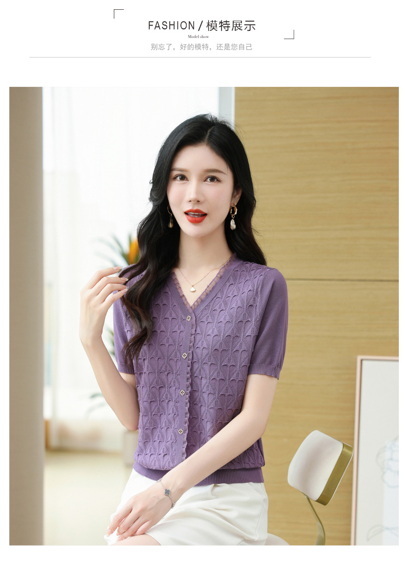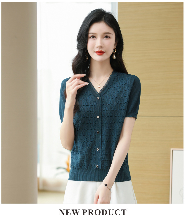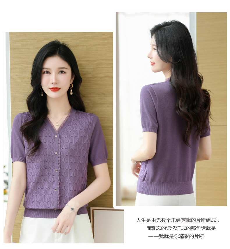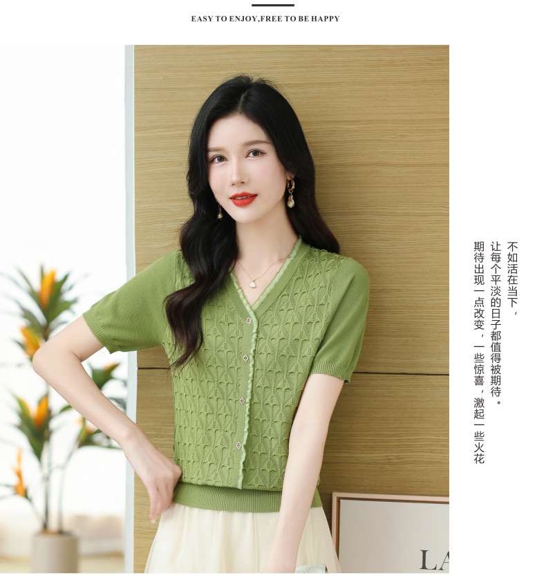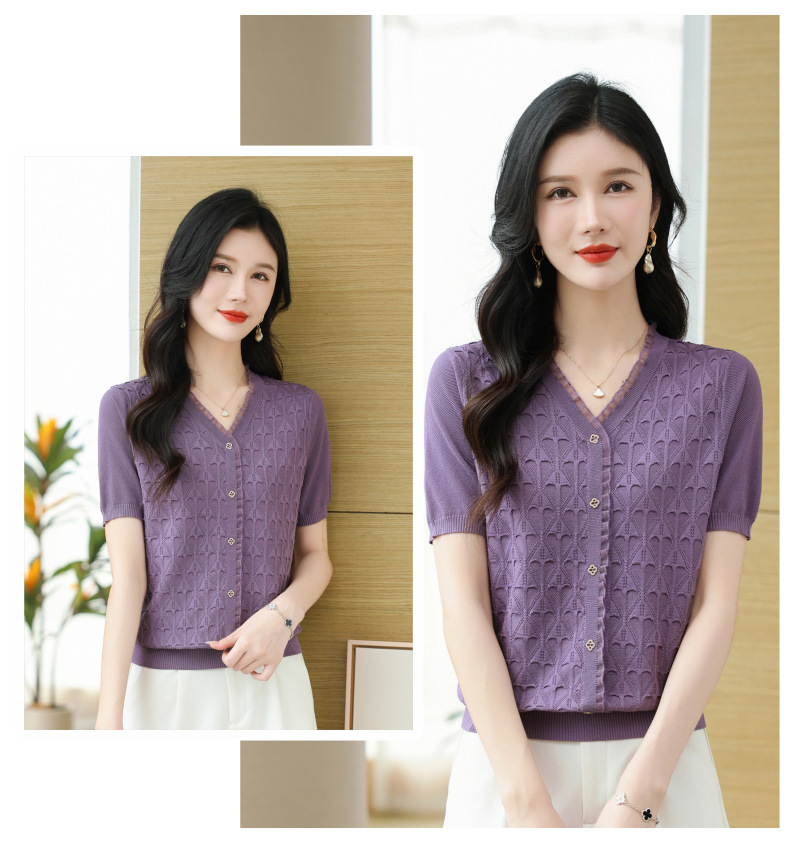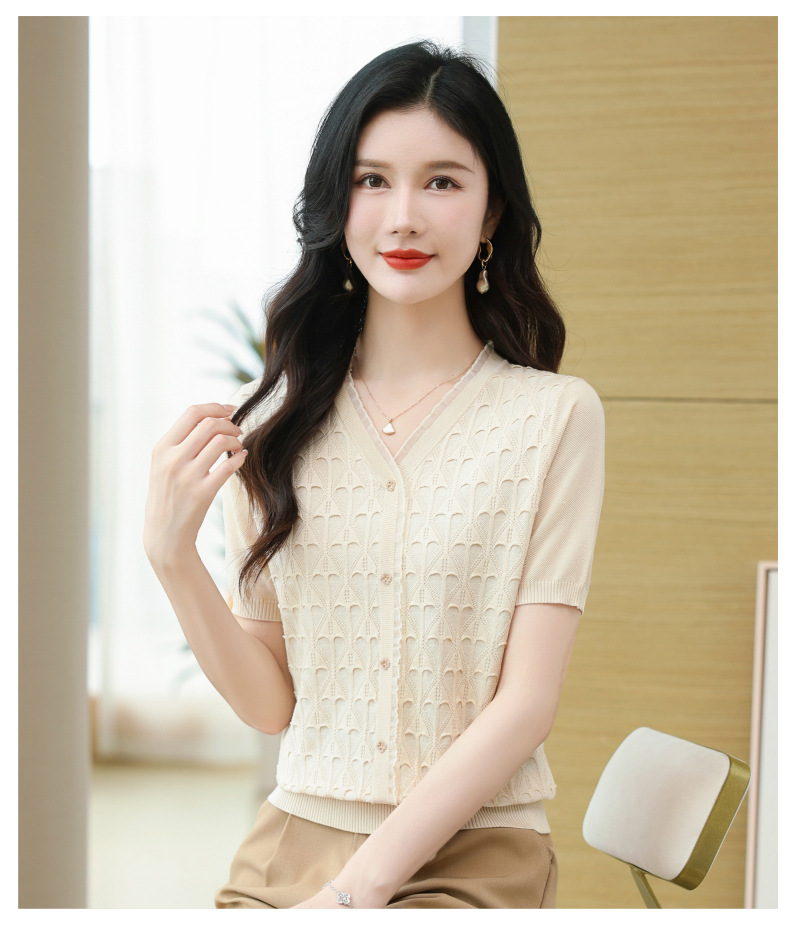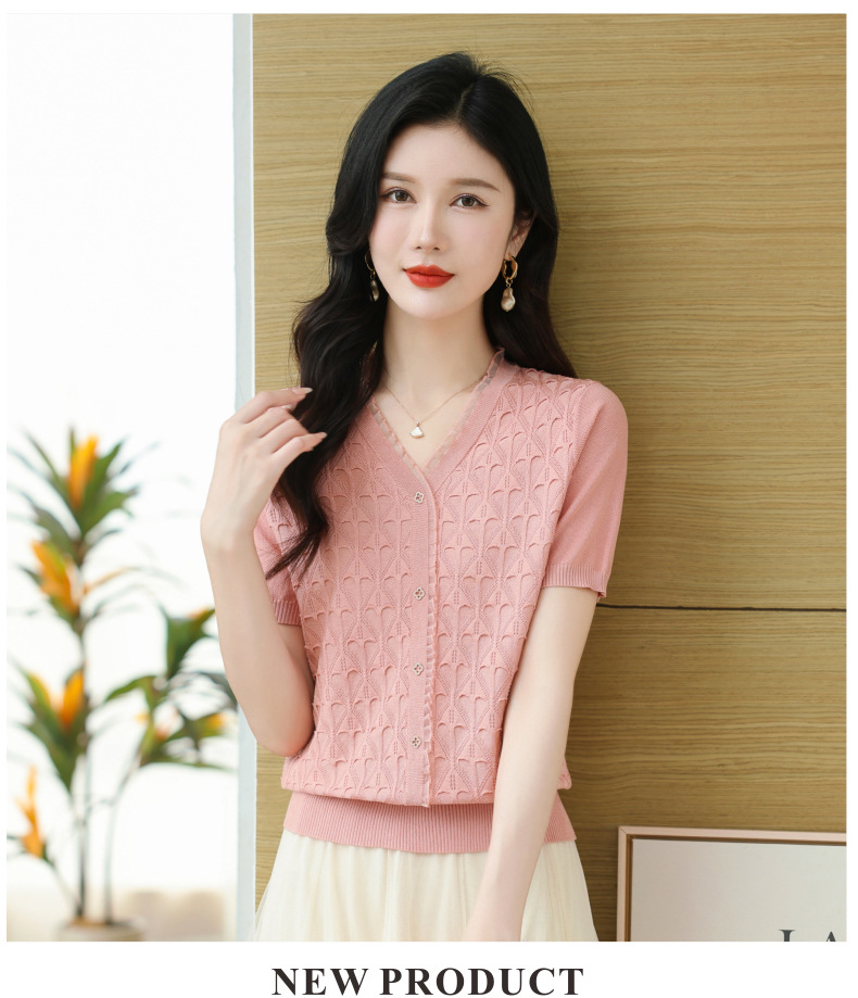 V领冰丝短袖t恤,气质蕾丝针织衫上衣短款CC-101-56609