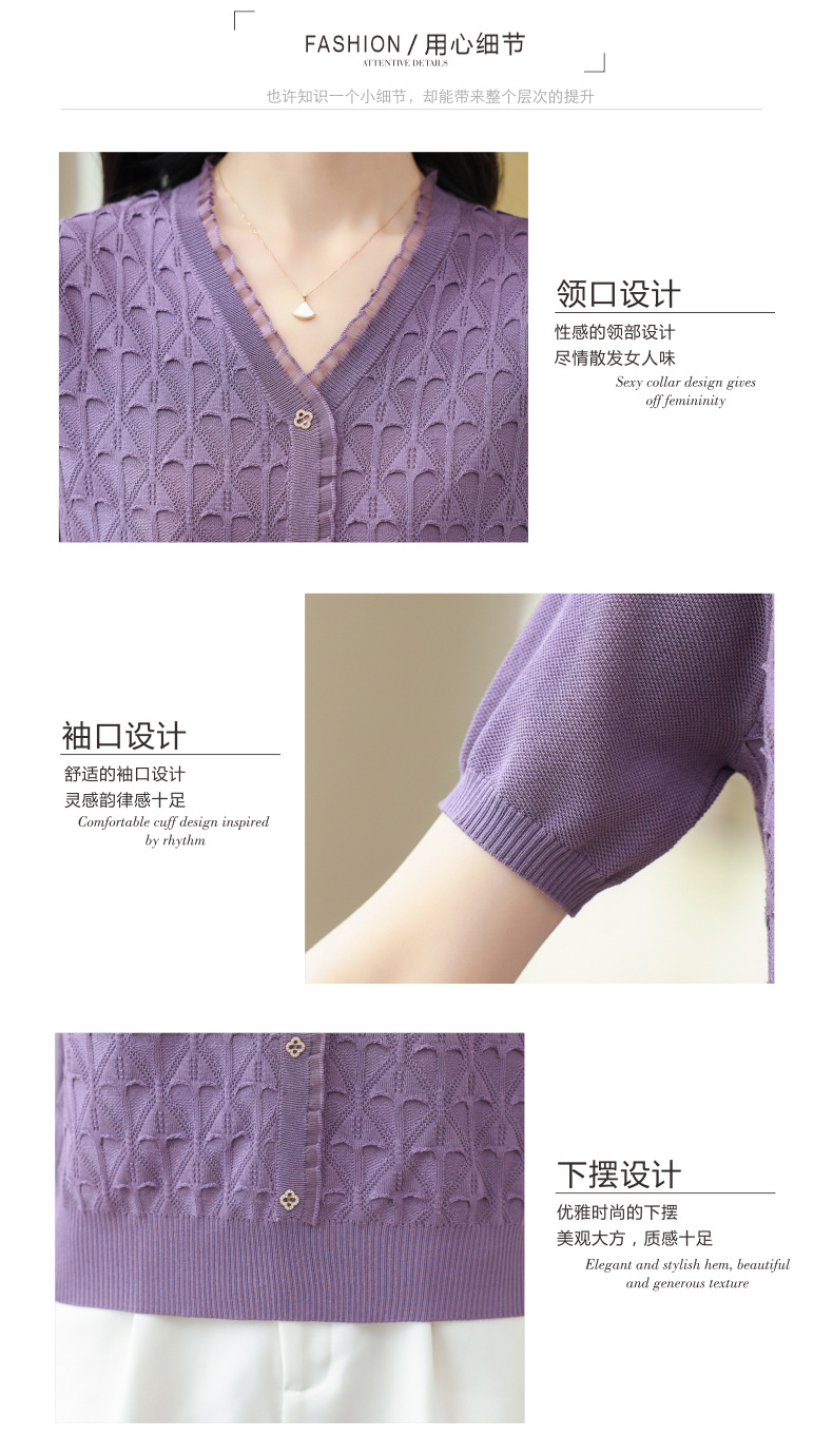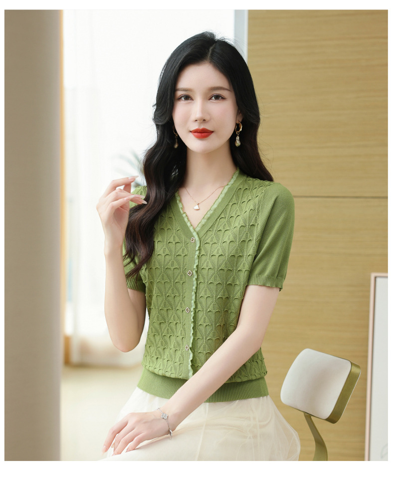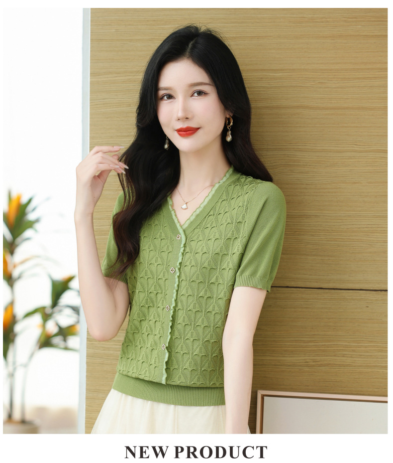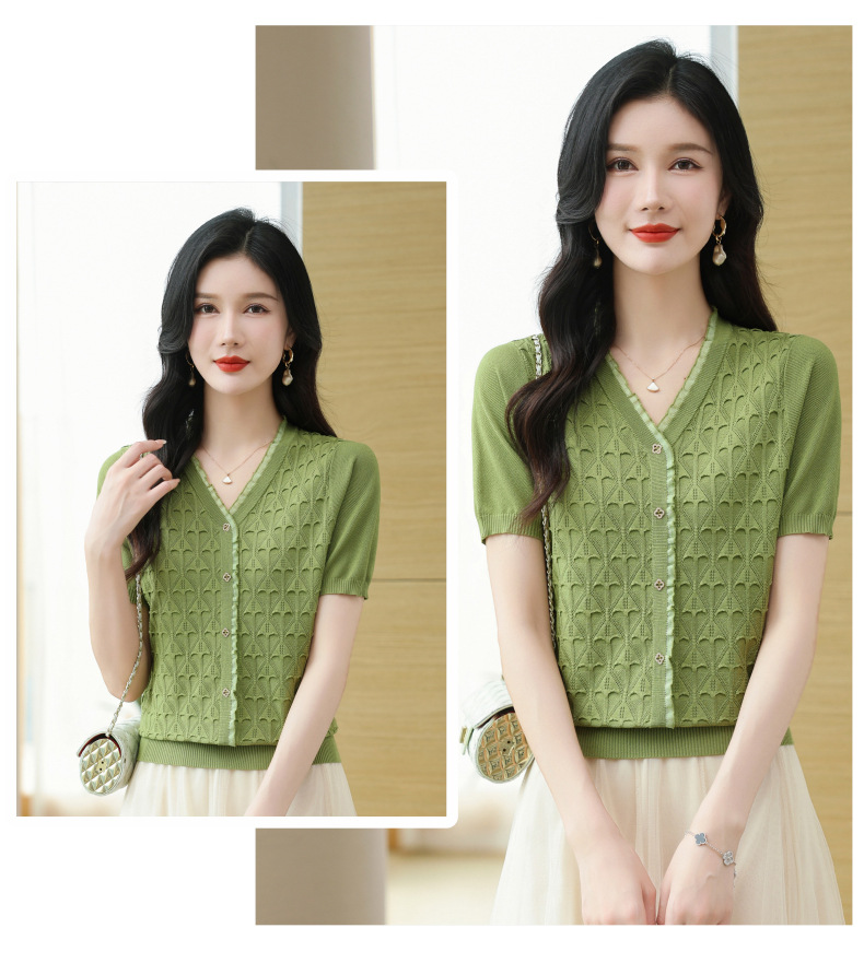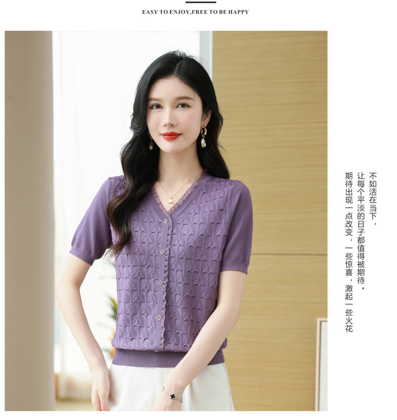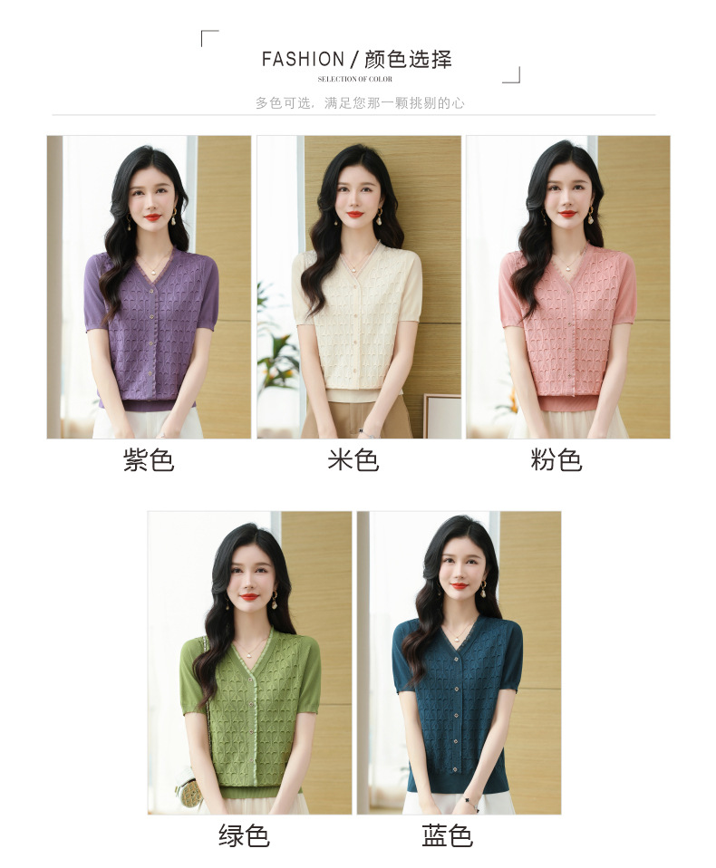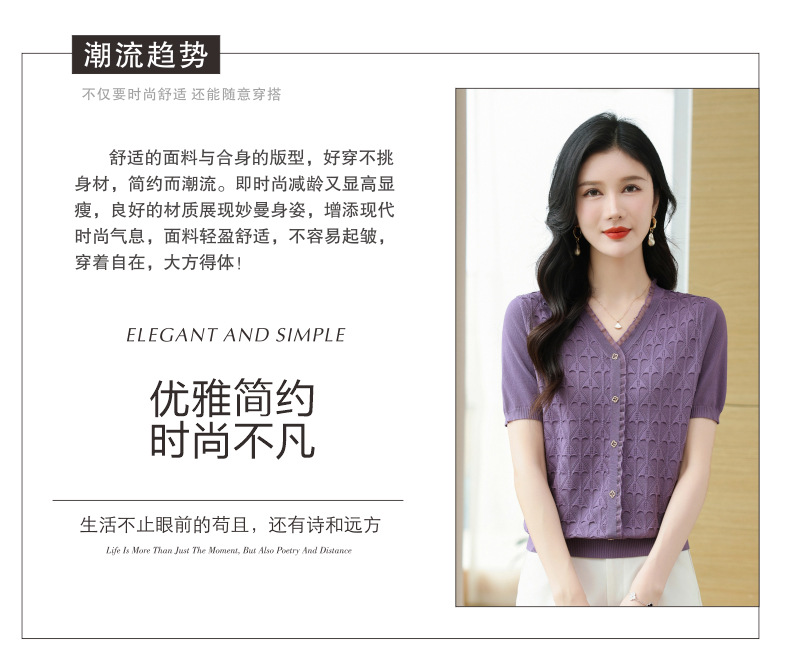 V领冰丝短袖t恤,气质蕾丝针织衫上衣短款CC-101-56609