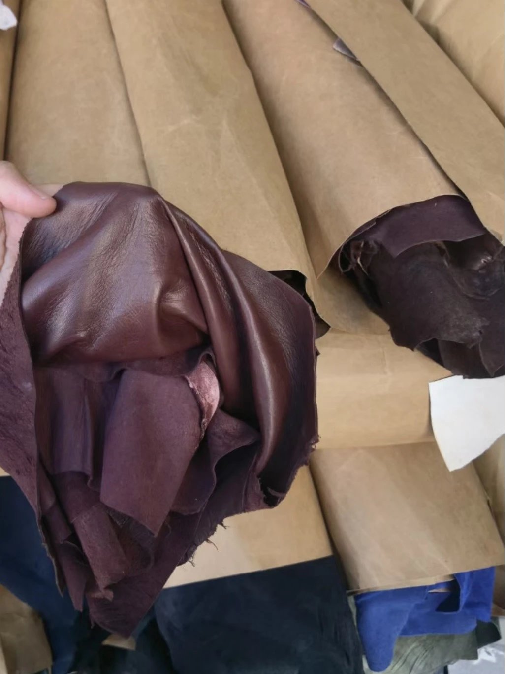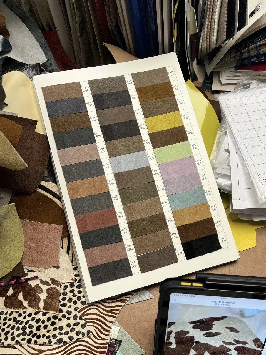 工匠手工将羊颈皮料内里覆上麂皮绒