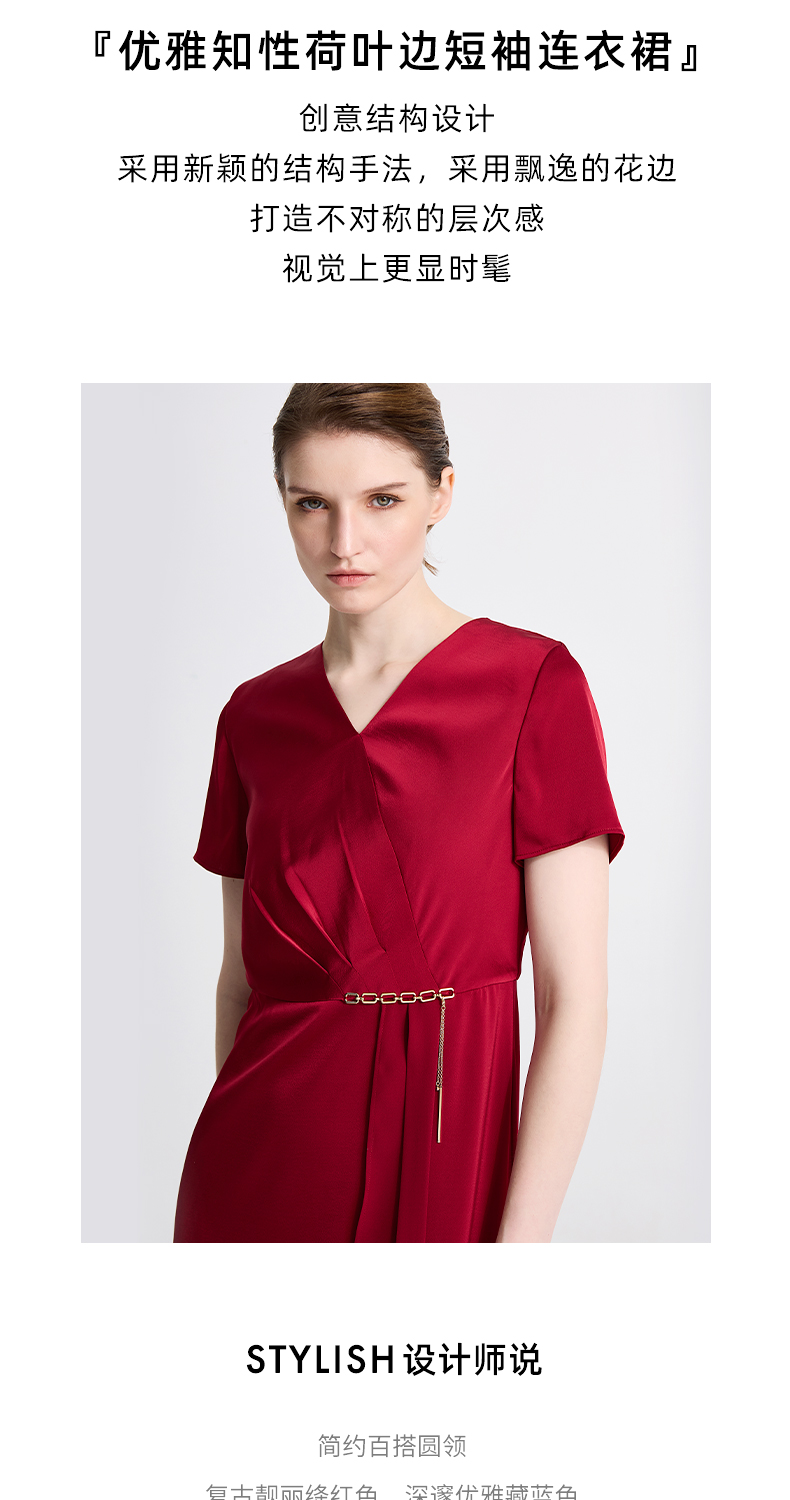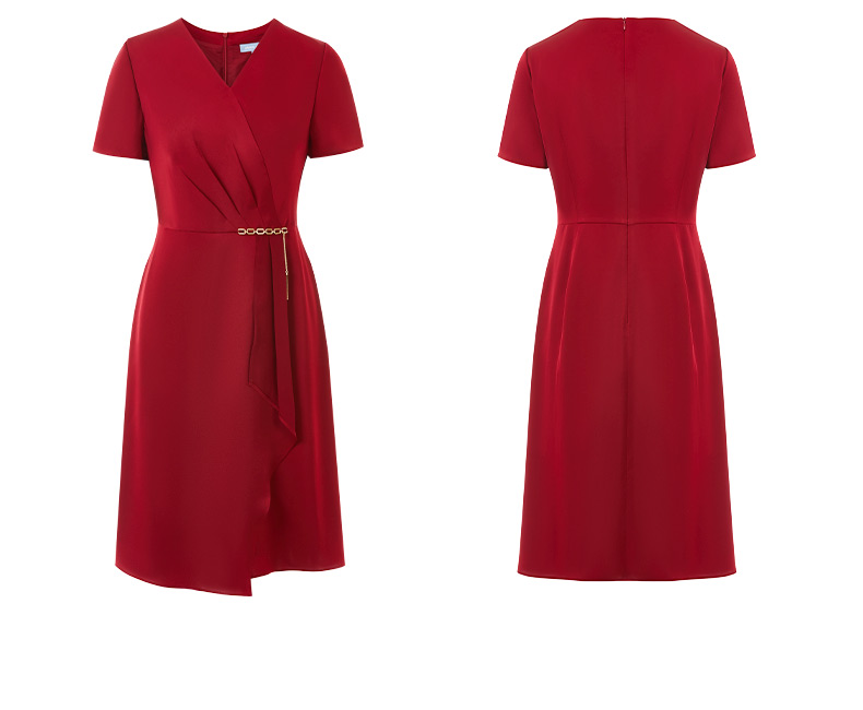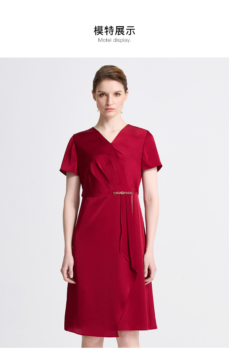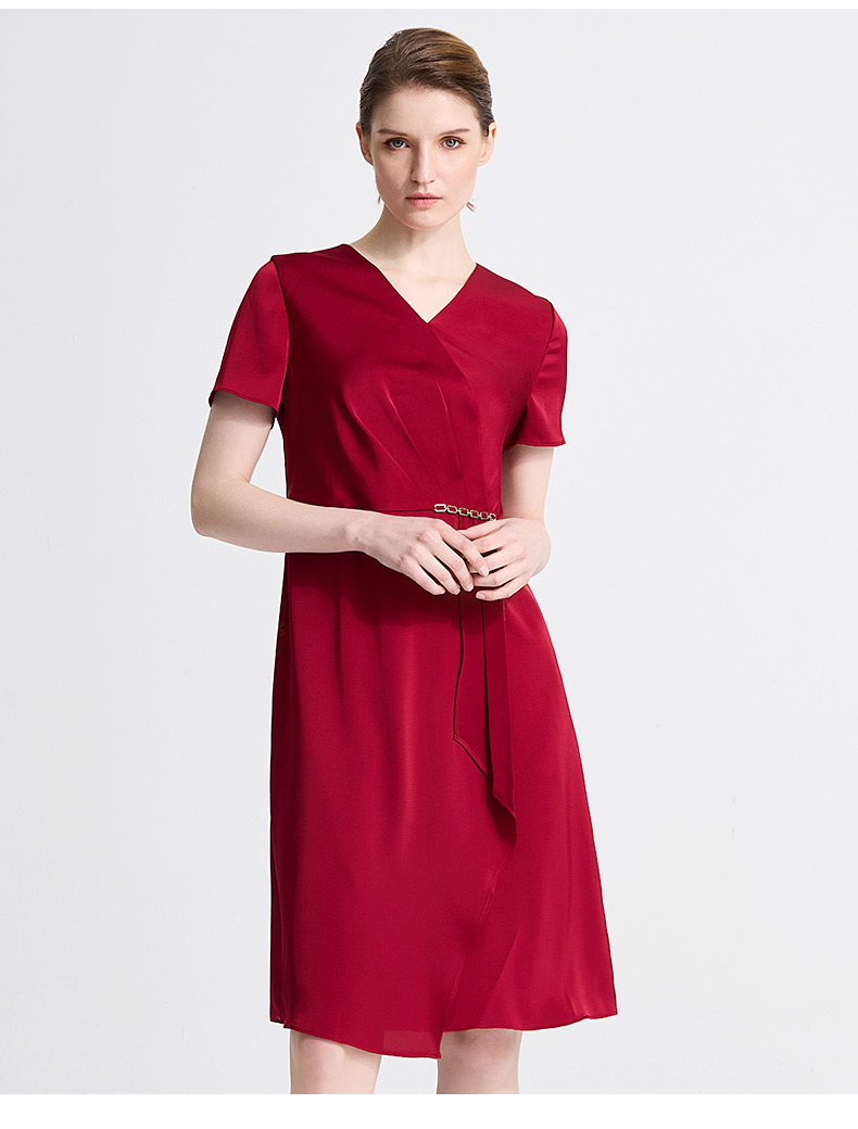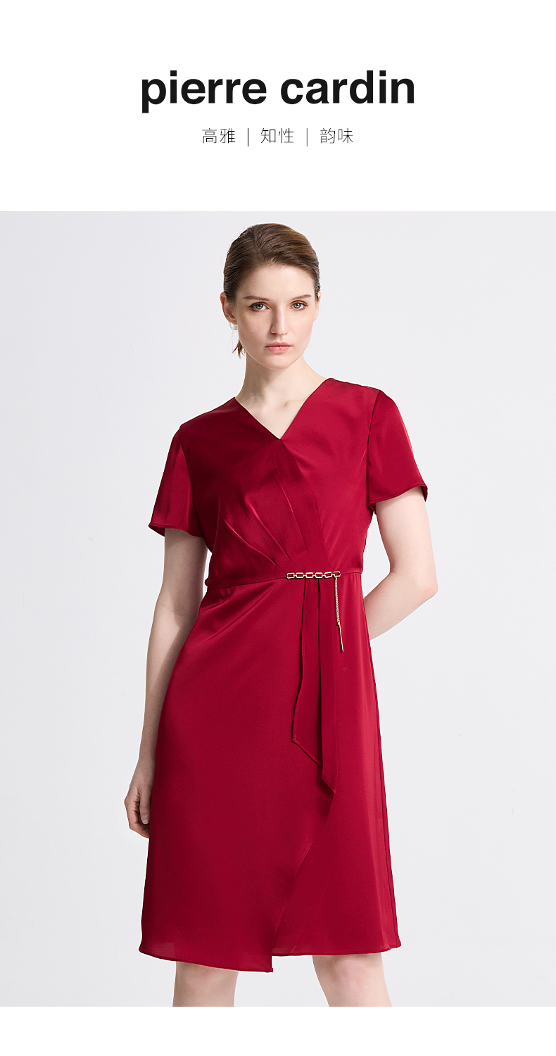 皮尔卡丹女装春季新款短袖V领藏蓝色红色气质连衣裙C41DS06