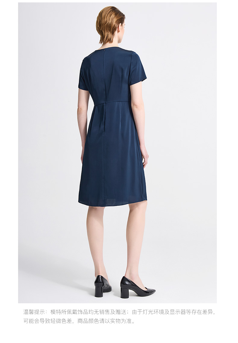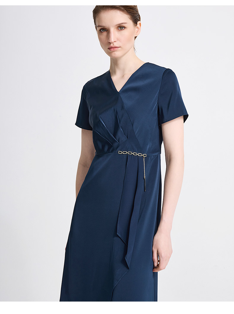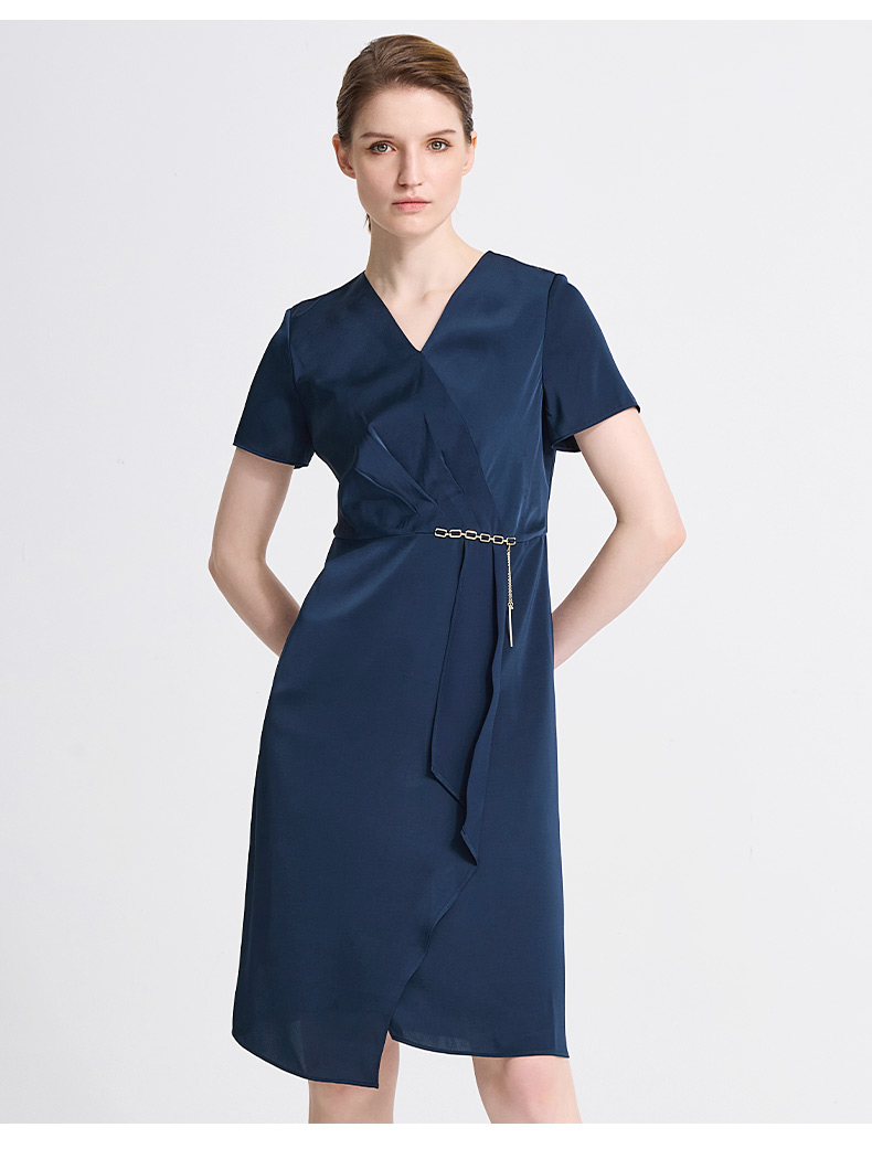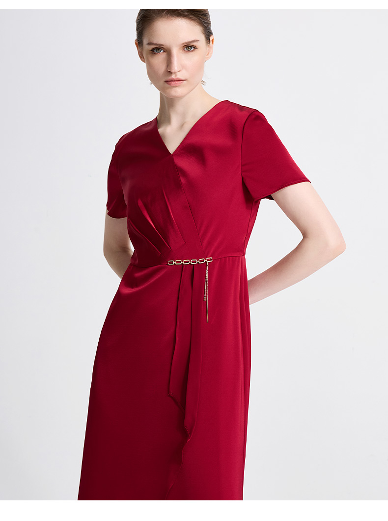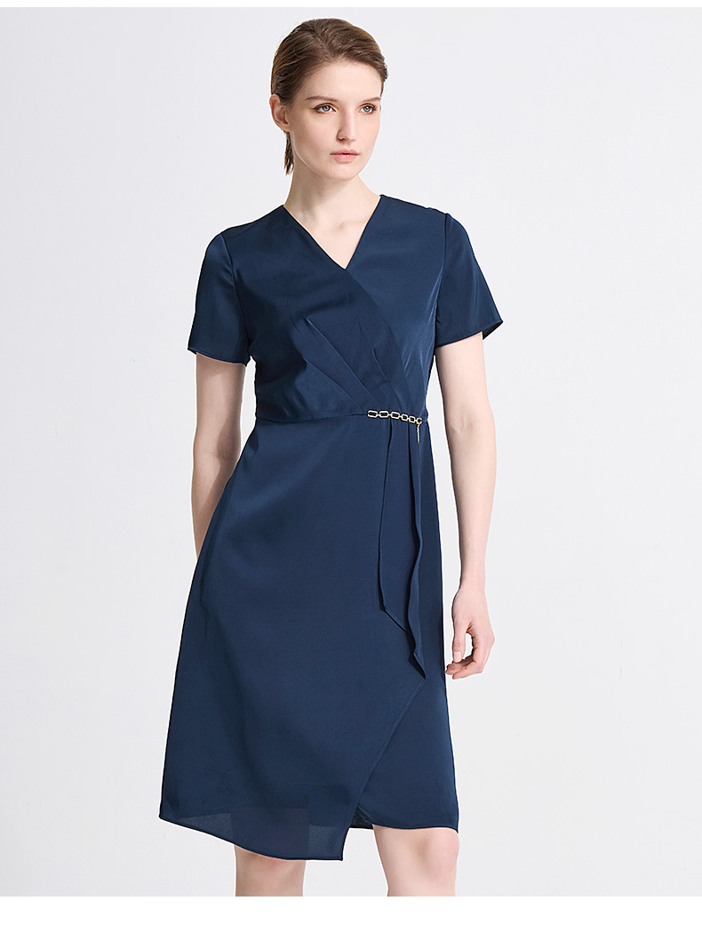 皮尔卡丹女装春季新款短袖V领藏蓝色红色气质连衣裙C41DS06