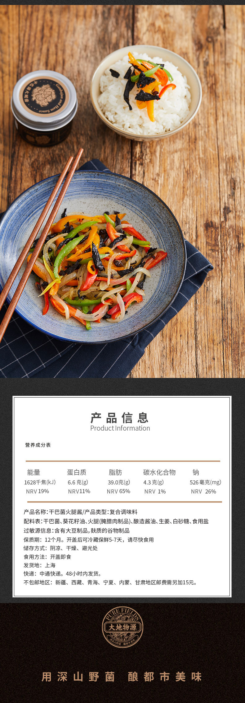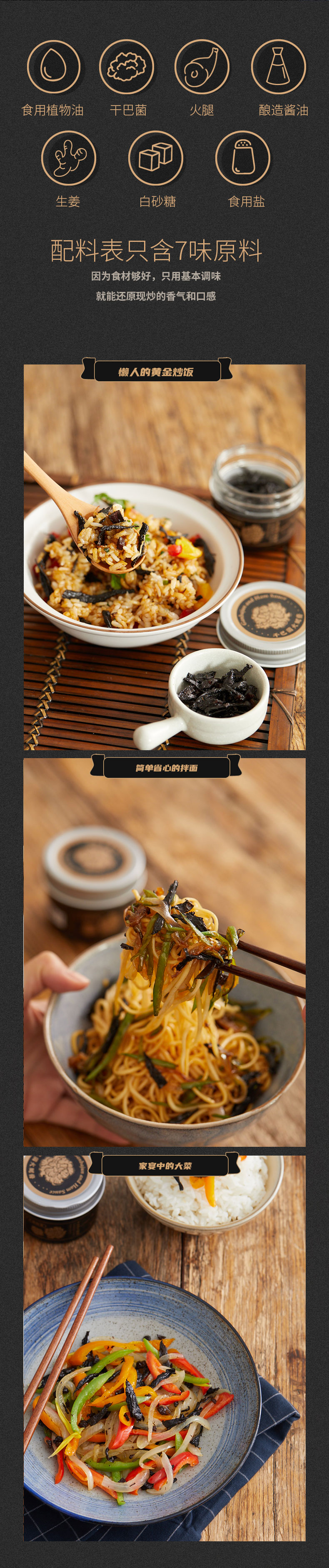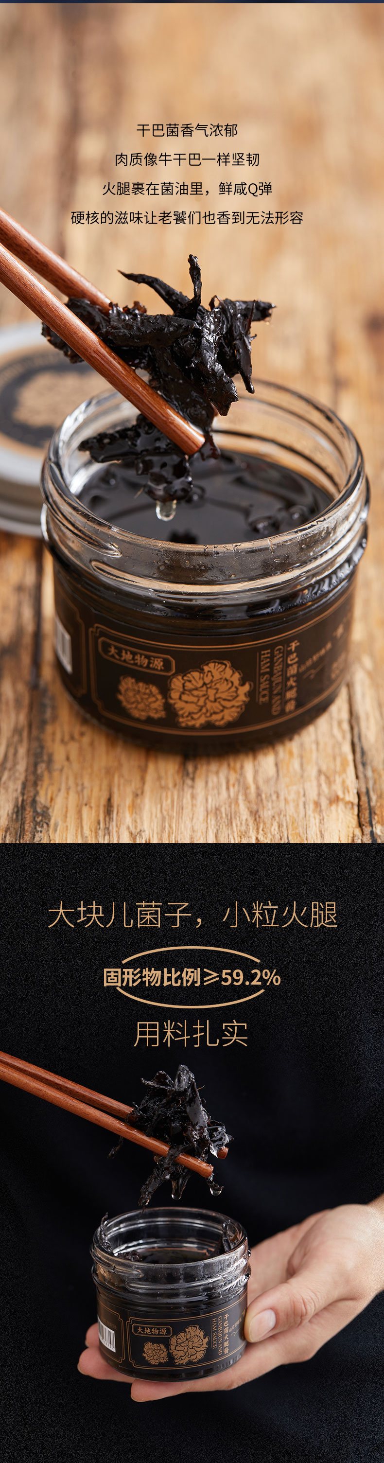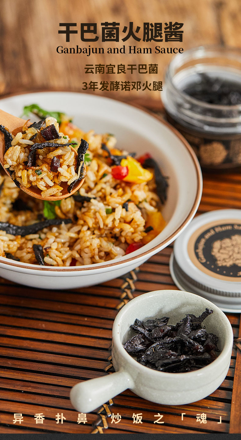 3、酱的配方,是云南美食家敢于胡乱调的,真的是送佛送到西,不仅仅是干巴菌,还搭配了三年诺邓火腿,腿香提亮菌香,美味!如果仅仅干巴菌一种,还需要二次操作搭配使用,这样一罐油浸干巴菌火腿,可以直接炒饭拌面,完成度极高,非常方便。