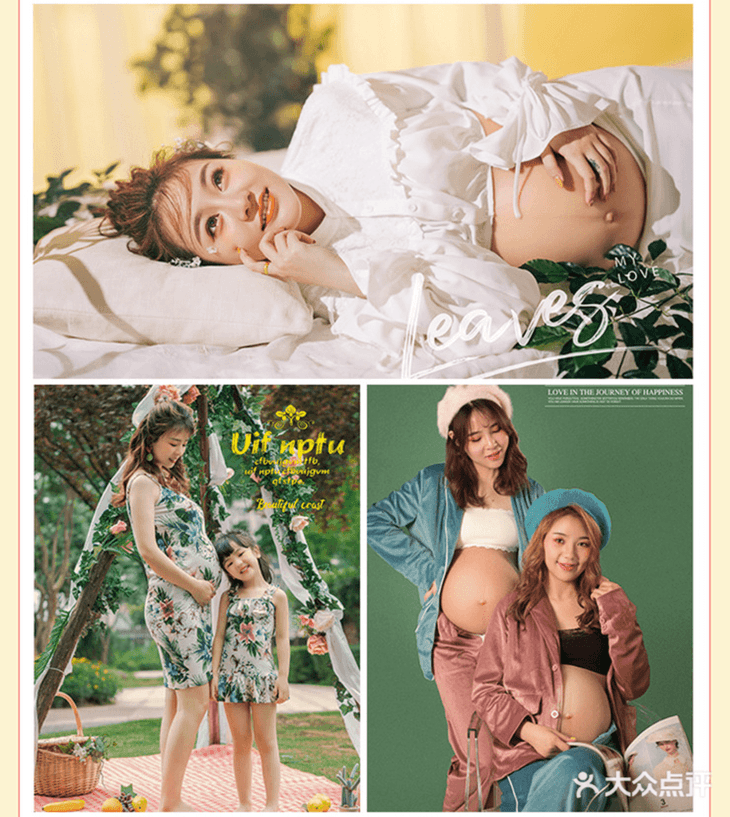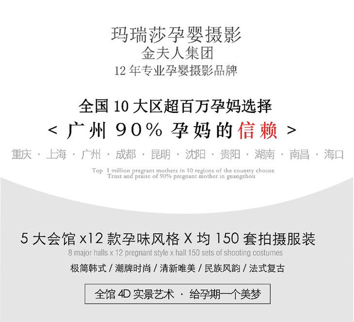 提供先生、大宝各一套服装入镜服务 拍摄团队:摄影师、化妆师、摄影助理3对1专业服务 拍摄服装:设计师团队自主设计、每周消毒、清洁卫生 化妆用品:孕妇专用、安全健康,让准妈妈用的更放心 拍摄环境:温馨舒适干净整洁恒温系统,保持管内舒适度