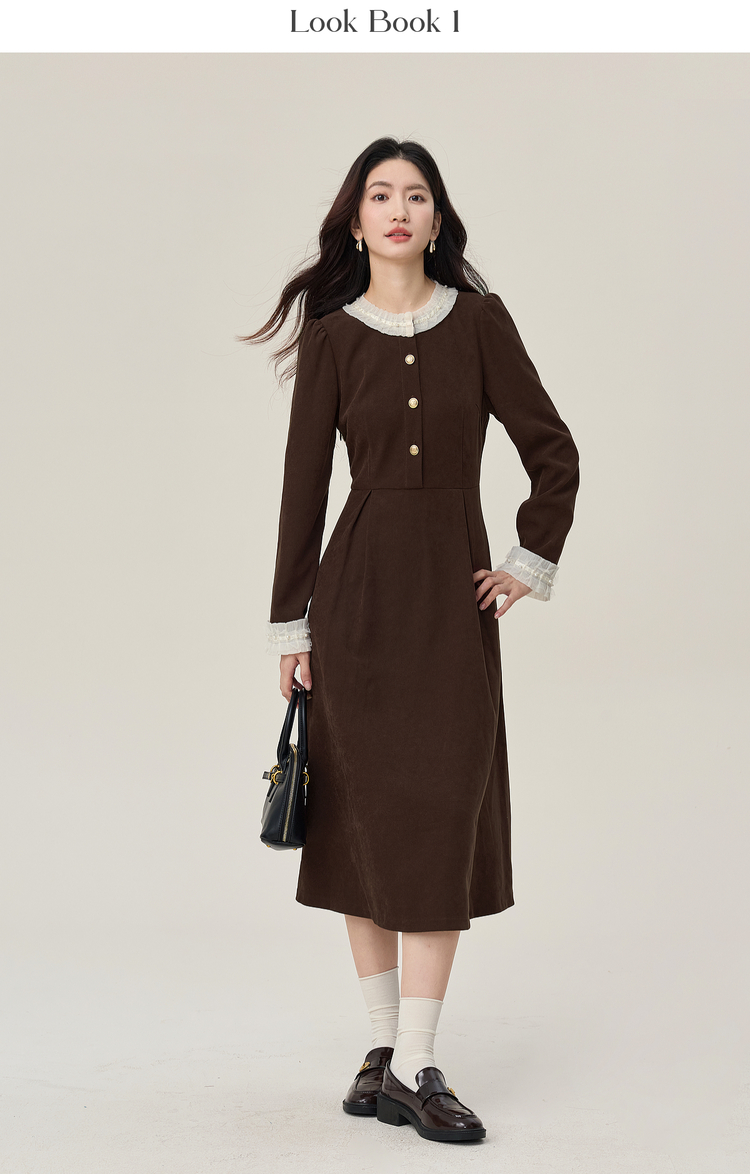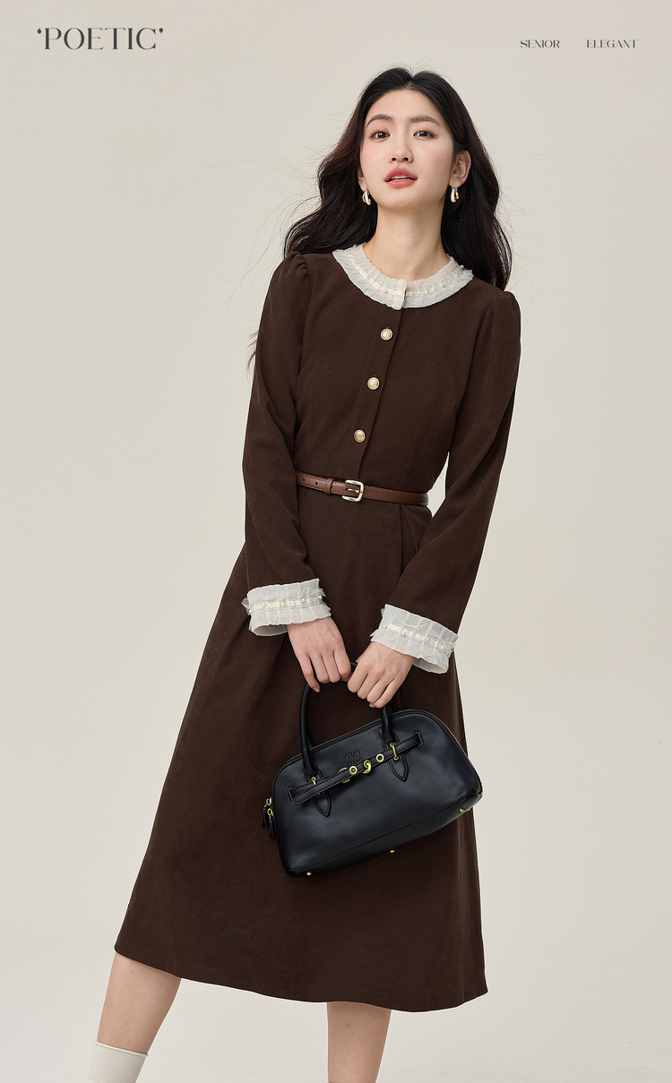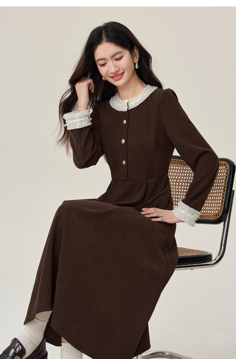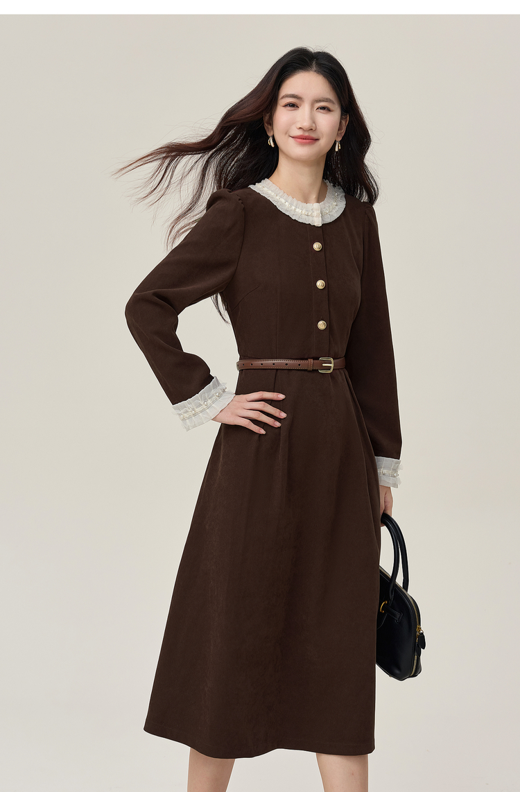 【年货节】熙世界2025秋冬新款千金赫本风磨毛连衣裙女长袖法式优雅收腰裙子