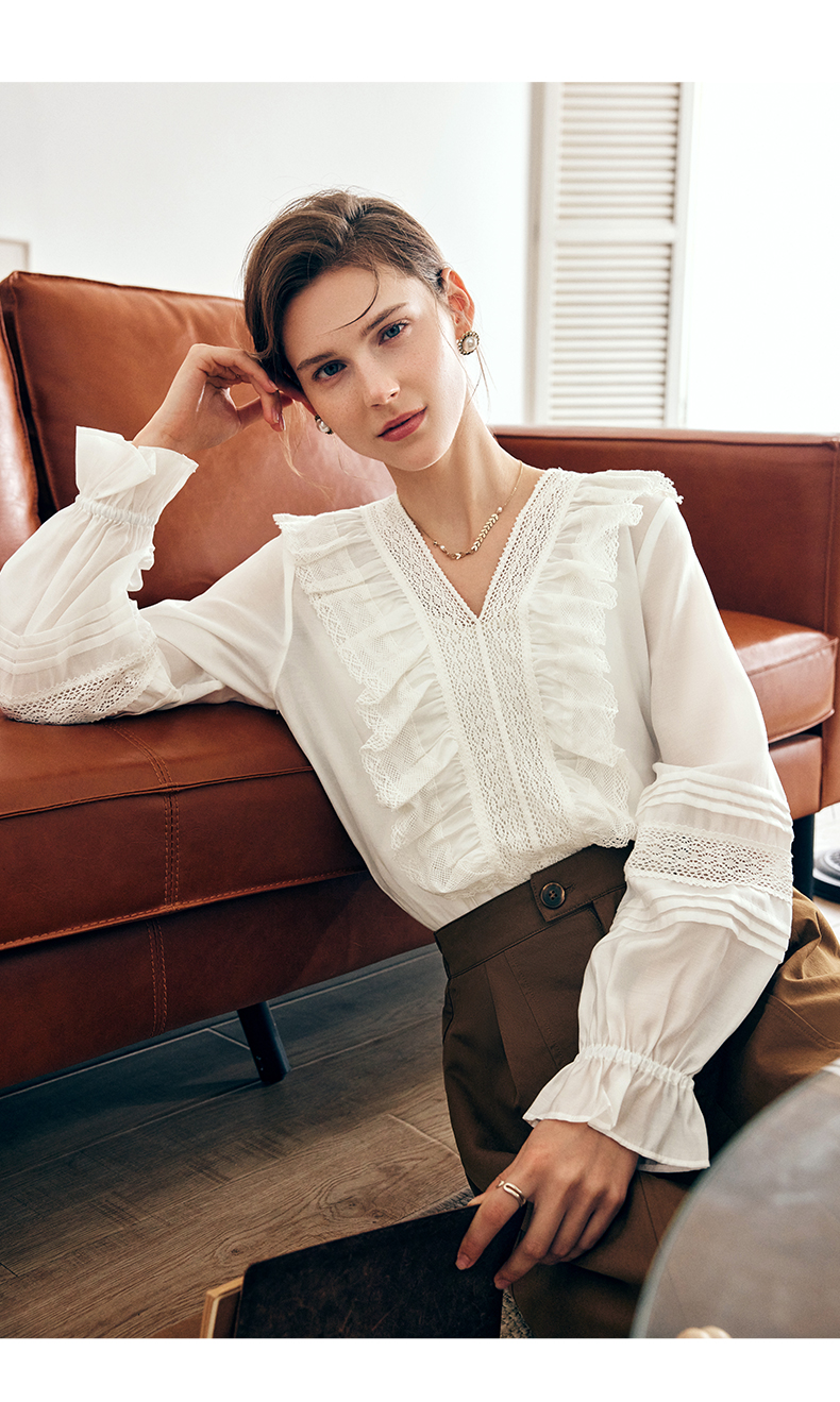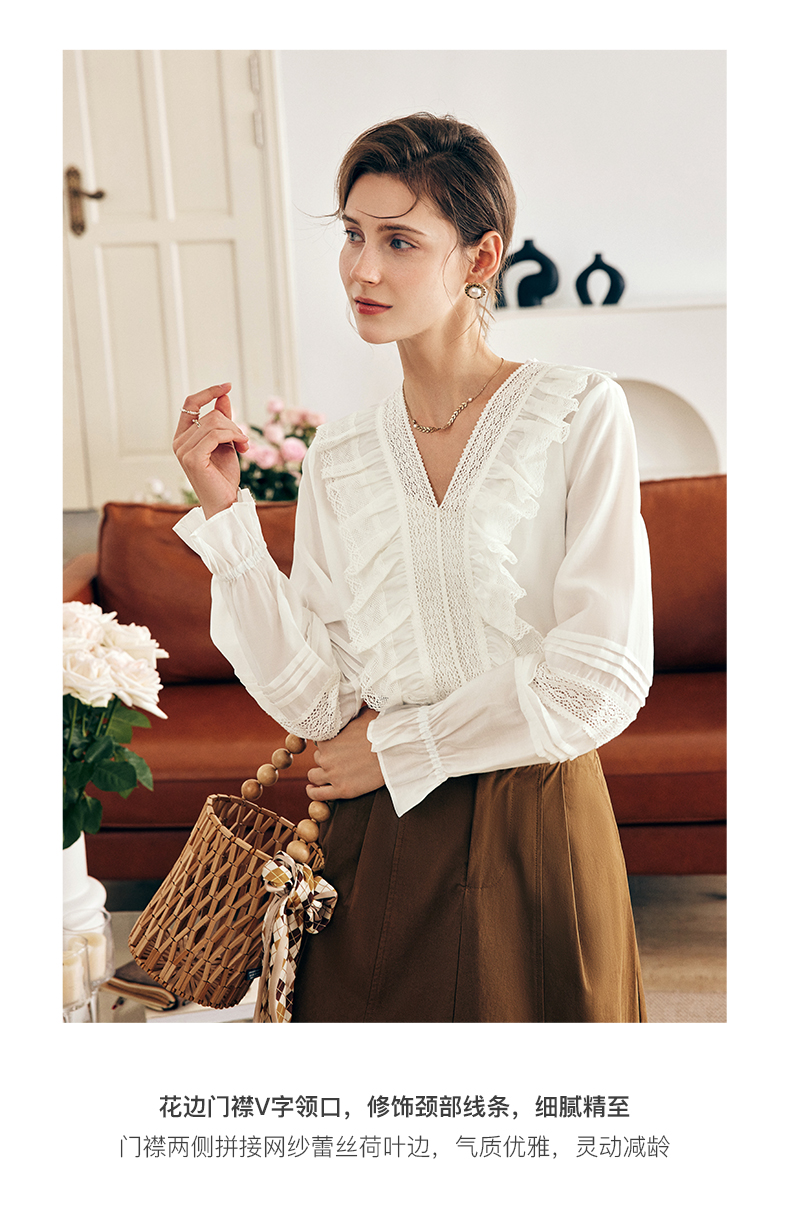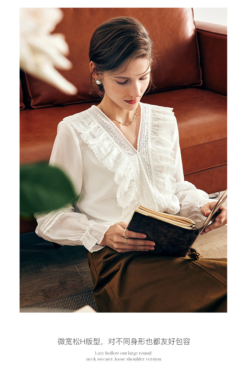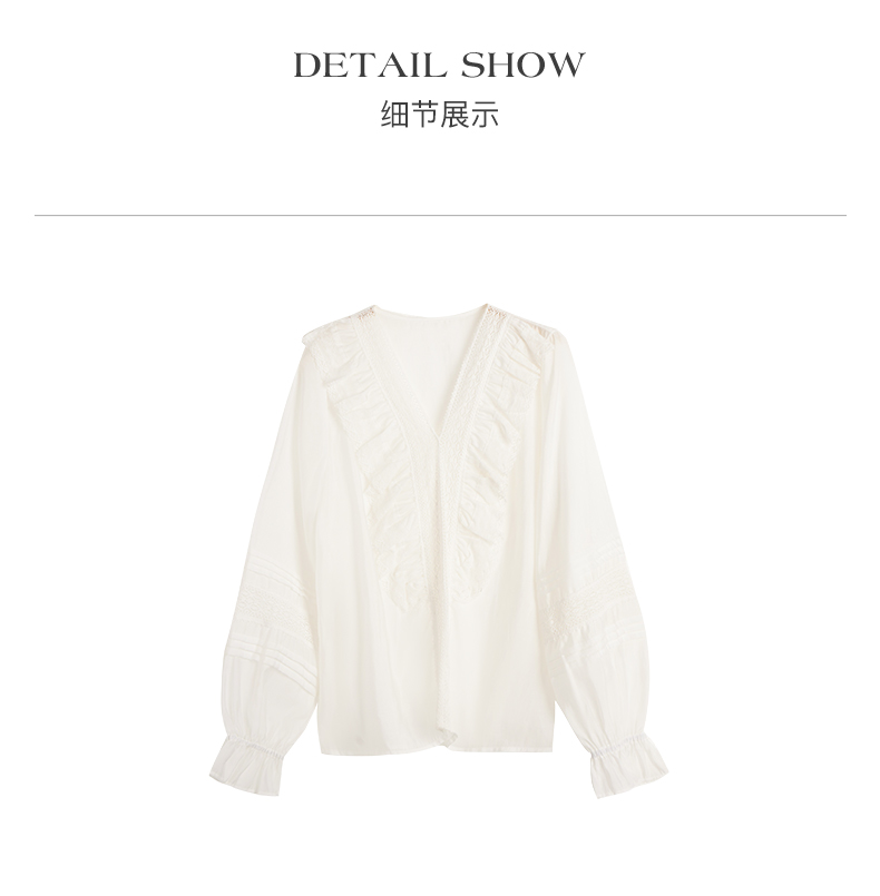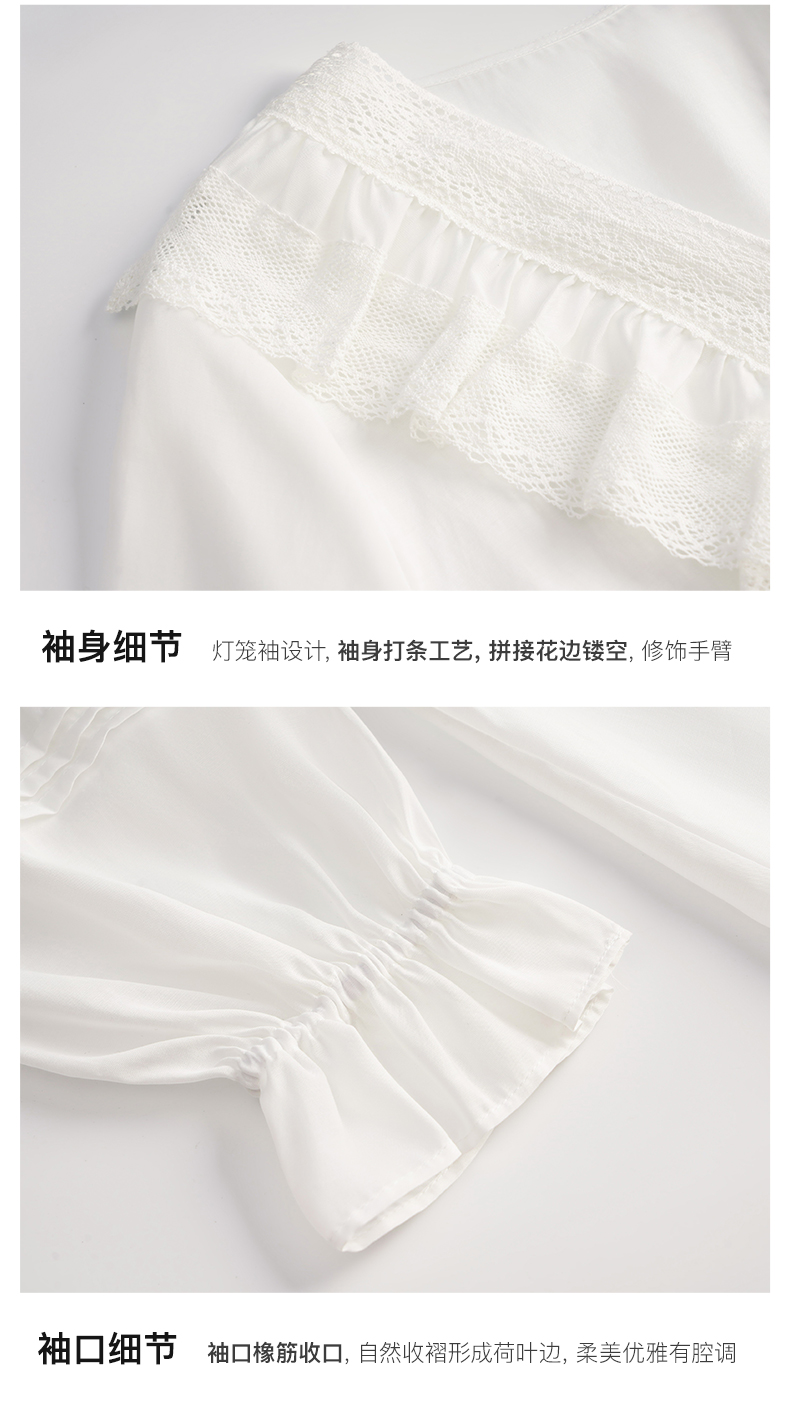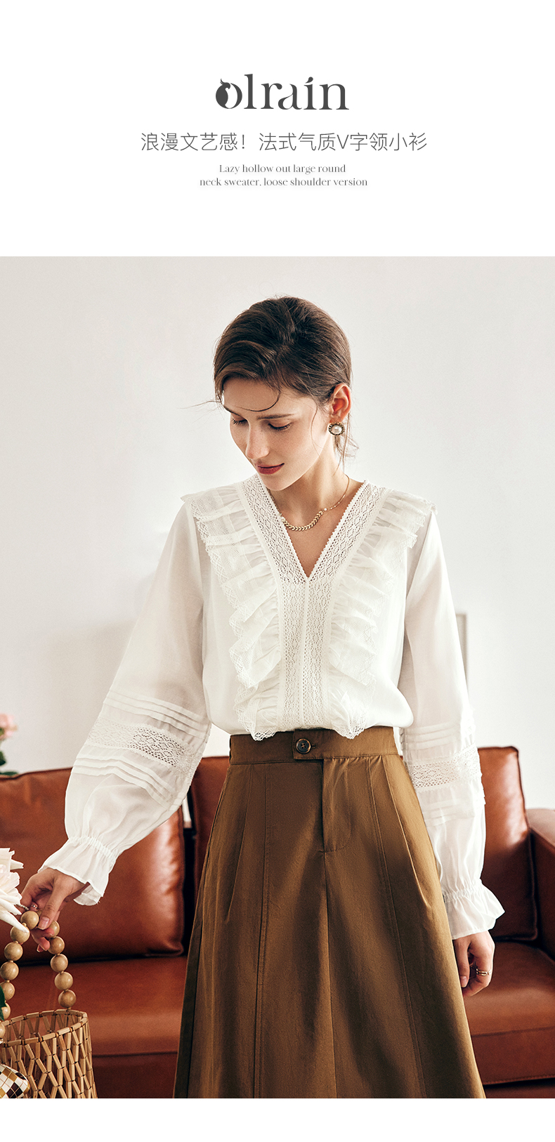 OLrain欧芮儿法式V领蕾丝雪纺衫女春季2023年新款灯笼袖甜美小衫