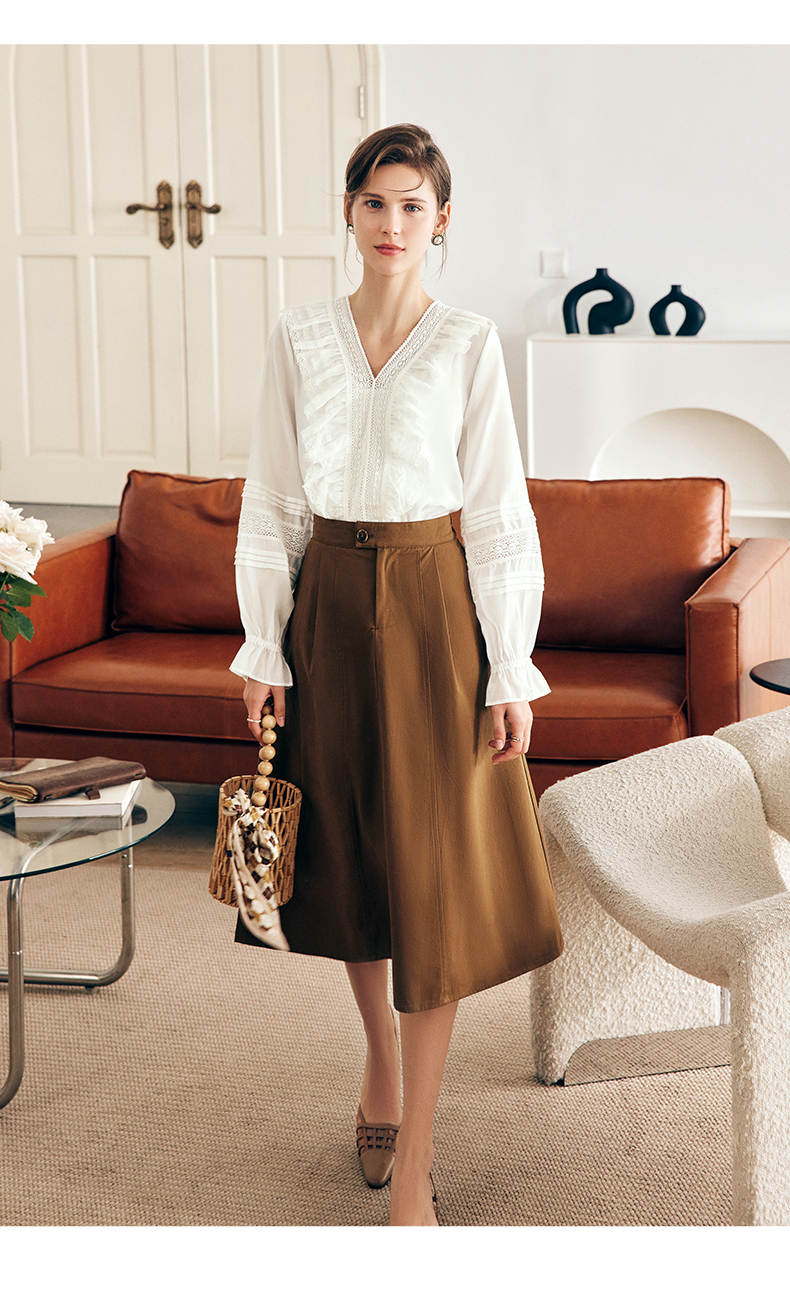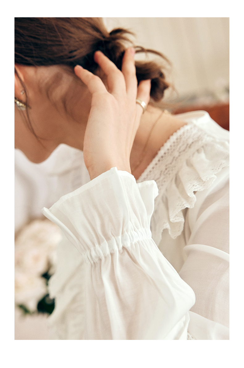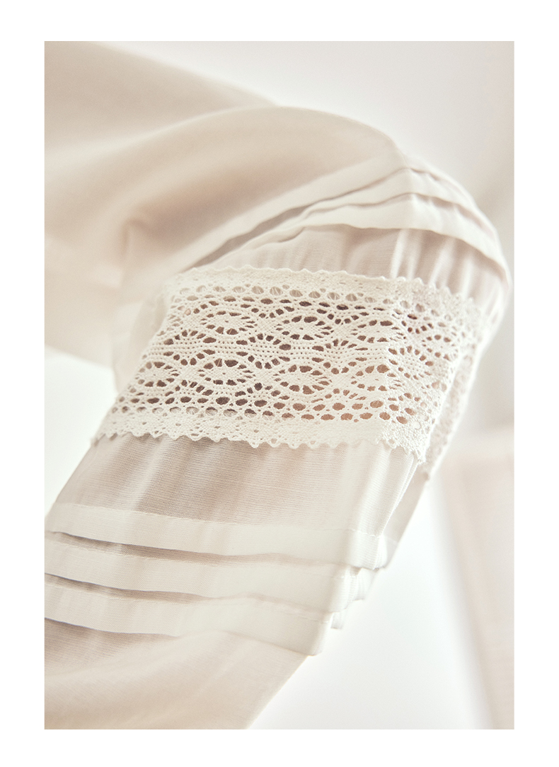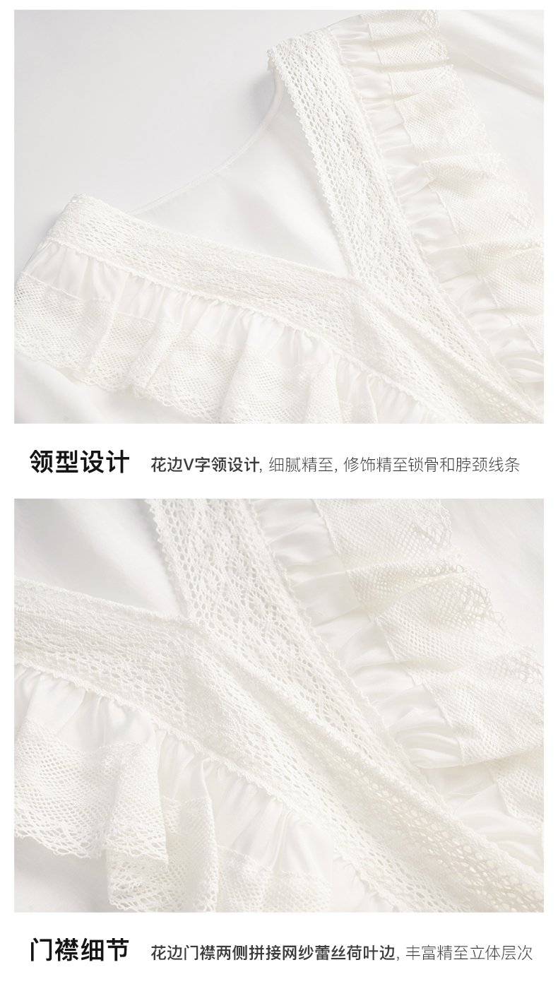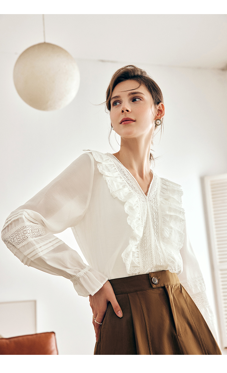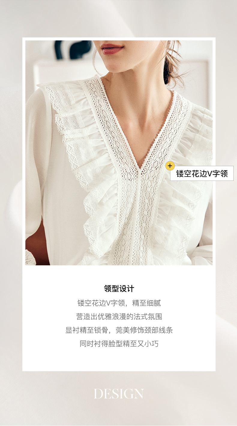 OLrain欧芮儿法式V领蕾丝雪纺衫女春季2023年新款灯笼袖甜美小衫