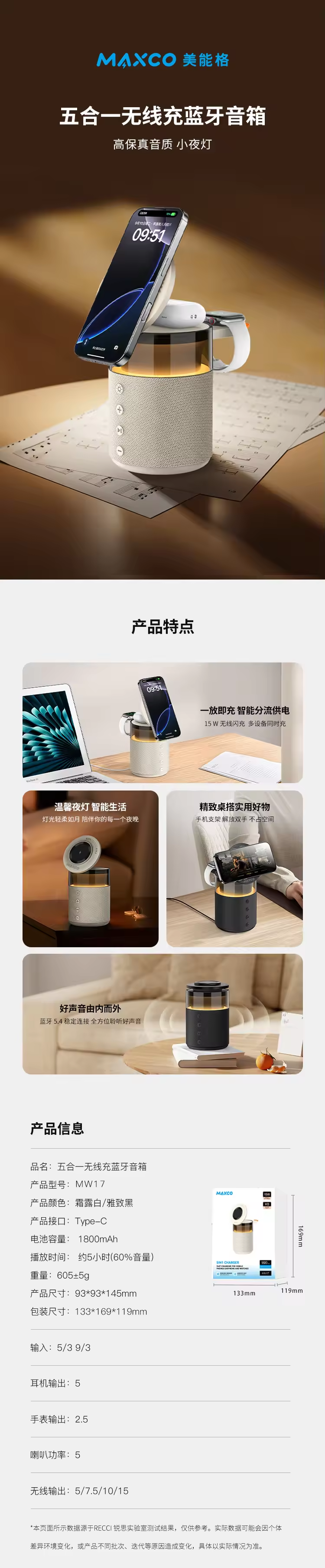 MAXCO美能格 MW17 五合一无线充蓝牙音箱