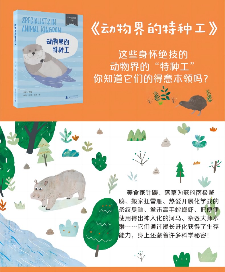 动物是人类优选的朋友——可是,你真的了解这些朋友吗?超级美食家针鼹、落草为寇的南极贼鸥、搬家狂雪雁、热爱开展化学战的条纹臭鼬、拳击高手螳螂虾、把便便使用得出神入化的河马、杂耍大师水獭……这些身怀绝技的动物界的“特种工”,你知道它们最得意的本领吗?研究动物的科学家作者们讲述了南极贼鸥、葬甲、针鼹、河马、螳螂虾等20余种特别的动物,它们通过漫长进化获得了非常特别的生存能力,身上还藏着许多科学秘密。