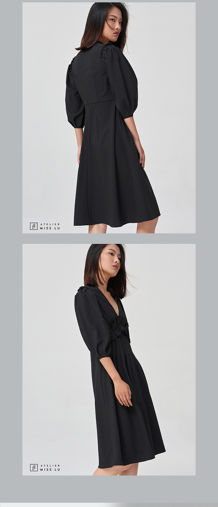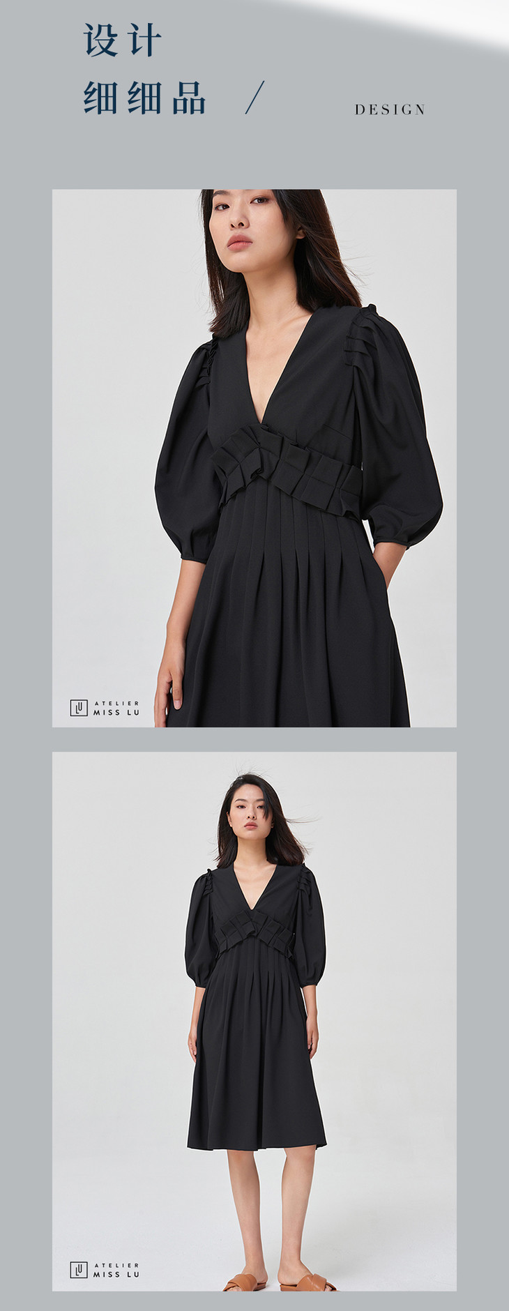 【宝藏ONE PIECE】黑色压褶V领设计感连衣裙
