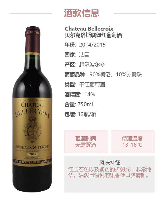 【整箱六瓶】贝尔克洛斯城堡红葡萄酒 Chateau Bellecroix 750ml*6