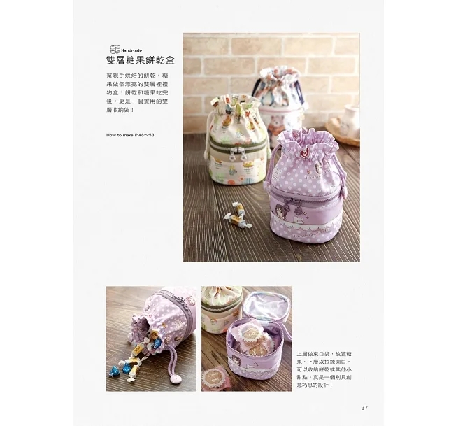 為此在《簡單玩布fun手作3》一書中,特別以「禮物」為主題,邀請了Jing Chen(靖)、Pauline Zhang、林舒涵(如比)、陳加薪、黃珊、廖珮伶以及蘇敏貴等七位布作達人,為大家精心設計符合各種場節日、喜慶需求的手作禮,例如新生的祝福、新生入學禮、好朋友交換禮、孝親謝師感恩禮、珍重再見紀念禮、浪漫婚禮小物、禮物的包裝袋等。全書共21款77件作品,每件作品都有詳細的示範教學,以及原寸不重疊紙型,縫紉新手也能輕鬆上手!現在就讓我們一起跟著達人做包送禮去!