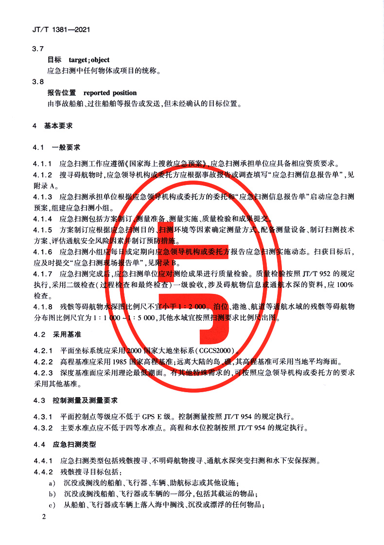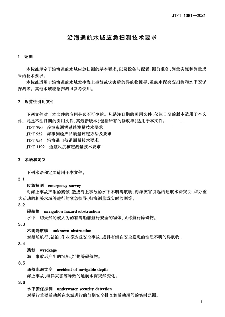 沿海通航水域应急扫测技术要求(JT/T 1381—2021)