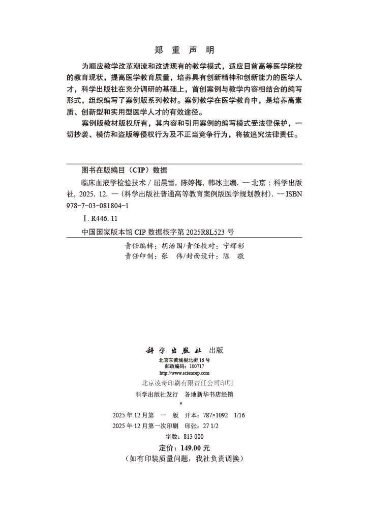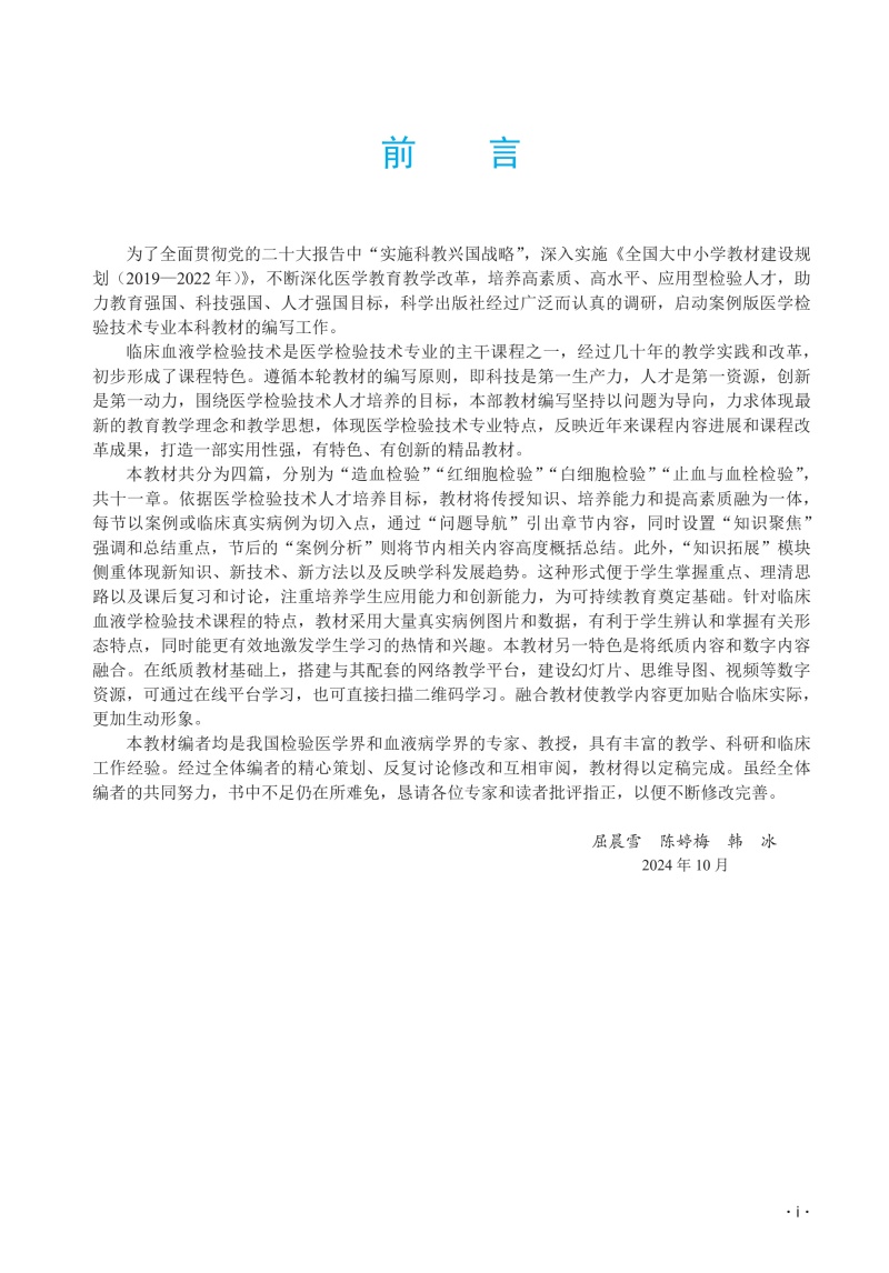 临床血液学检验技术(案例版)普通高等教育案例版医学规划教材 屈晨雪 陈婷梅 韩冰 主编 供医学检验技术等专业使用 科学出版社